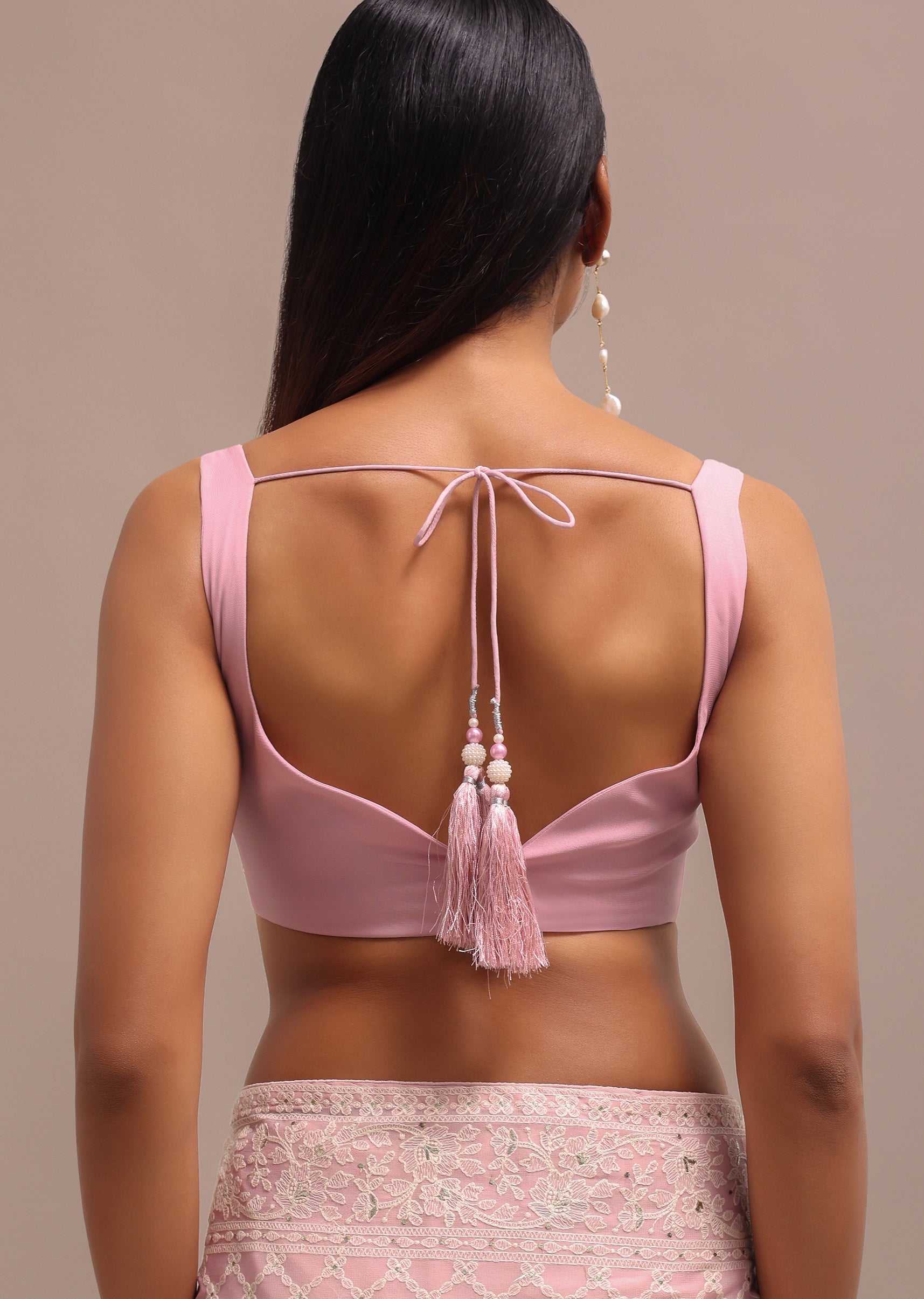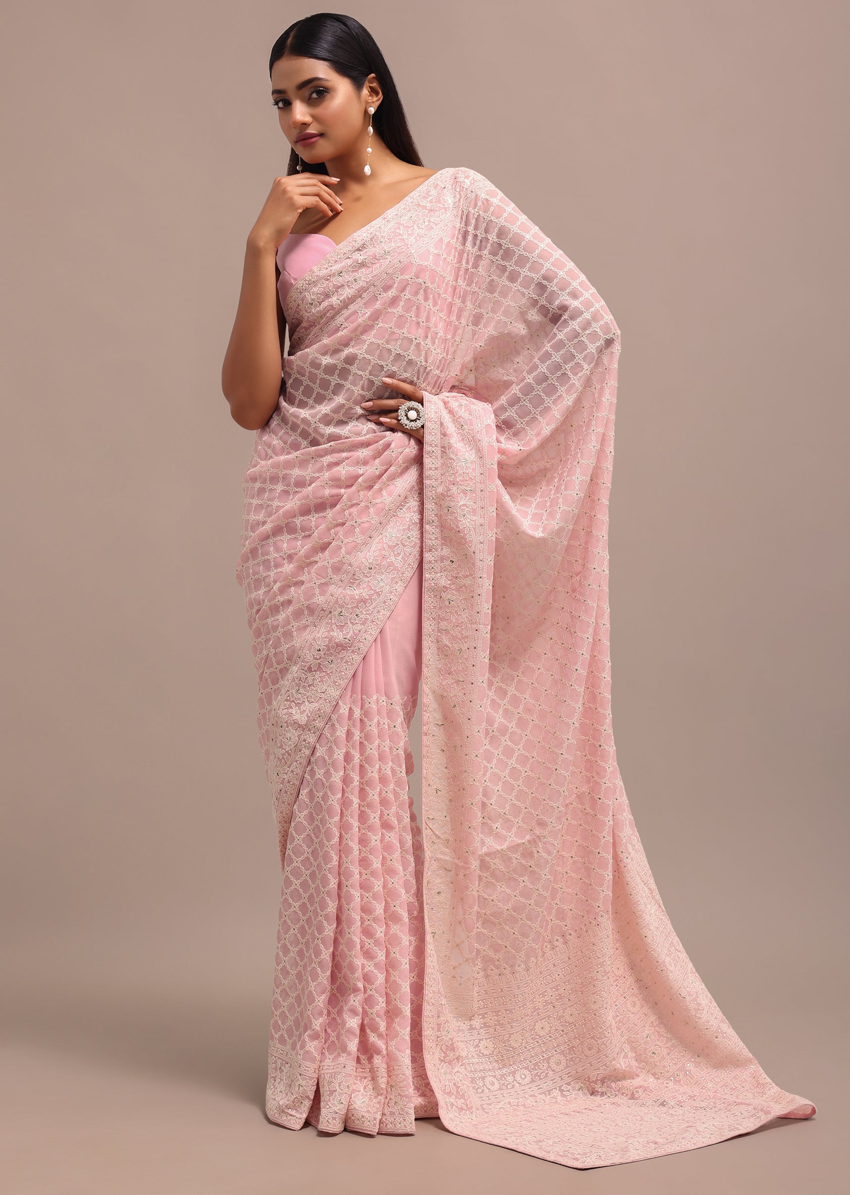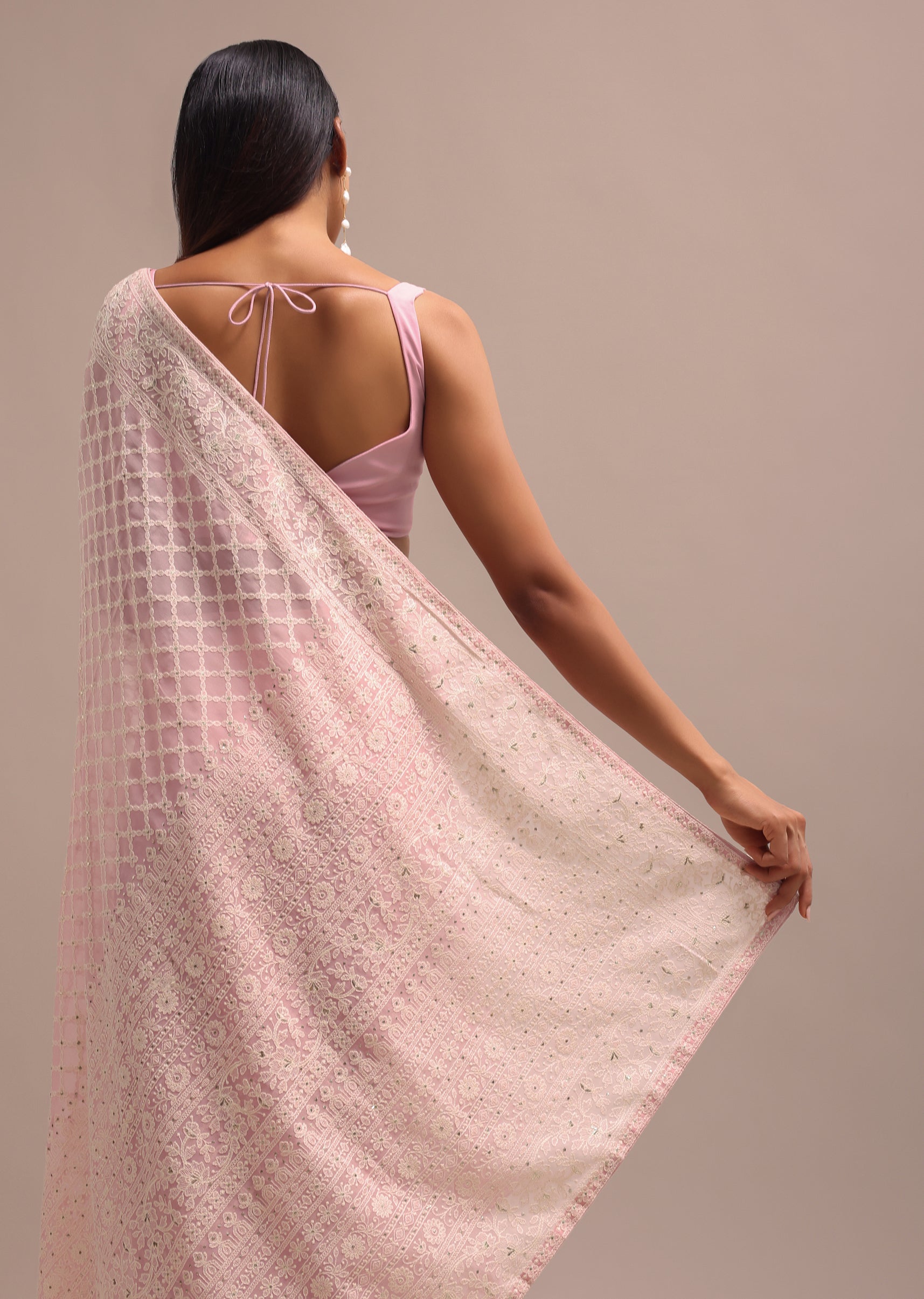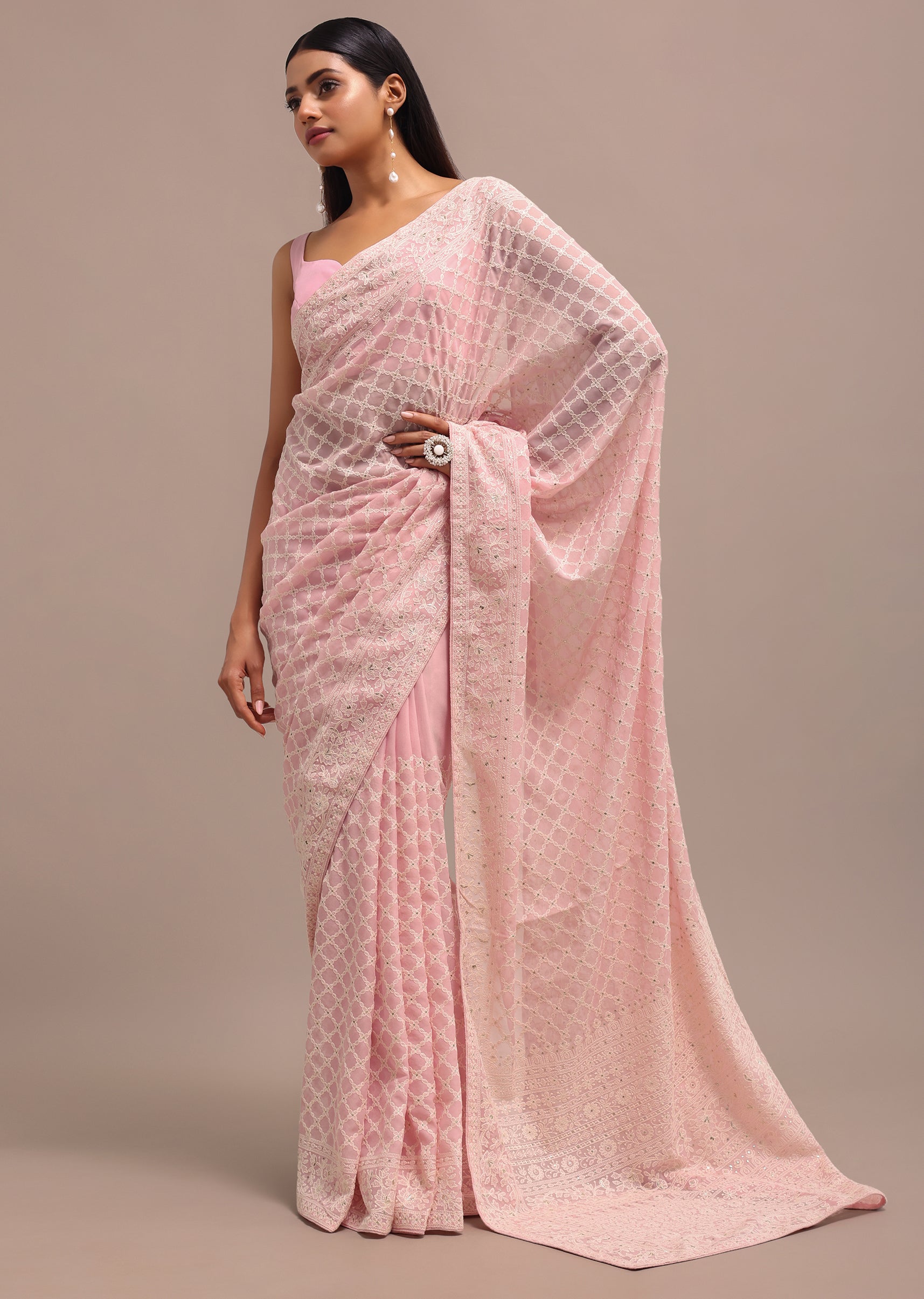 Light Pink Georgette Chikankari Jaal Work Saree With Unstitched Blouse