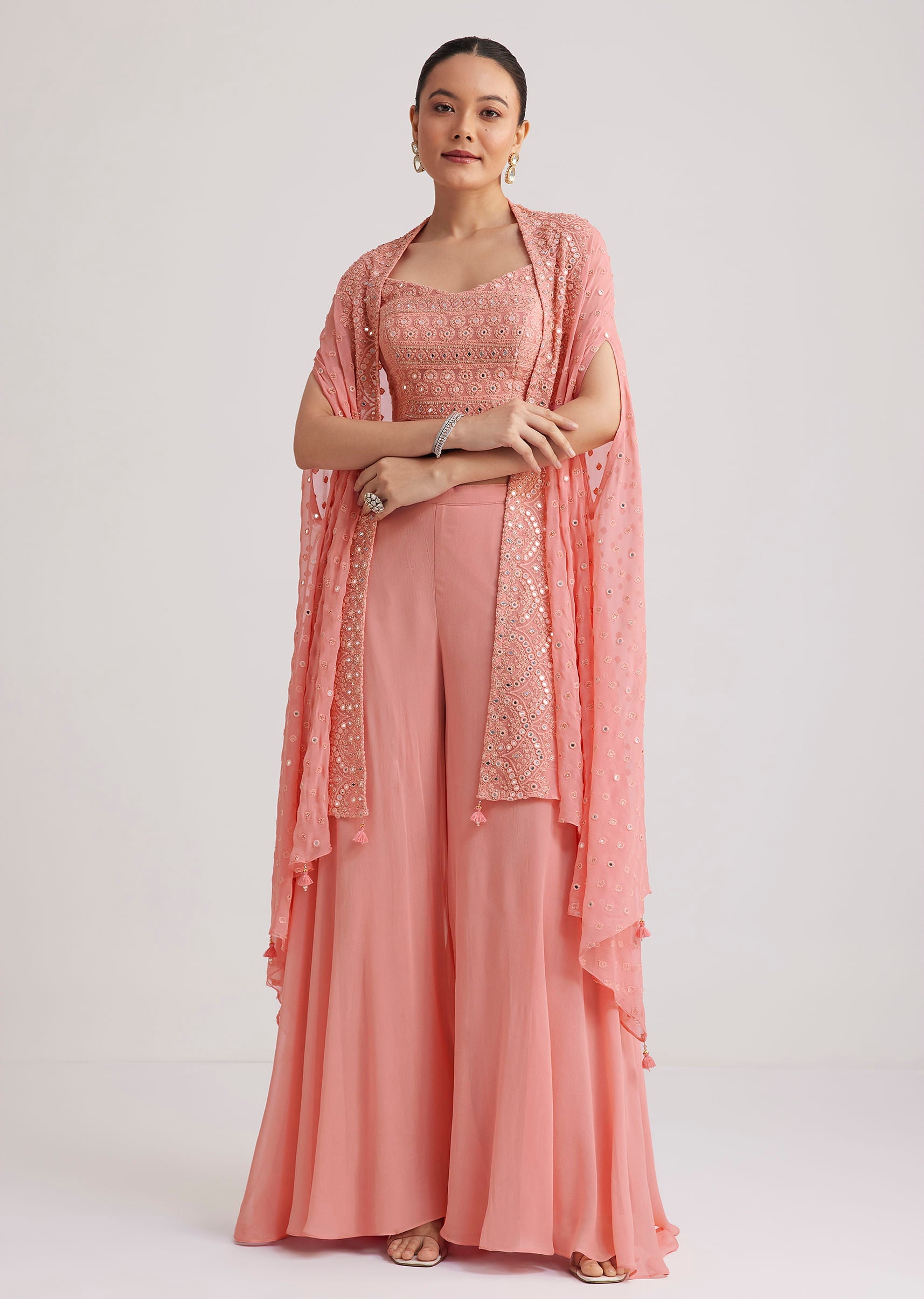 Add A Soft And Graceful Touch To Your Wardrobe With This Light Pink Georgette Palazzo Set Featuring An Exquisitely Embroidered Cape. Detailed With Intricate Thread Work Mirror Accents Beads And... More Product Details