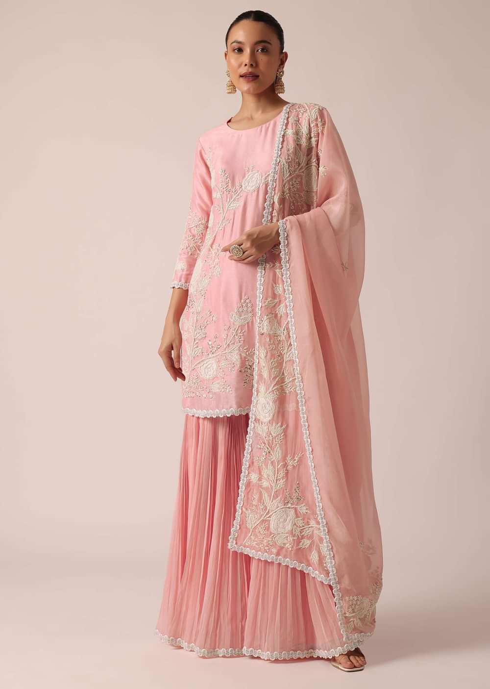 Light Pink Kurta Sharara Set In Chanderi Silk