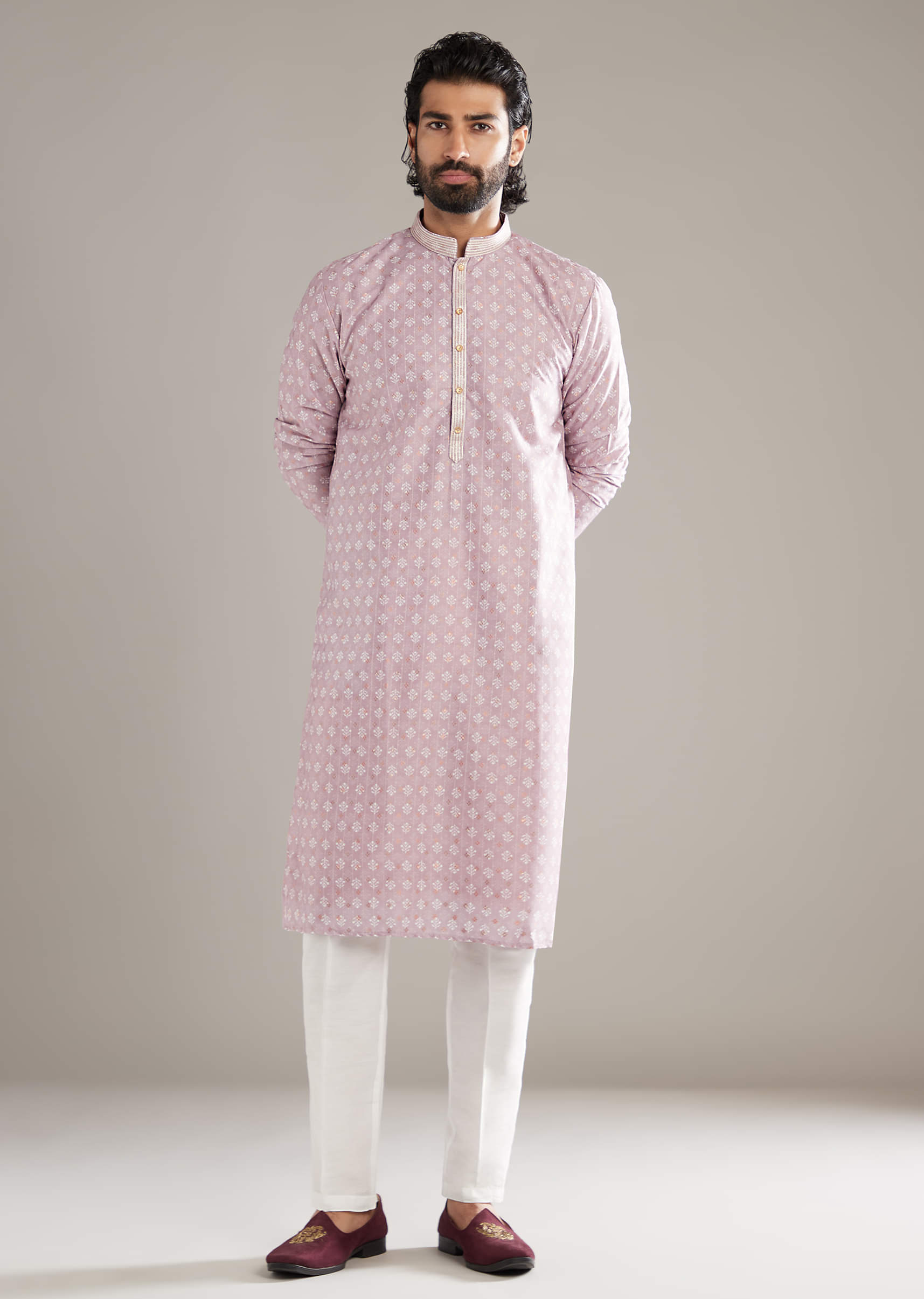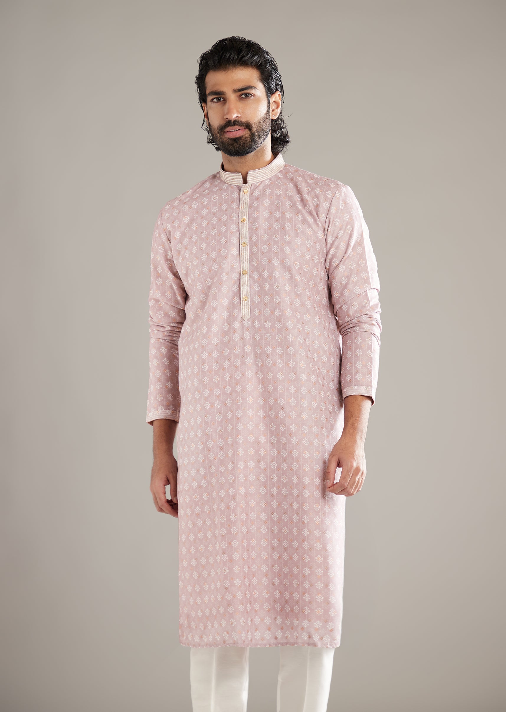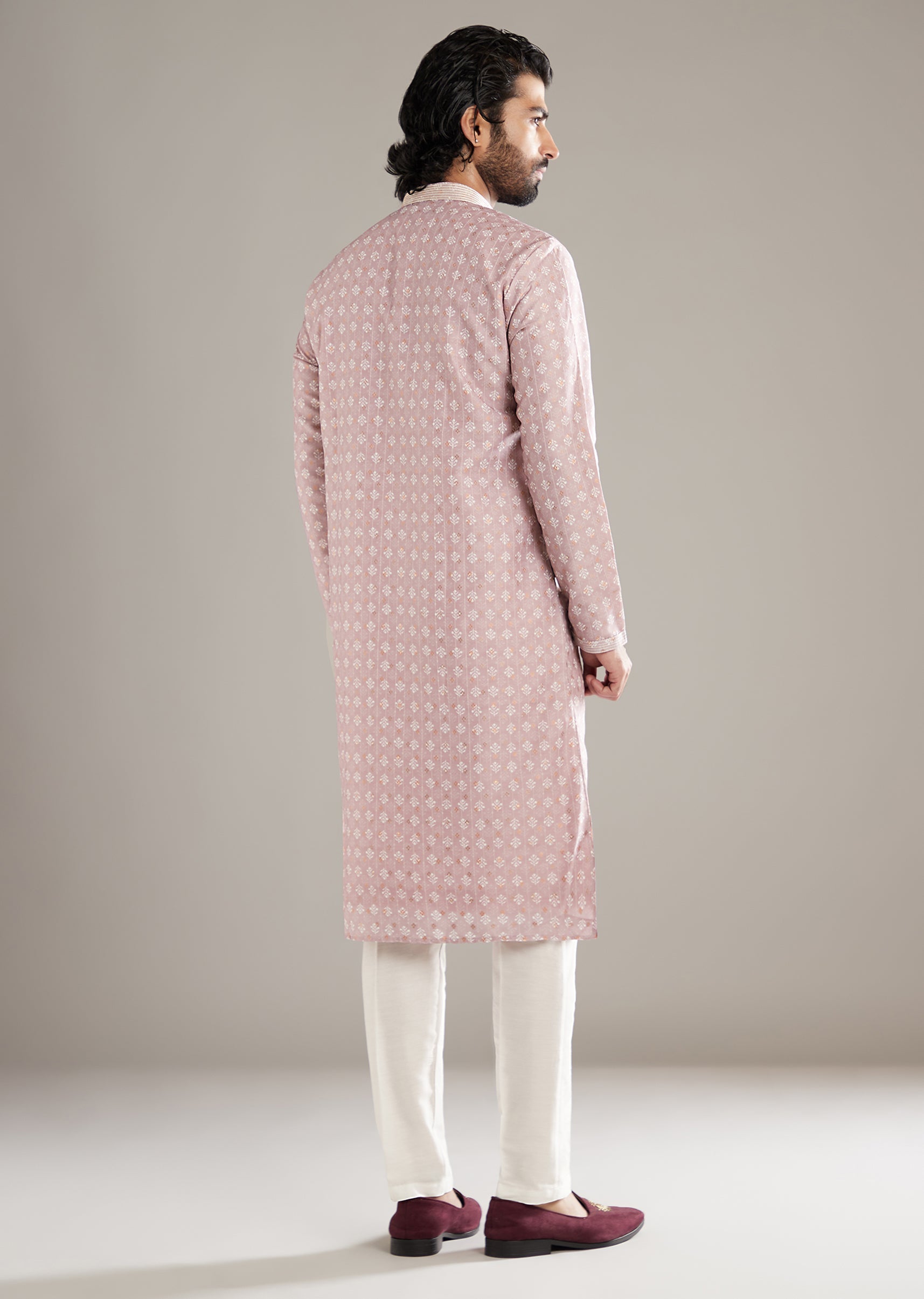 A soft lift comes through as this light pink art silk men’s kurta set lays floral motifs all over a tidy silhouette. The sheen is subtle, letting the print do... More Product Details