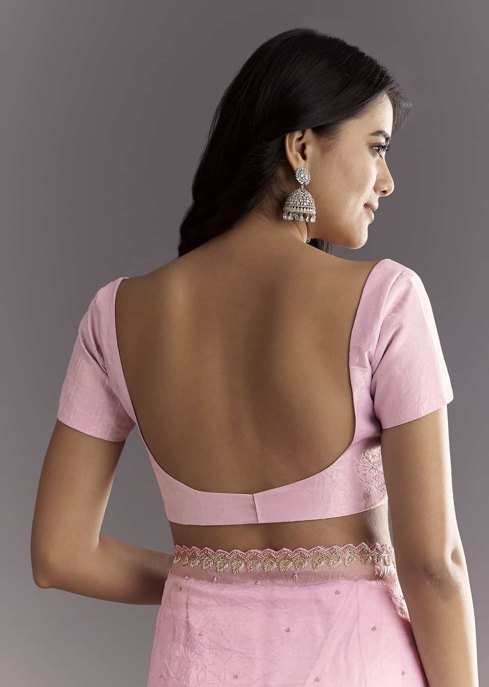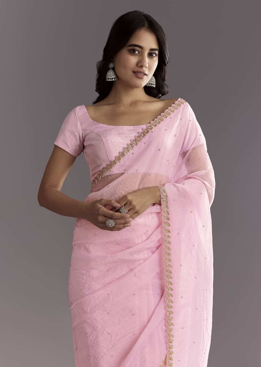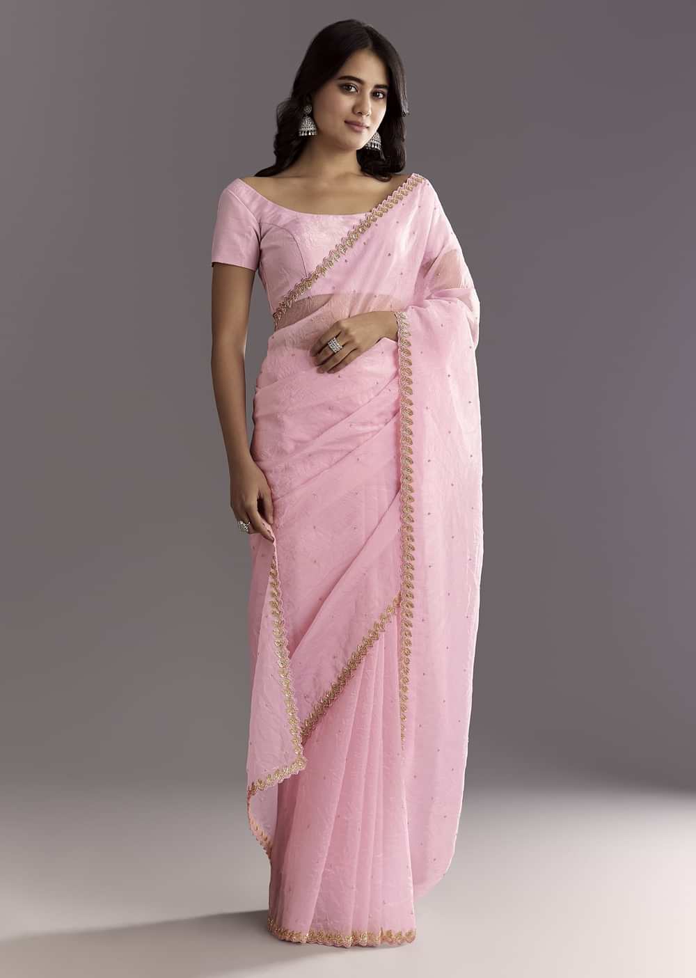 A soft blush from a fairytale garden, this light pink tissue saree features a delicate cutwork scallop border, and embroidery in cutdana and beads—subtle, romantic, and radiant. Awarded as the Most Trusted Brand, we're delivering styles you love, just as promised.