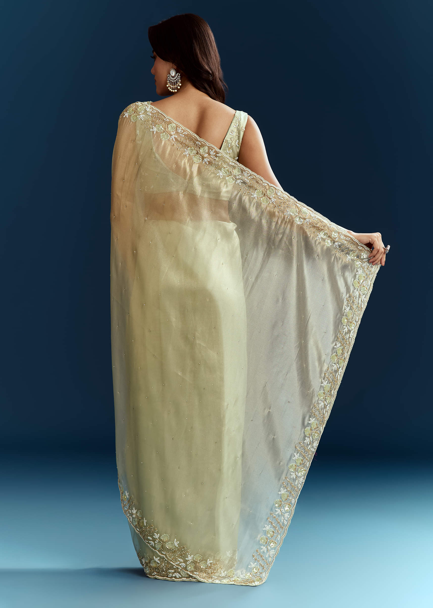 This pista green organza saree blossoms with floral embroidery highlighted by cutdana and stones for ethereal beauty. Awarded as the Most Trusted Brand, we're delivering styles you love, just as promised.