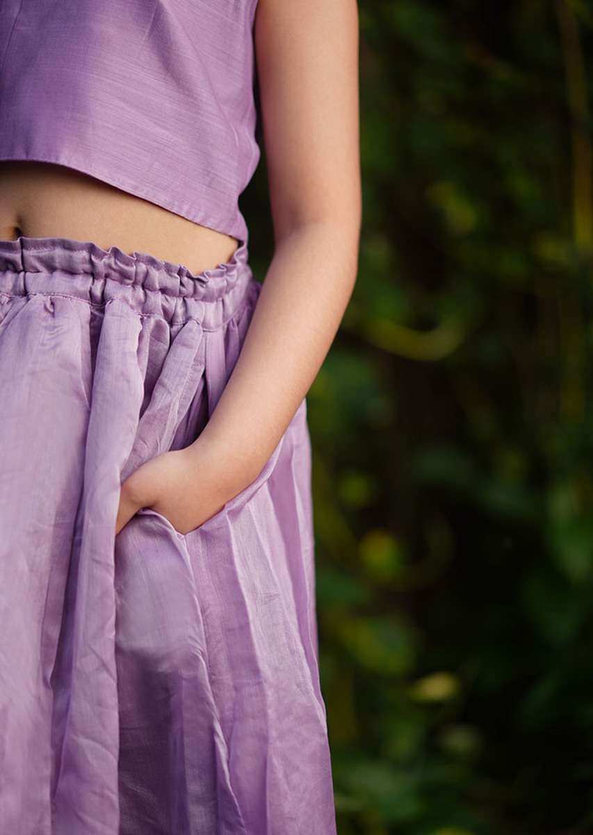 A light purple skirt and crop top set that is comfortable, versatile, elegant and absolutely festive.Our bestseller and classic LTWT style - the tie back blouse this time with a revamped skirt. Every collection we try to better our designs. The skirt is completely elasticated at the waist so you can use these gorgeous outfits for long. The subtle yellow zari selvedge plays a beautiful peek a boo at the bottom along with hints of an olive green tie ups on the blouse.This blouse can also be worn like a jacket and then wrapped around and tied. We urge you to use the pieces as separates and give them a longer life instead of waiting for an occasion to come and go. Pair the skirt with a white tee and let these outfits live, breathe and make memories with your little ones.Made with cotton silk hand-woven in Maheshwar, Madhya Pradesh and completely lined with pre-washed 100% cottonLoose fit blouse with tie upSoft elasticated waist.There’s a pocket detailing on the lehenga to ensure there’s some place to hide all the floral treasures.Size Guide - The girl in the image is 8.5 years old and is wearing size X-Large. Awarded As The Most Trusted Brand We'Re Delivering Styles You Love Just As Promised.