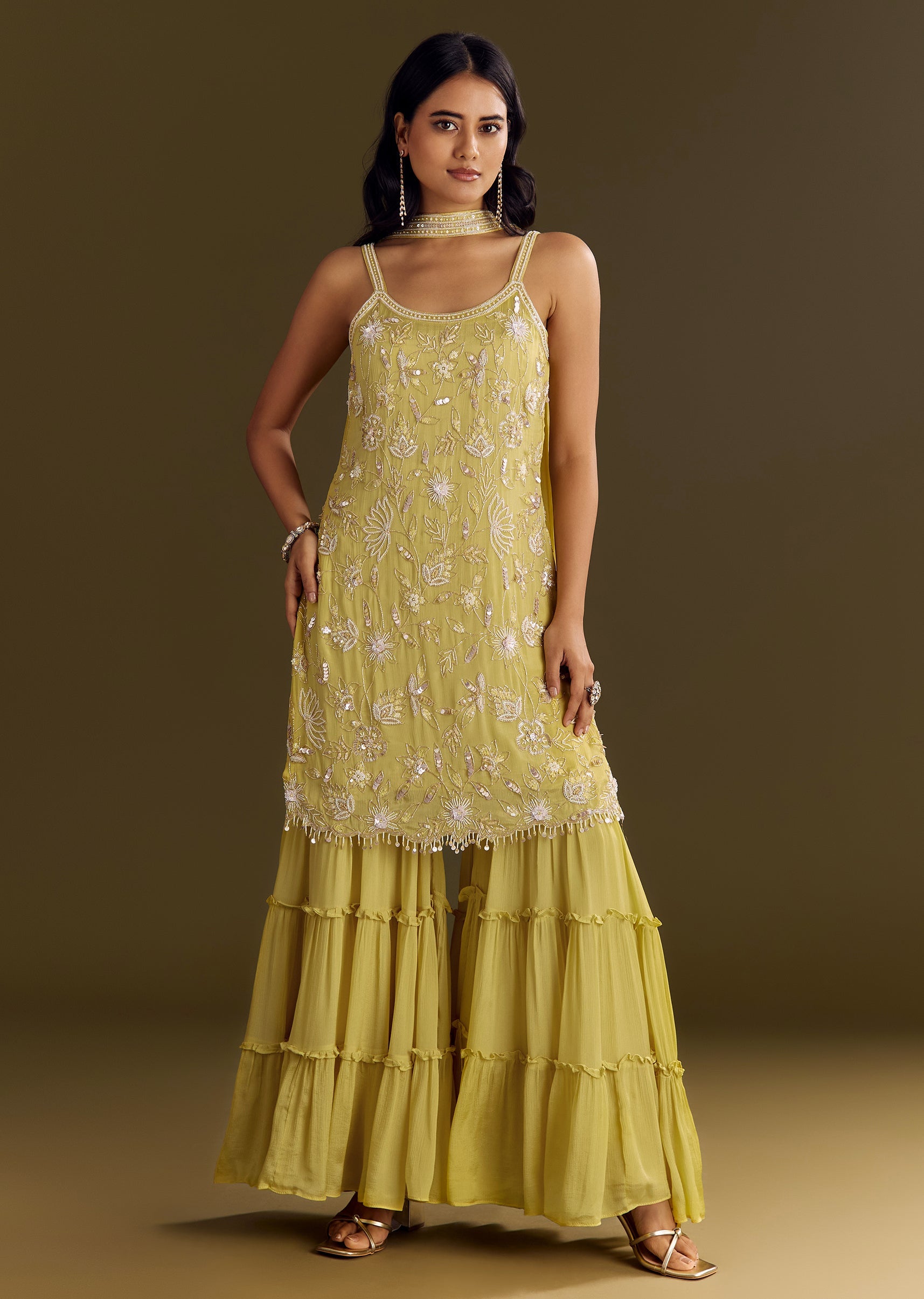 This light yellow kurta set brings sunshine to mehendi celebrations, styled with a choker dupatta embroidered with sequins and cut dana. Standard length of Sharara is 40" Awarded as the... More Product Details