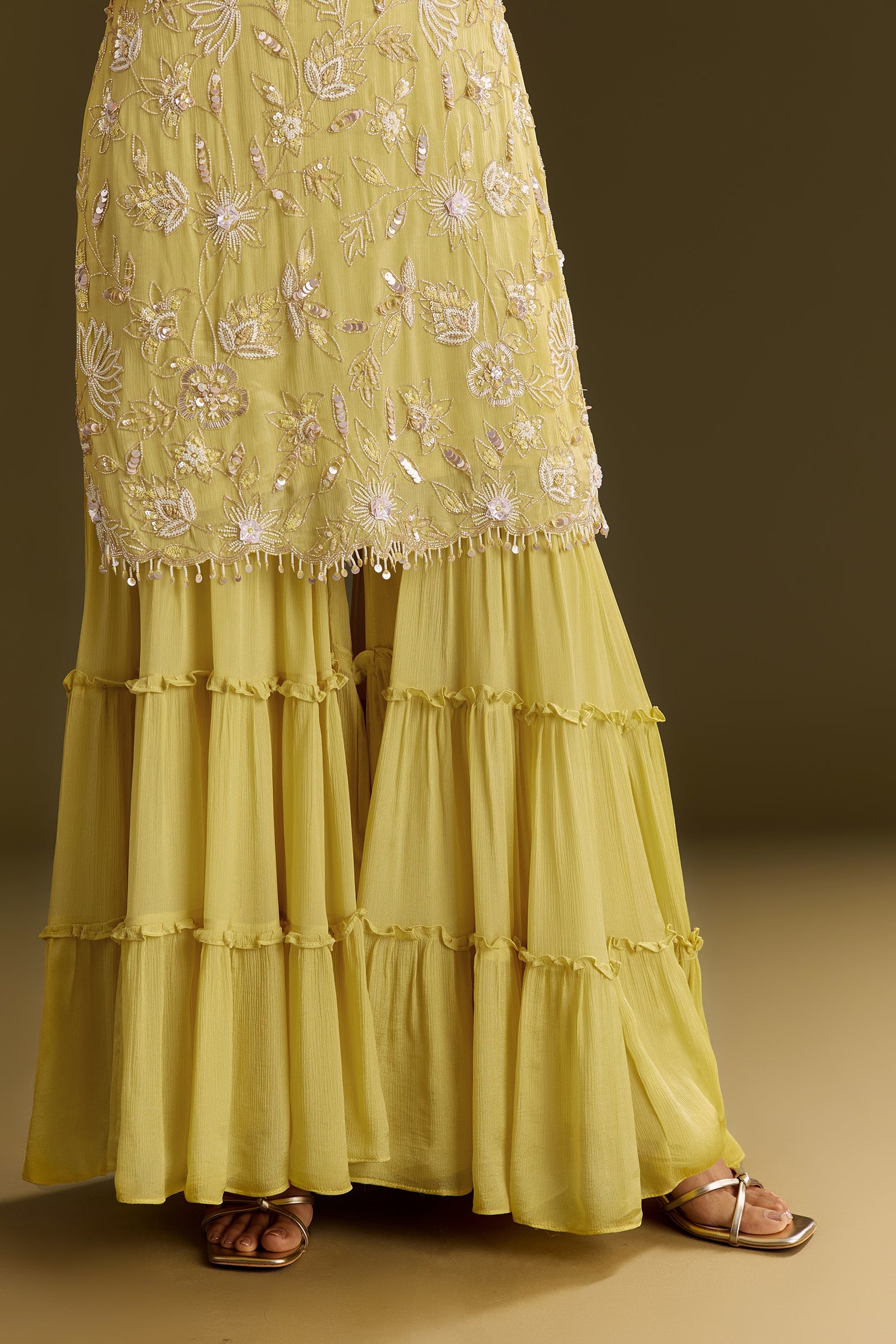 Light Yellow Chinon Embroidered Kurta Sharara With Choker Style Dupatta