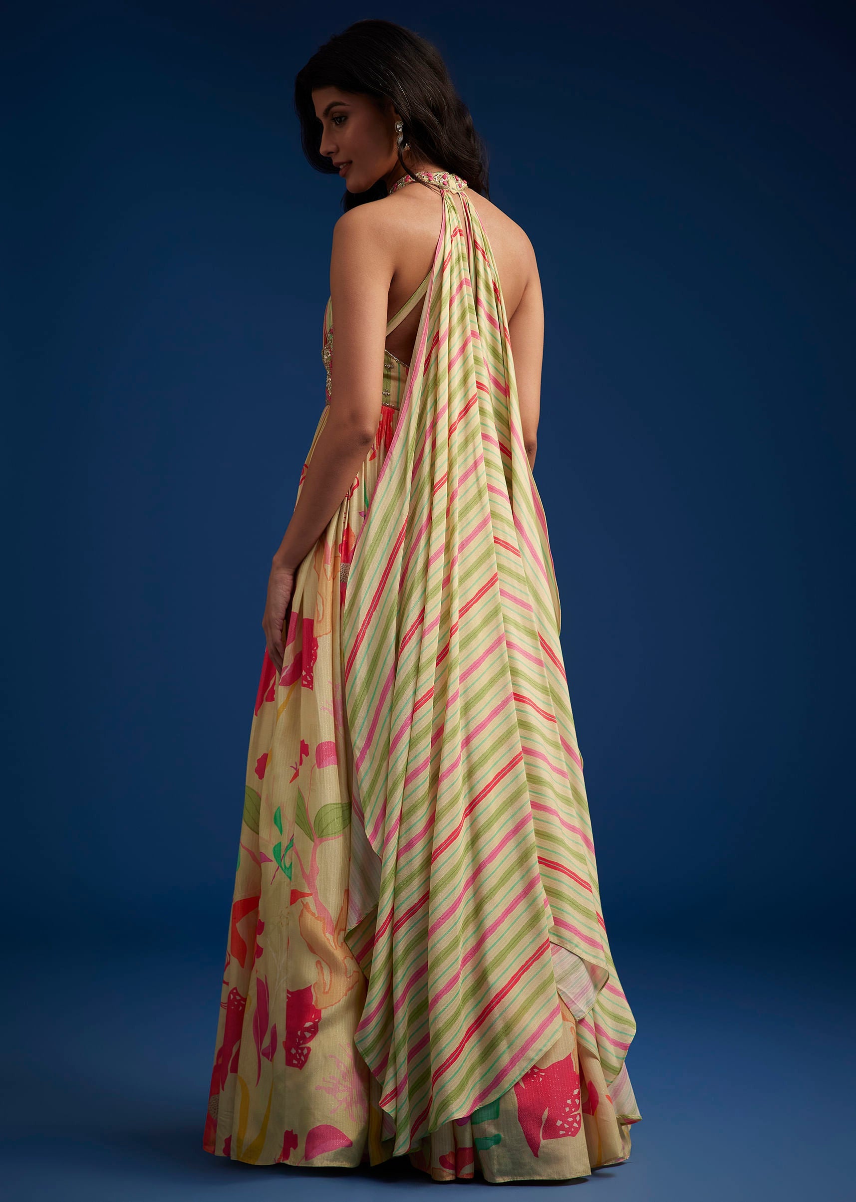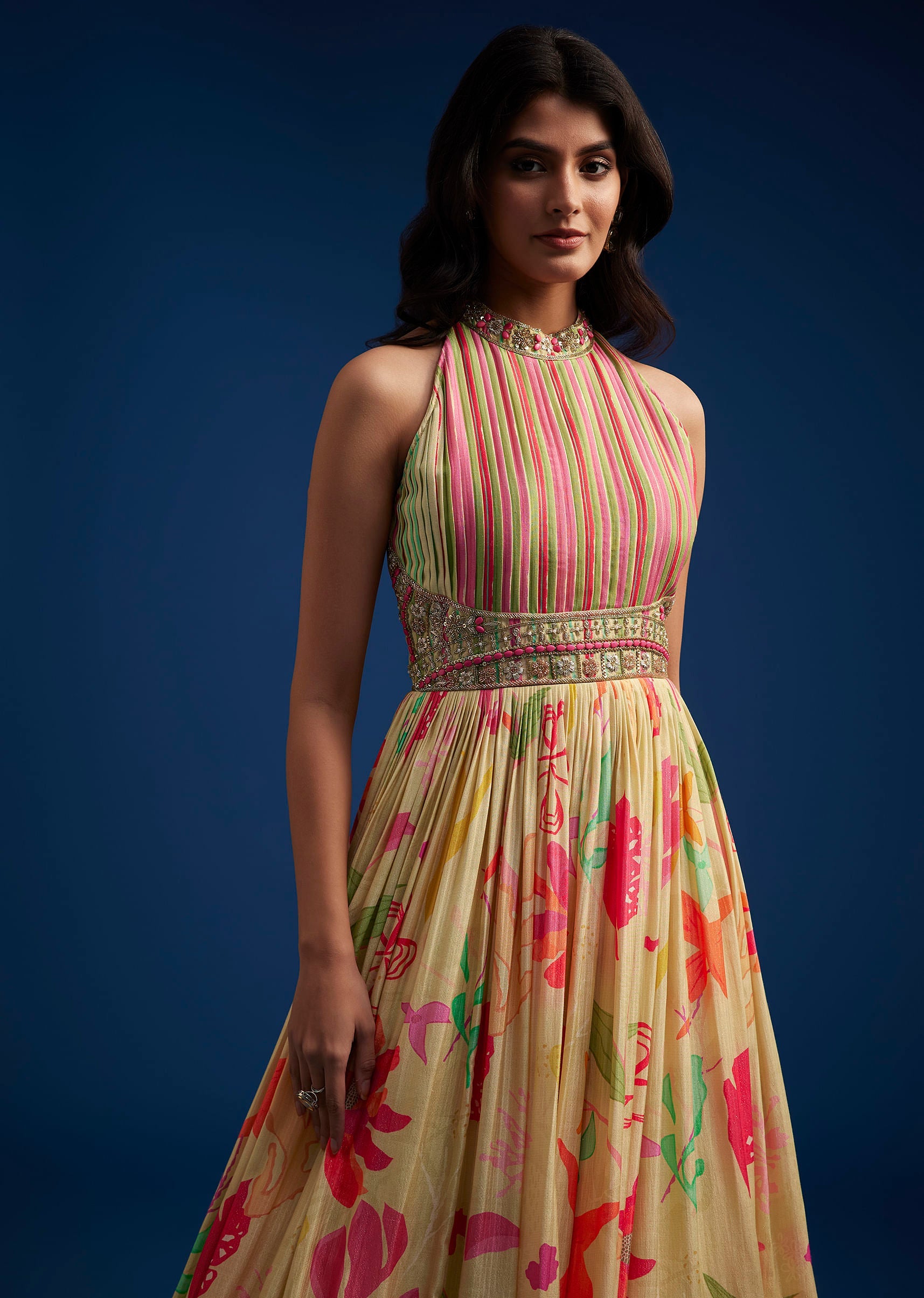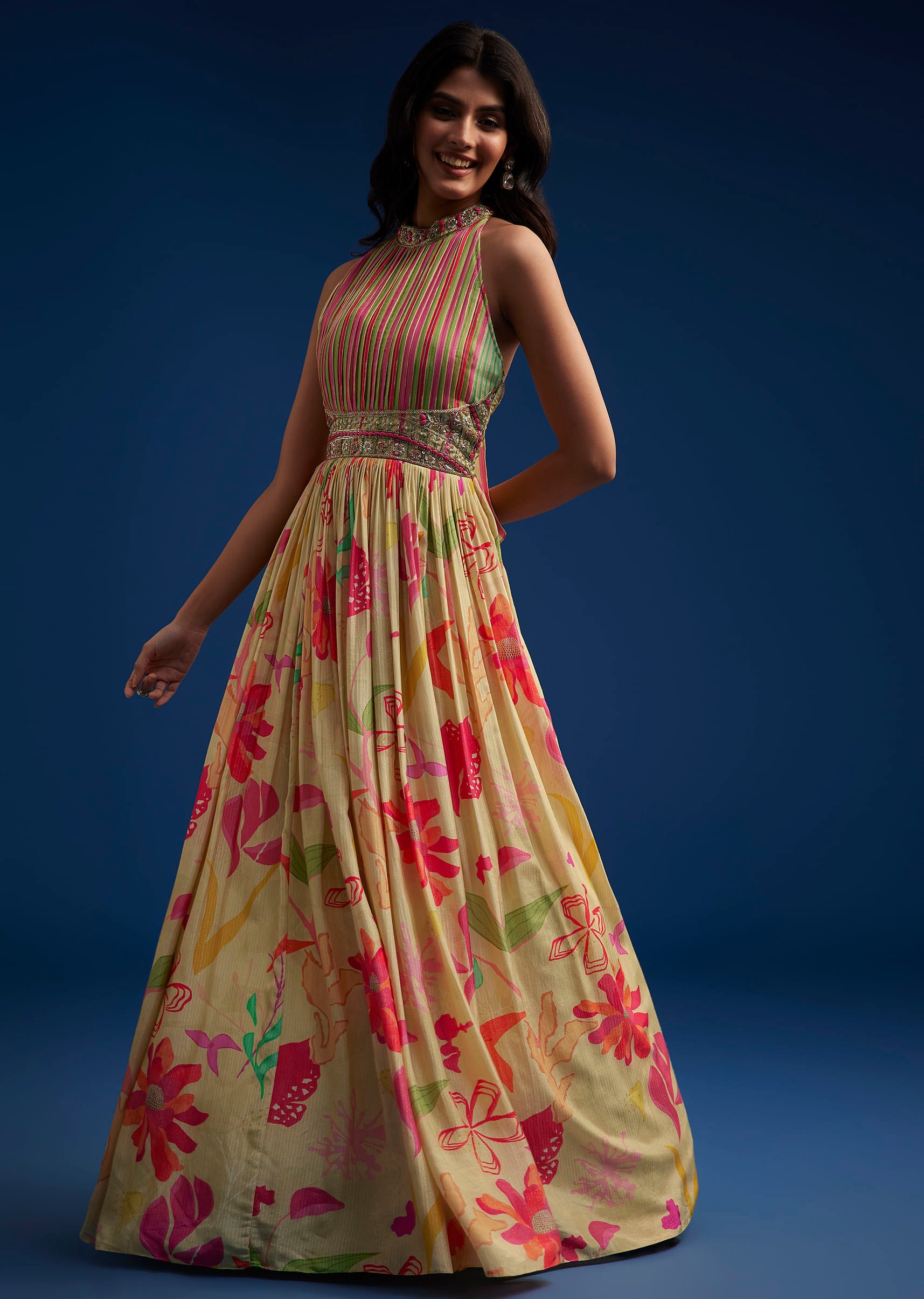 - Make a statement with this light yellow viscose gown adorned with vibrant floral prints and exquisite embellishments.