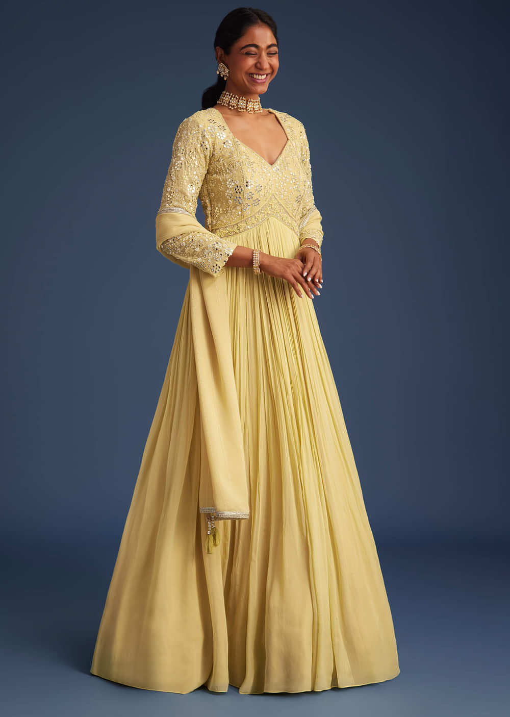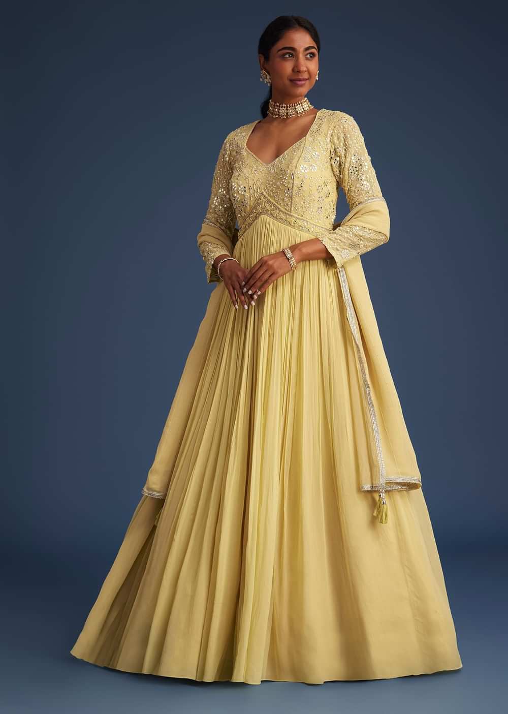• Embrace Timeless Grace With This Light Yellow Georgette Anarkali Set Featuring Exquisite Mirror Sequins Beads Cut Dana And Stone Embellishments.