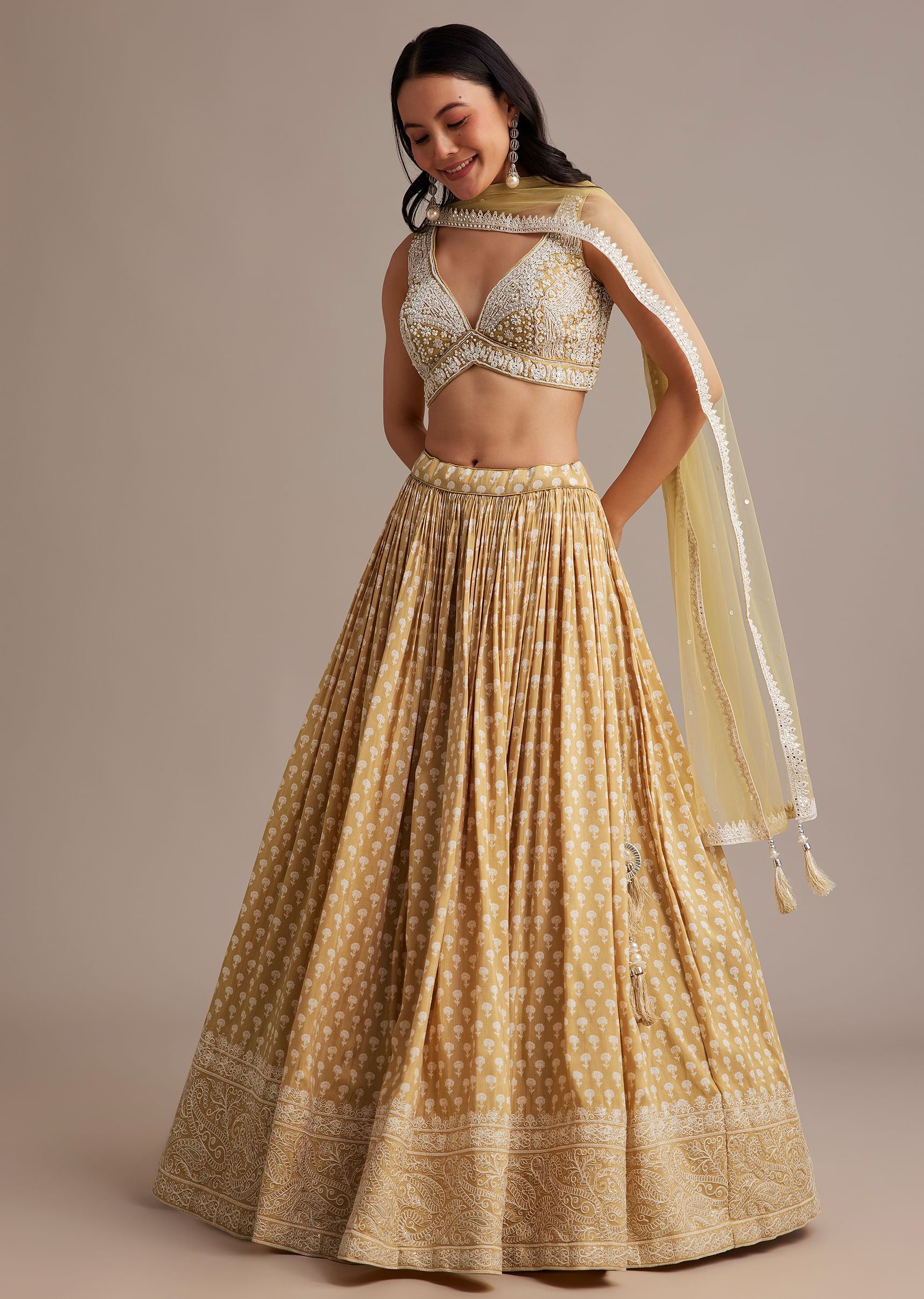 Light Yellow Printed Lehenga Set With Mirror And Moti Work