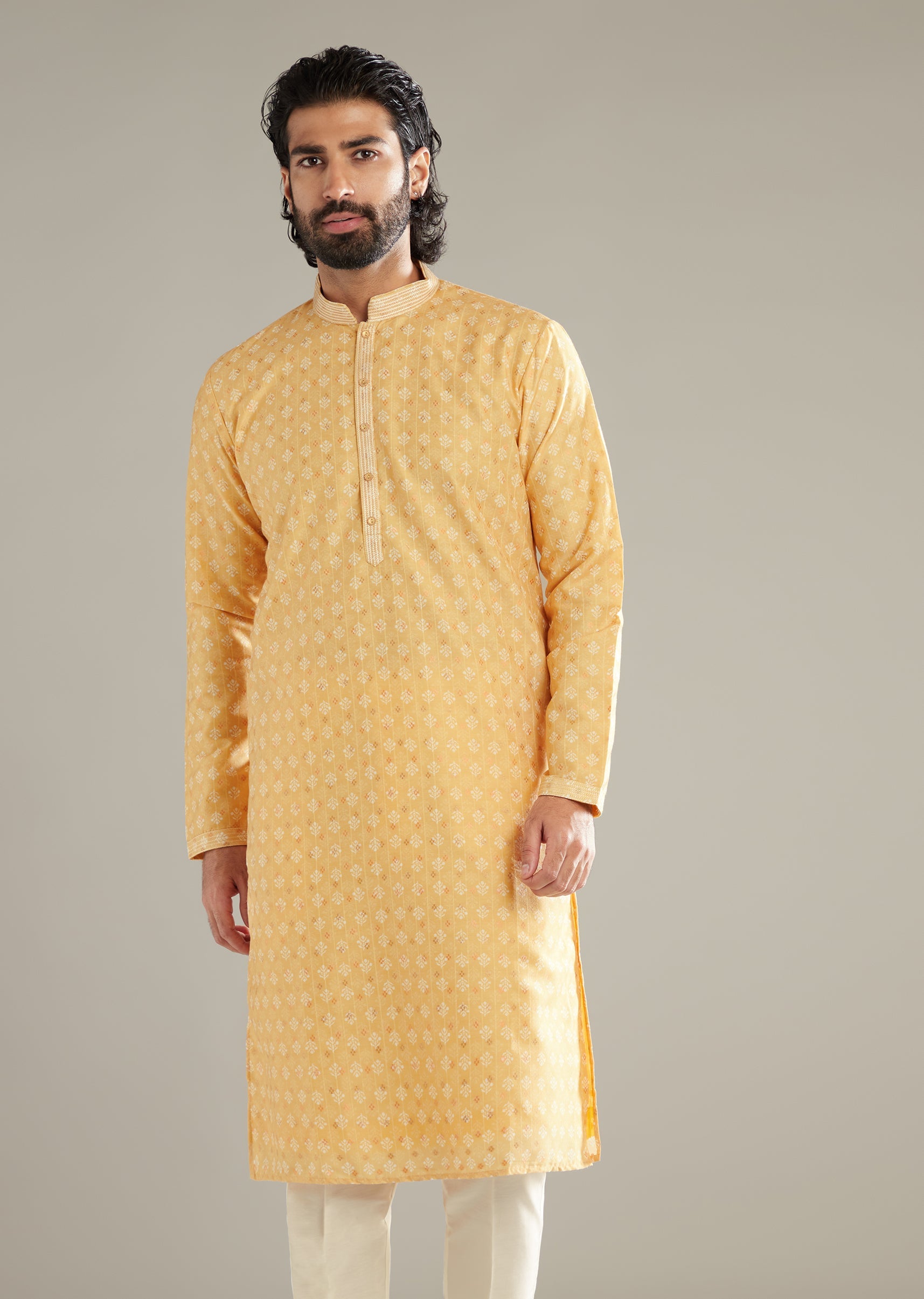 Sunlit and easy to wear, this light yellow art silk men’s kurta set runs printed motifs across the surface for a bright, upbeat read. The colour stays clear in daylight... More Product Details