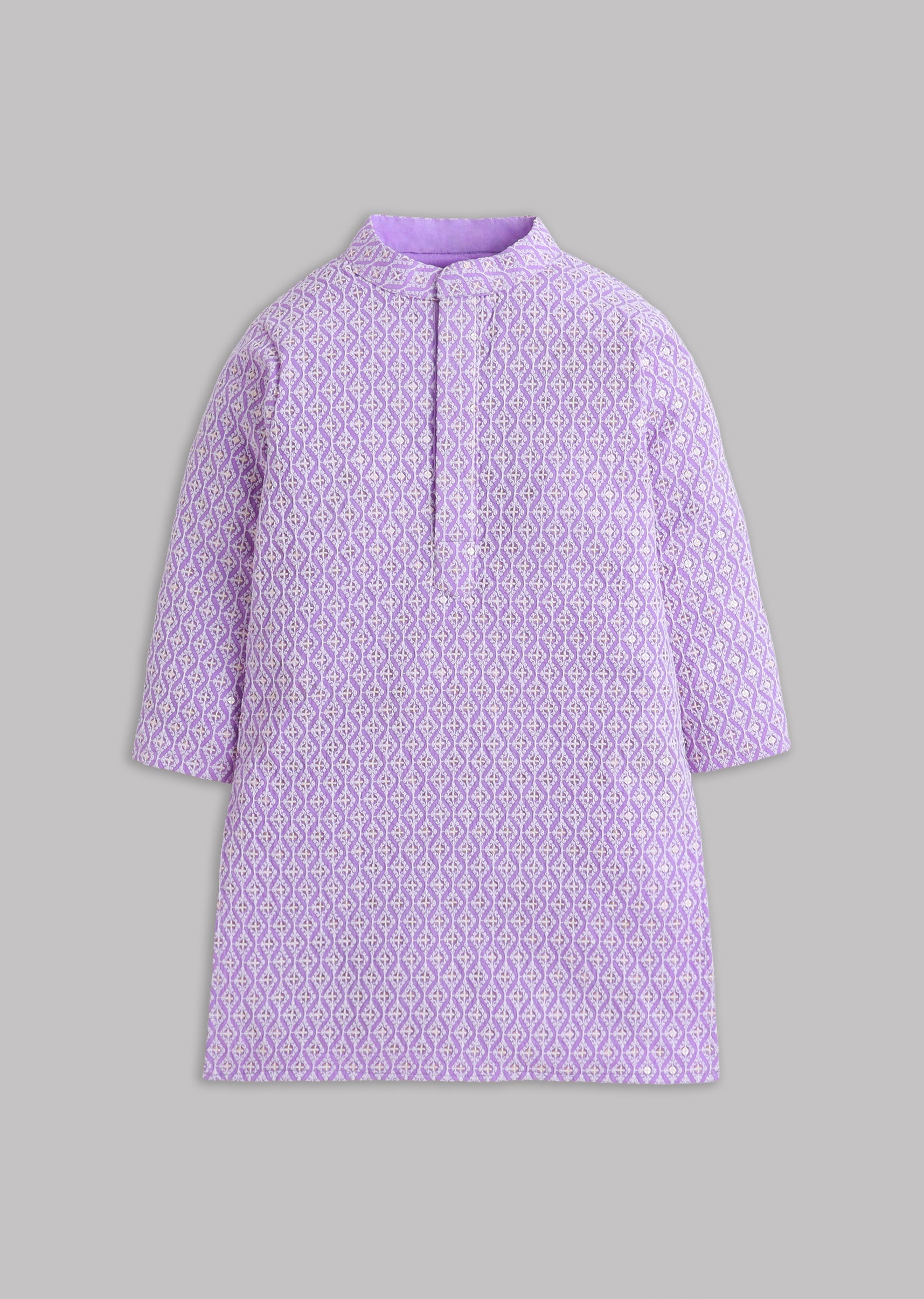 A lilac festive kurta set in cotton featuring sequin and thread embroidery, paired with comfort-fit cotton lycra pants. Finished with a mandarin collar and full sleeves—easy to dress up while staying comfortable. Awarded as the Most Trusted Brand, we're delivering styles you love, just as promised.