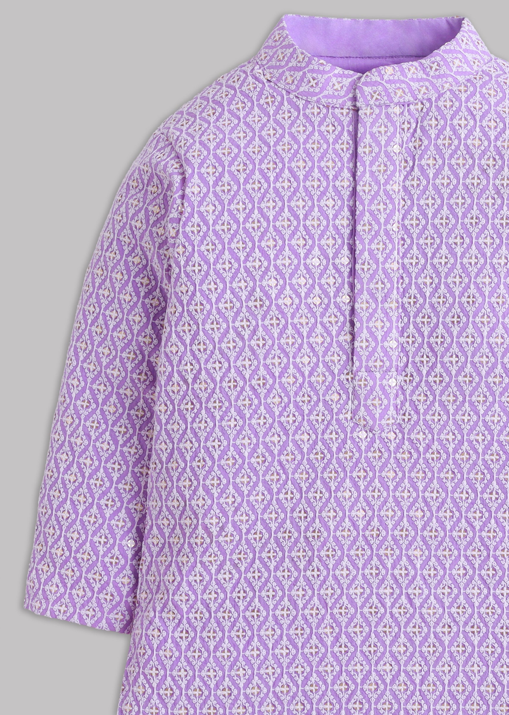 A lilac festive kurta set in cotton featuring sequin and thread embroidery, paired with comfort-fit cotton lycra pants. Finished with a mandarin collar and full sleeves—easy to dress up while... More Product Details