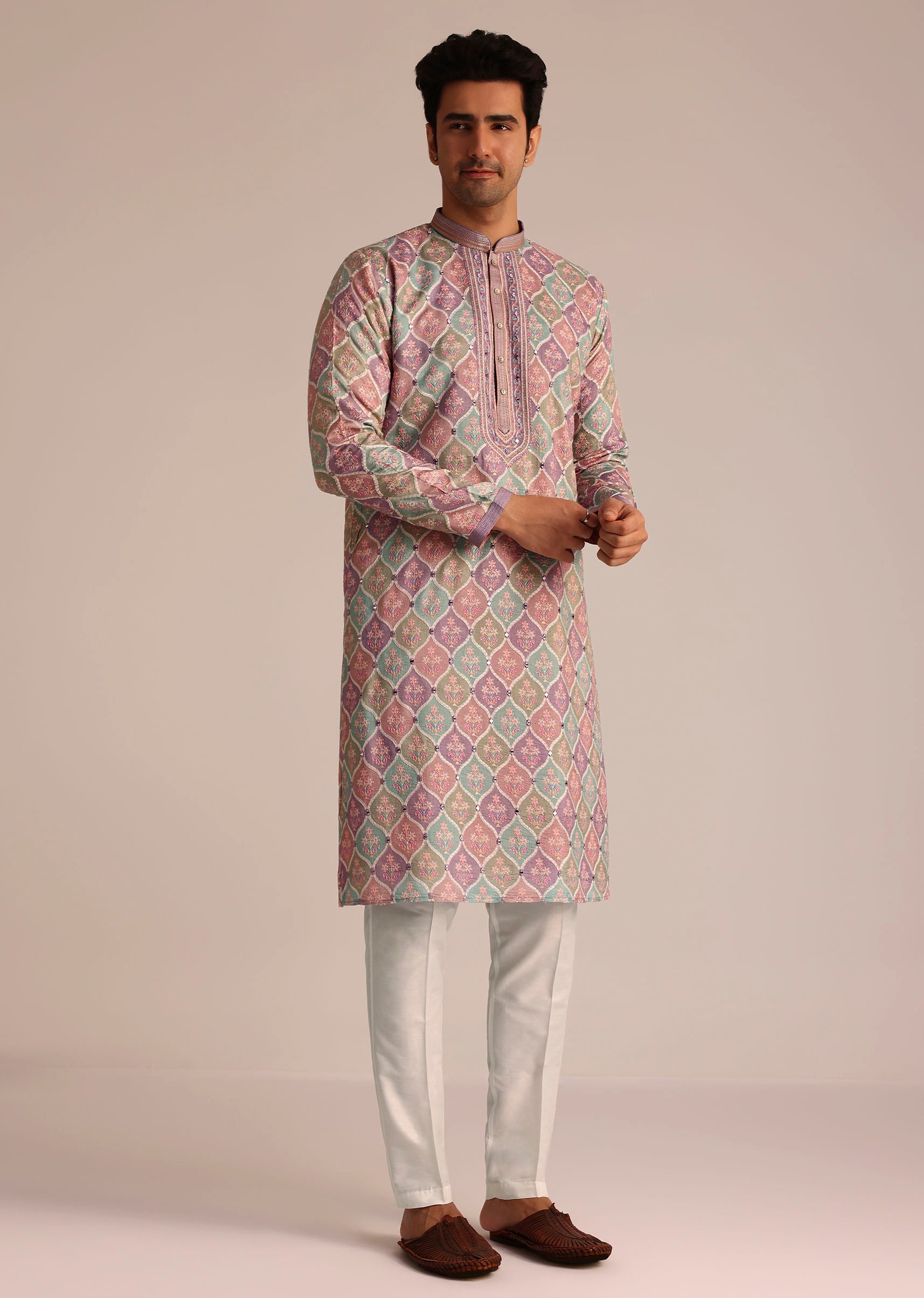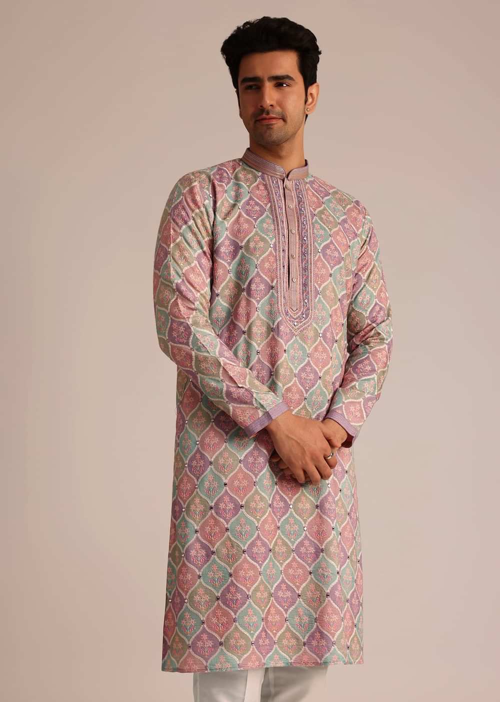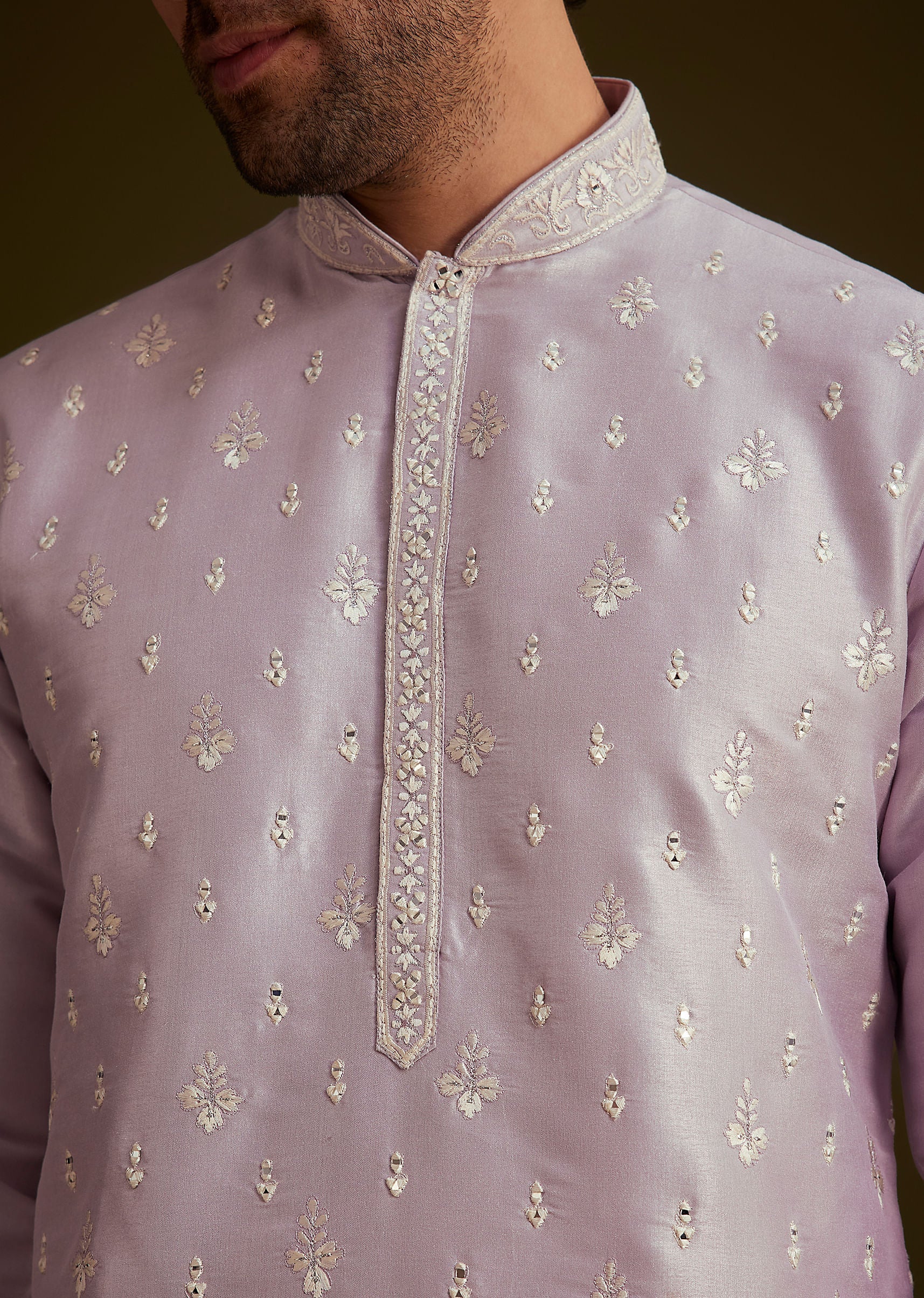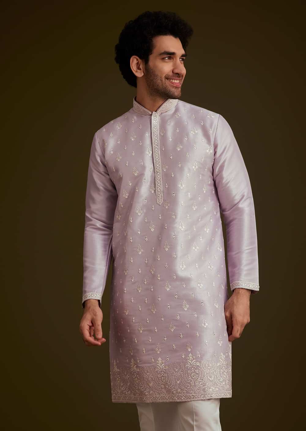 Exude refined charm with this lilac kurta set, adorned with intricate silver embroidery and delicate motifs that add a regal touch.Crafted from premium fabric, this ensemble is ideal for wedding,... More Product Details