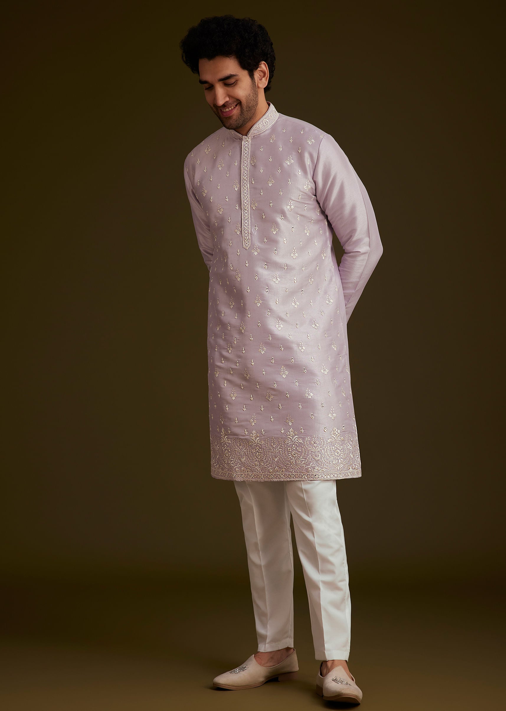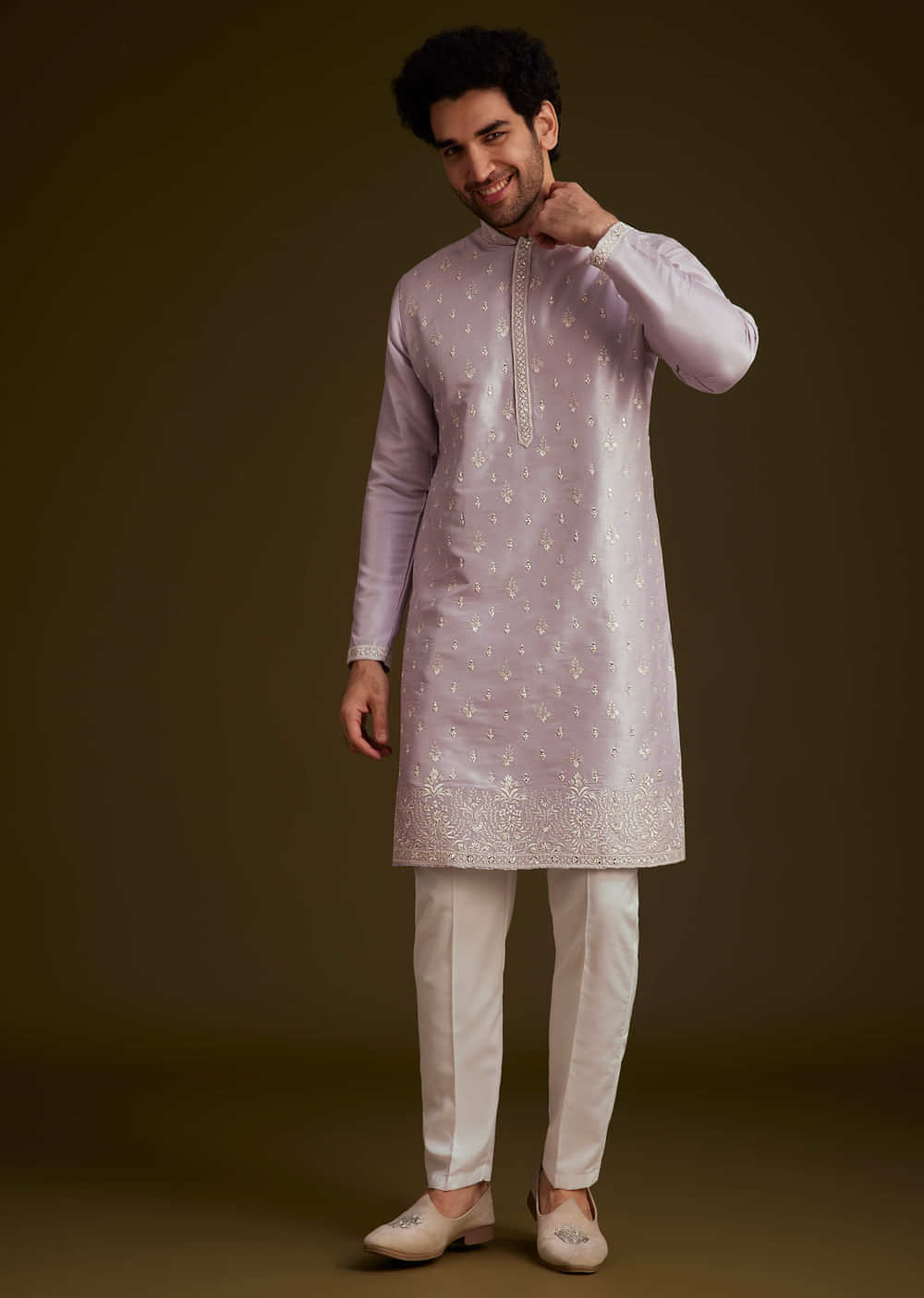Exude refined charm with this lilac kurta set, adorned with intricate silver embroidery and delicate motifs that add a regal touch.Crafted from premium fabric, this ensemble is ideal for wedding, festive celebrations, or elegant evening events.The soft lilac hue paired with white trousers creates a sophisticated and modern ethnic look.Combining comfort with exquisite detailing, this kurta set is a perfect choice for those who appreciate understated luxury. Awarded as the Most Trusted Brand, we're delivering styles you love, just as promised.