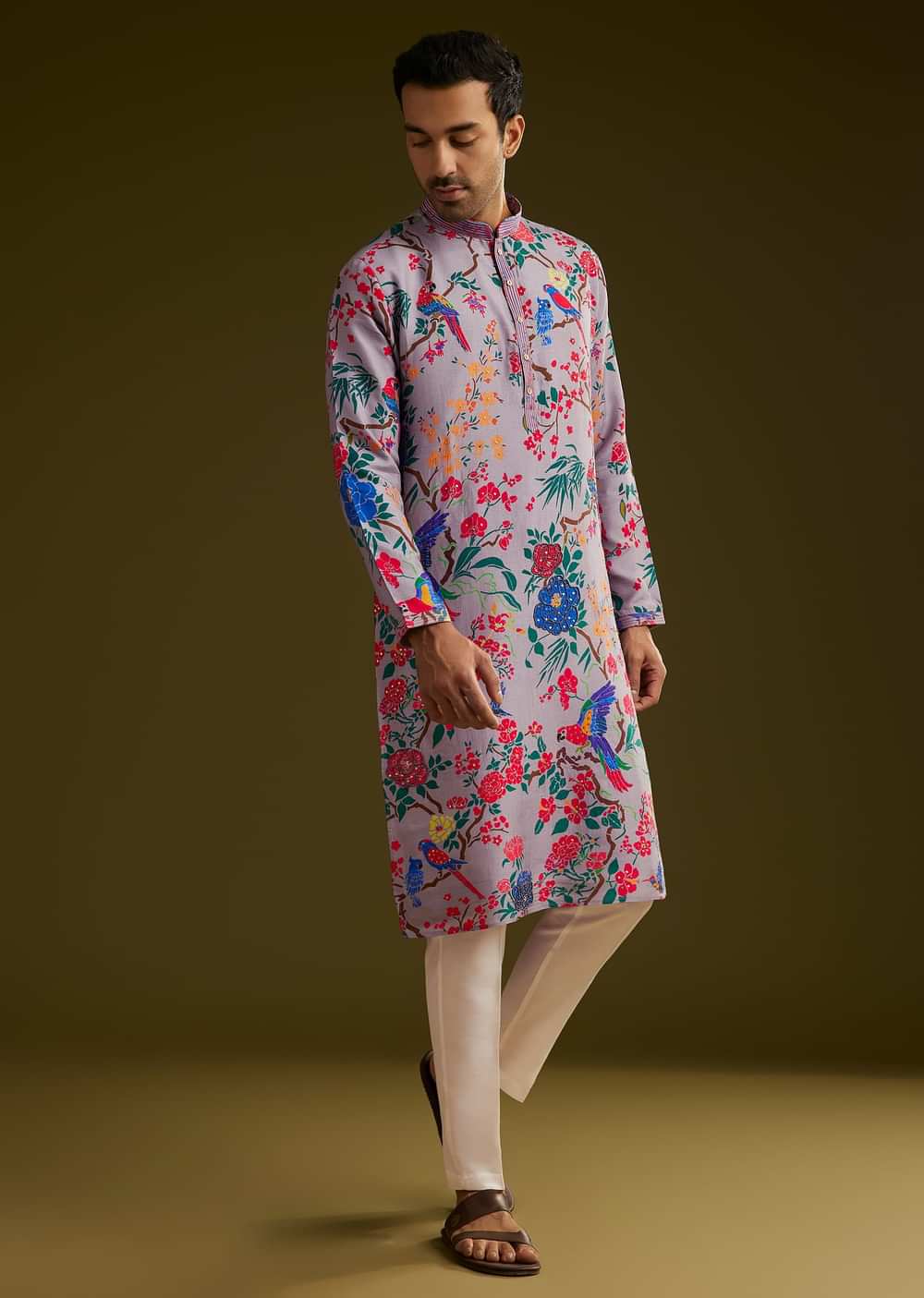 This lilac silk kurta set is a graceful addition to any ethnic wardrobe. The floral leaf and nature prints mandarin collar and structured full sleeves lend it a timeless charm.... More Product Details