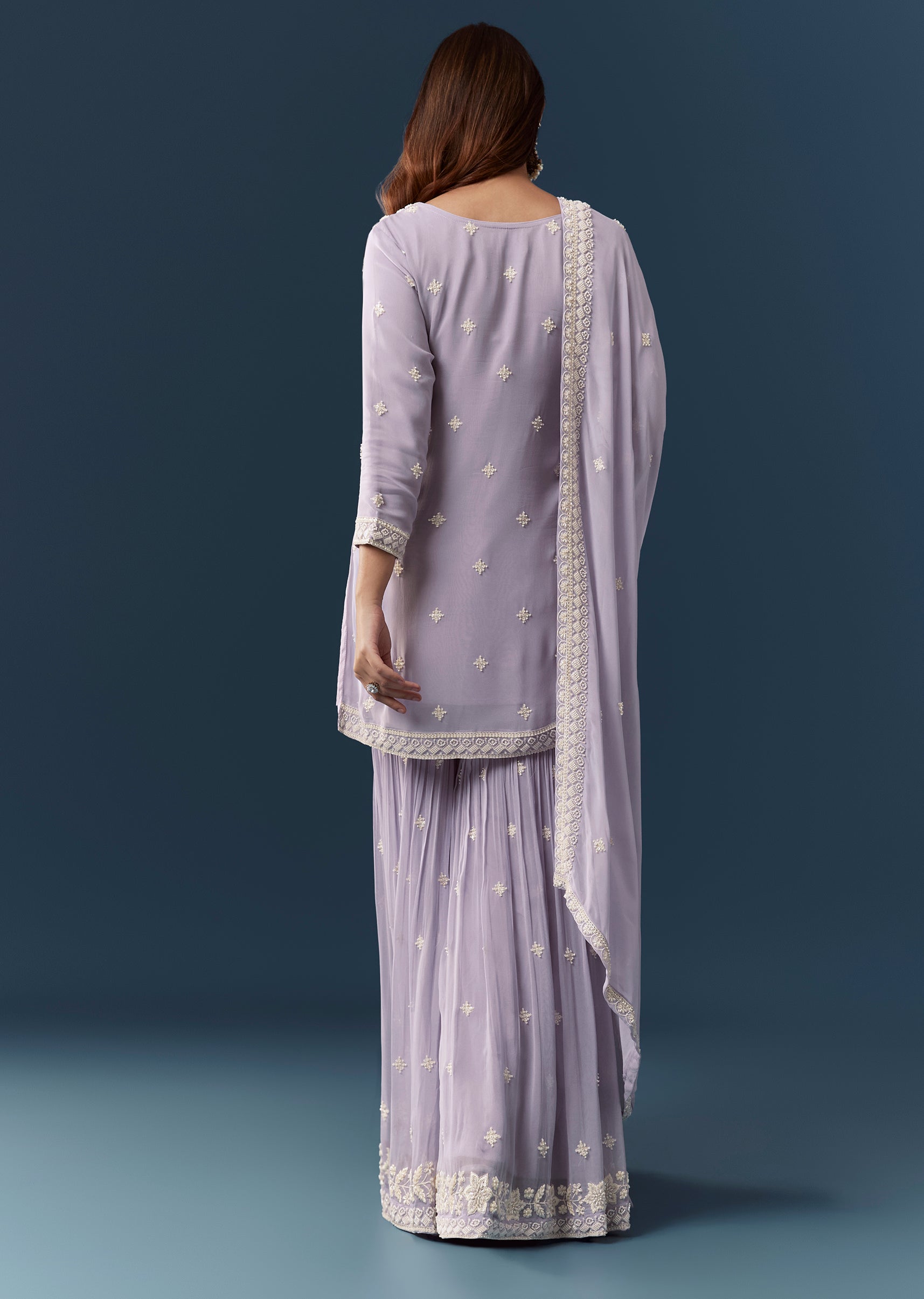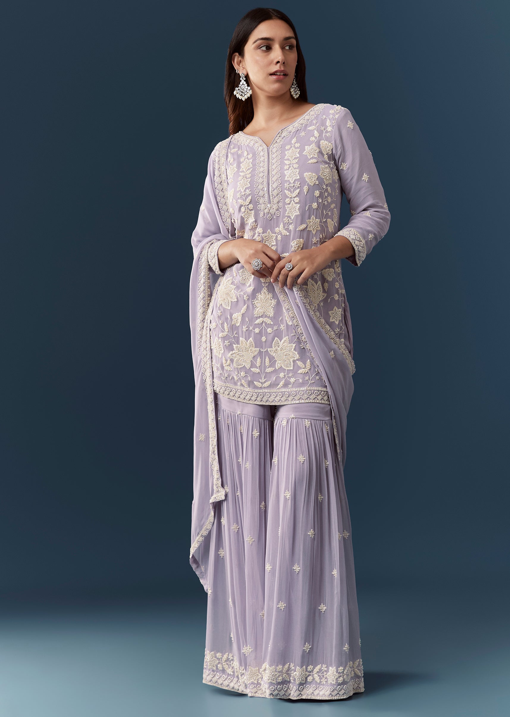 A gentle touch of elegance defines this lilac georgette kurta set, beautifully embellished with delicate bead accents and resham embroidery that add a subtle festive sheen. The three fourth sleeve... More Product Details