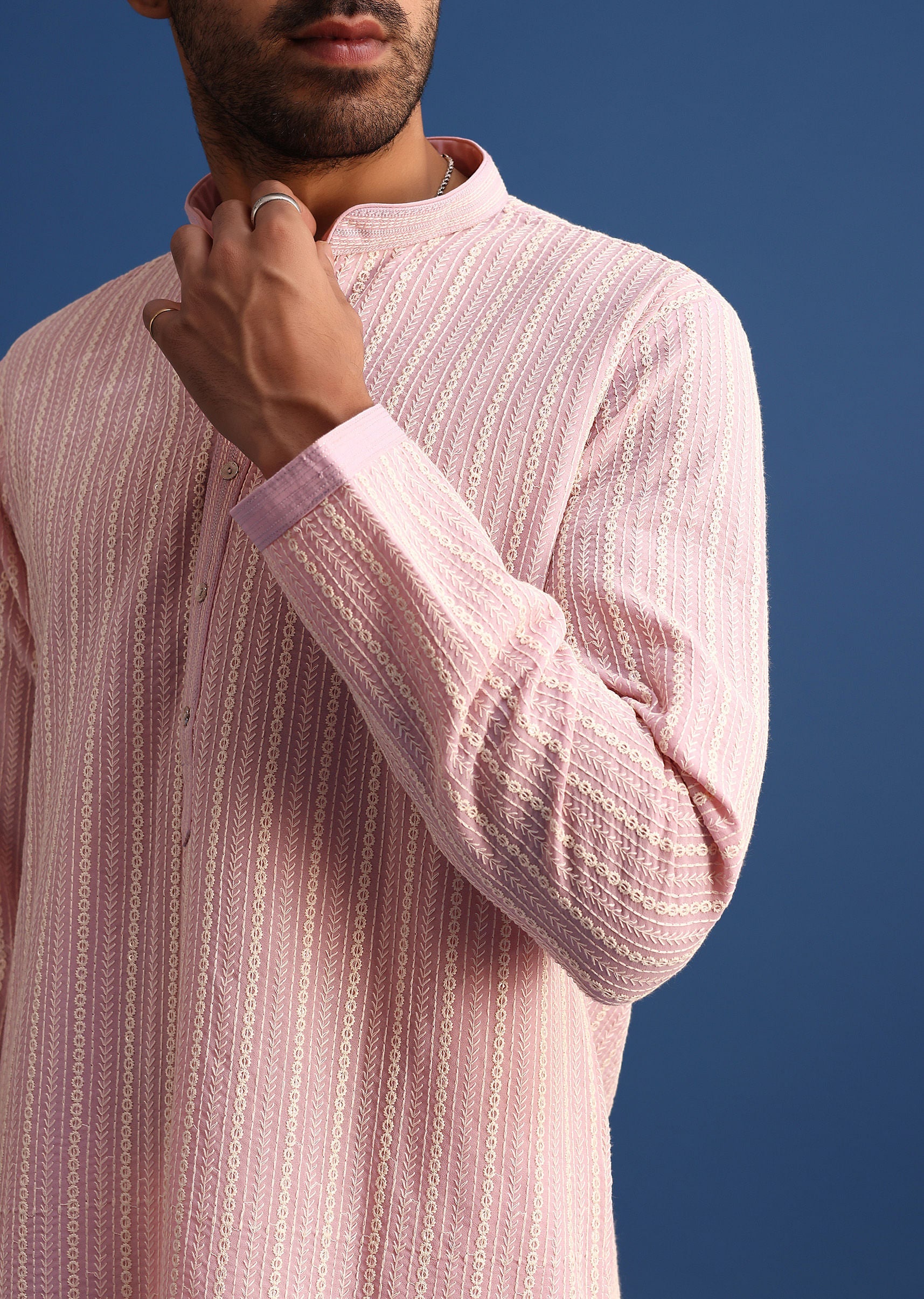 A beautiful style that ensure picture perfect memories. Set on a vibrant lilac base, this ensemble is crafted from rich georgette. Adorned with all over resham and thread work, the kurta showcases a mandarin collar and full sleeve design, making it an ideal choice for festivals and wedding celebrations. Awarded as the Most Trusted Brand, we're delivering styles you love, just as promised.