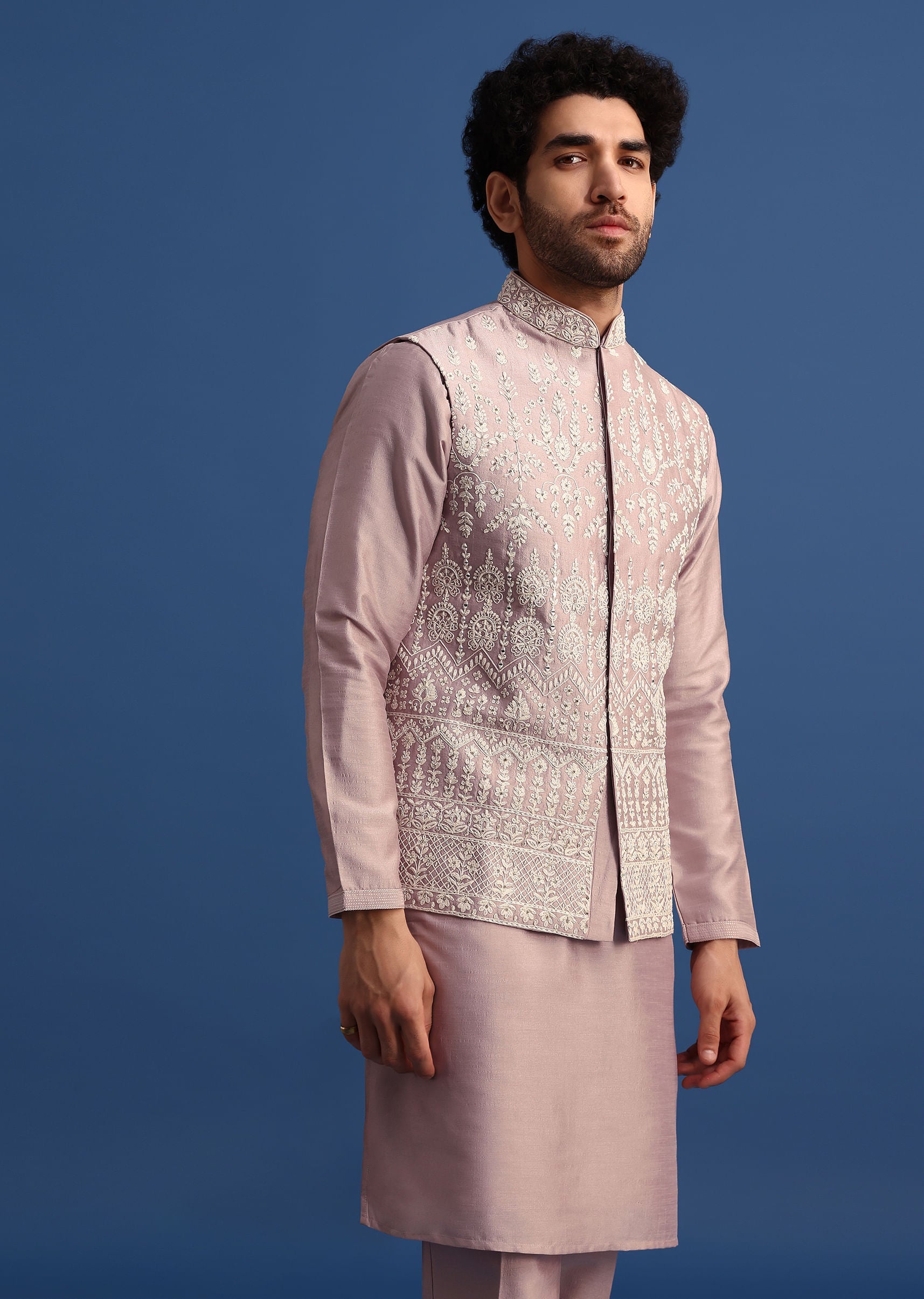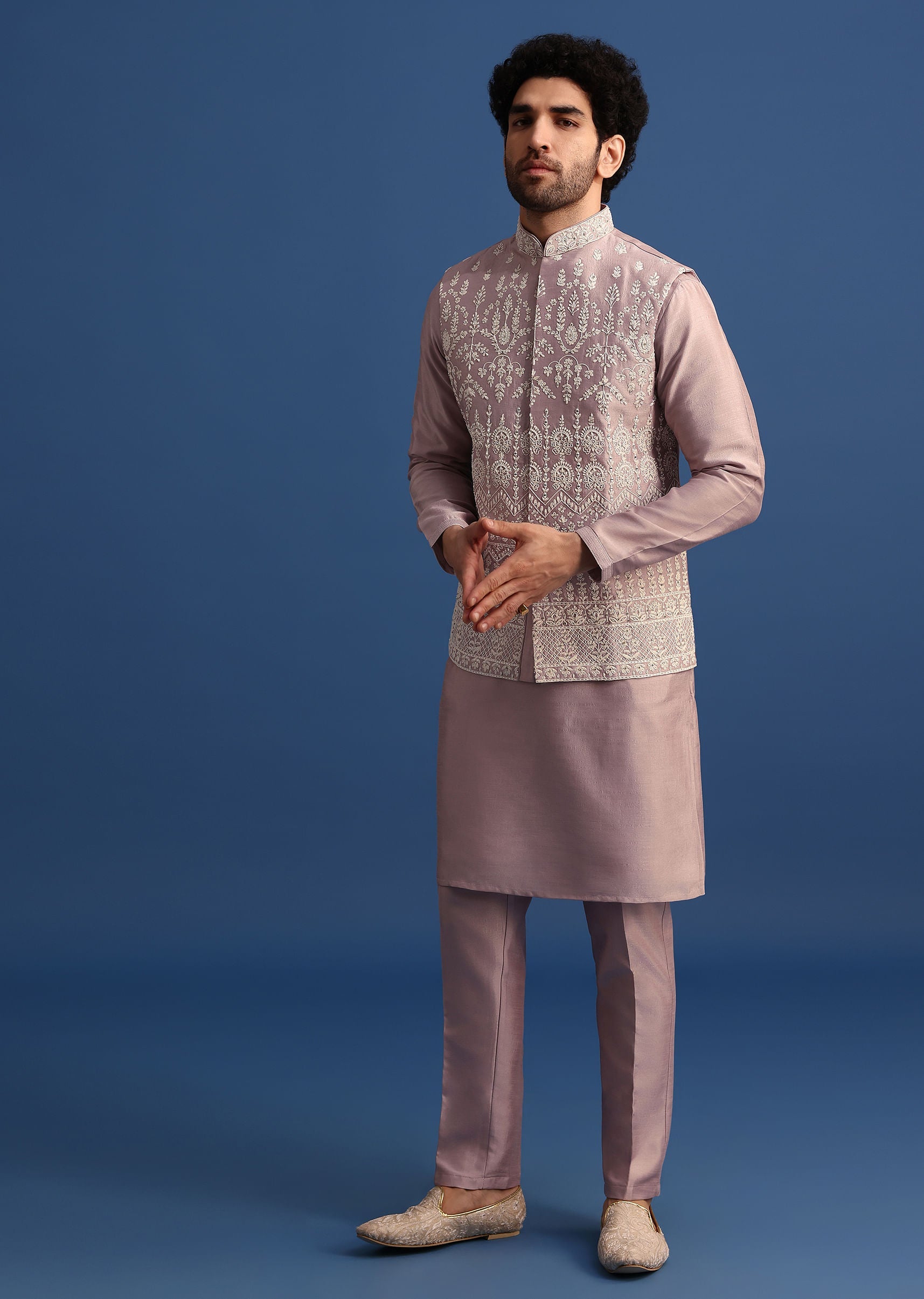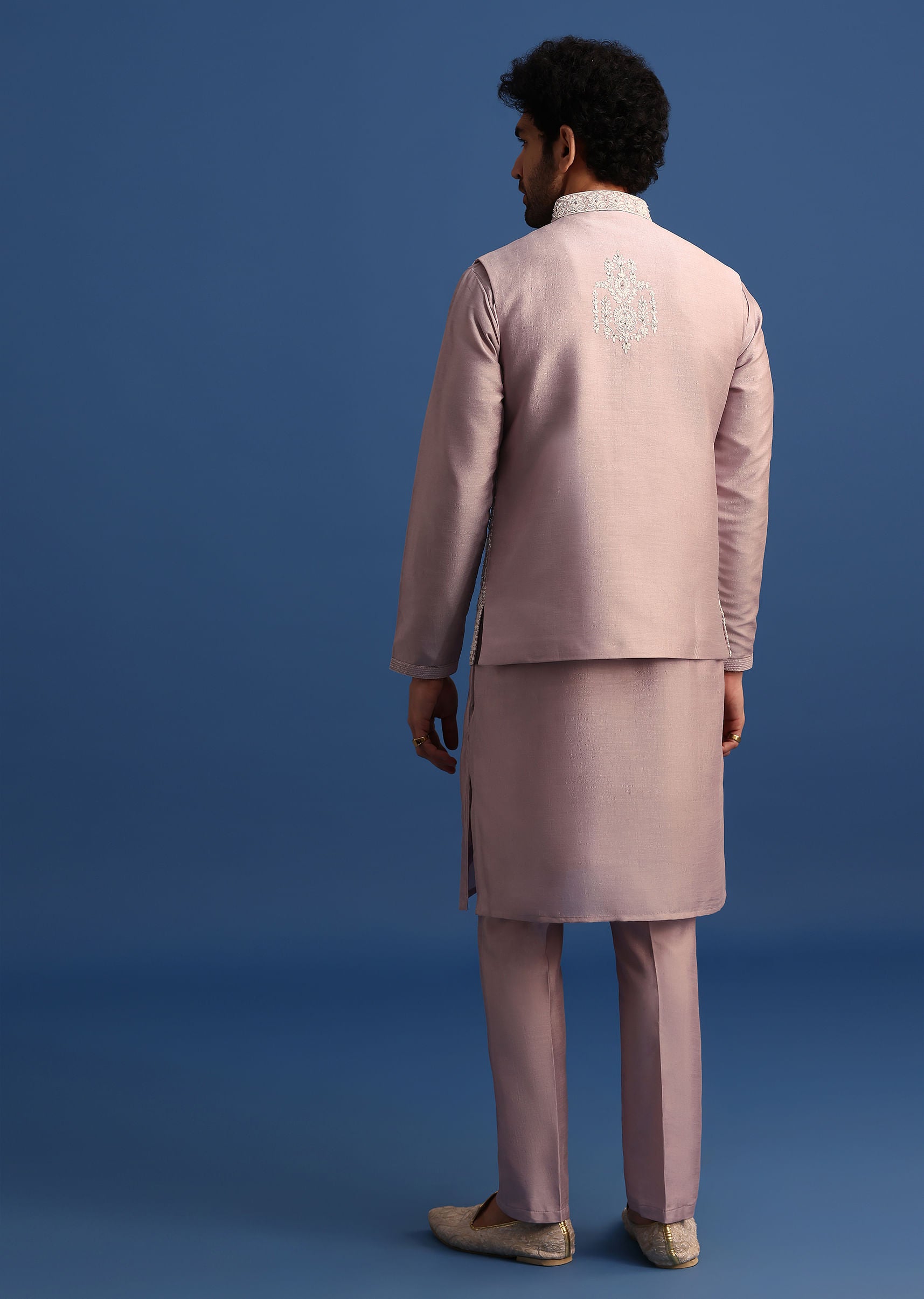 Redefine elegance with our Lilac Raw Silk Kurta Jacket Set. Featuring a striking lilac shade and detailed thread work this ensemble brings a royal touch to any occasion. The rich texture of the raw silk and the intricate embroidery make this set a sophisticated choice for special celebrations. This set includes a kurta a jacket and pants. Awarded as the Most Trusted Brand, we're delivering styles you love, just as promised.