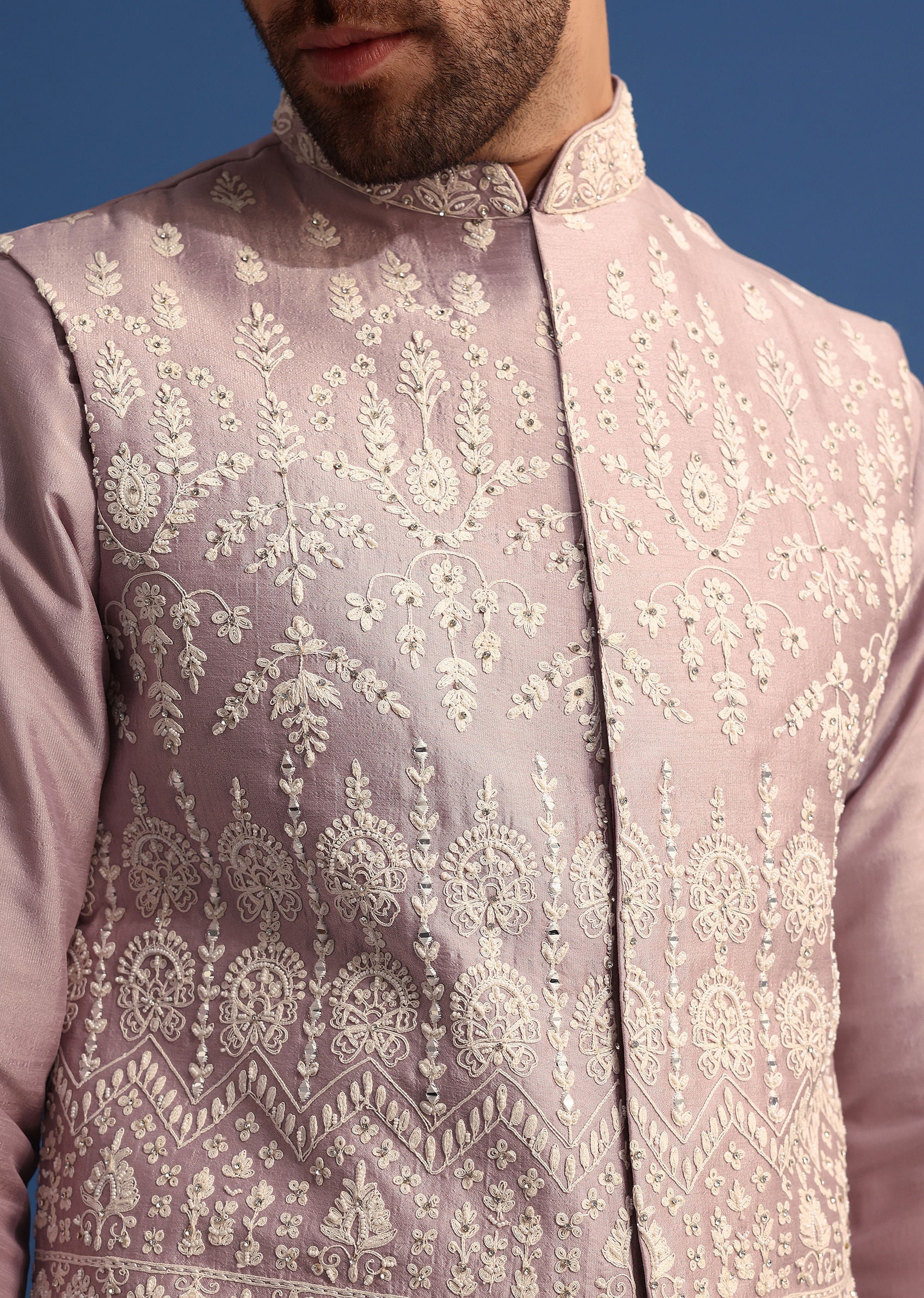 Redefine elegance with our Lilac Raw Silk Kurta Jacket Set. Featuring a striking lilac shade and detailed thread work this ensemble brings a royal touch to any occasion. The rich... More Product Details