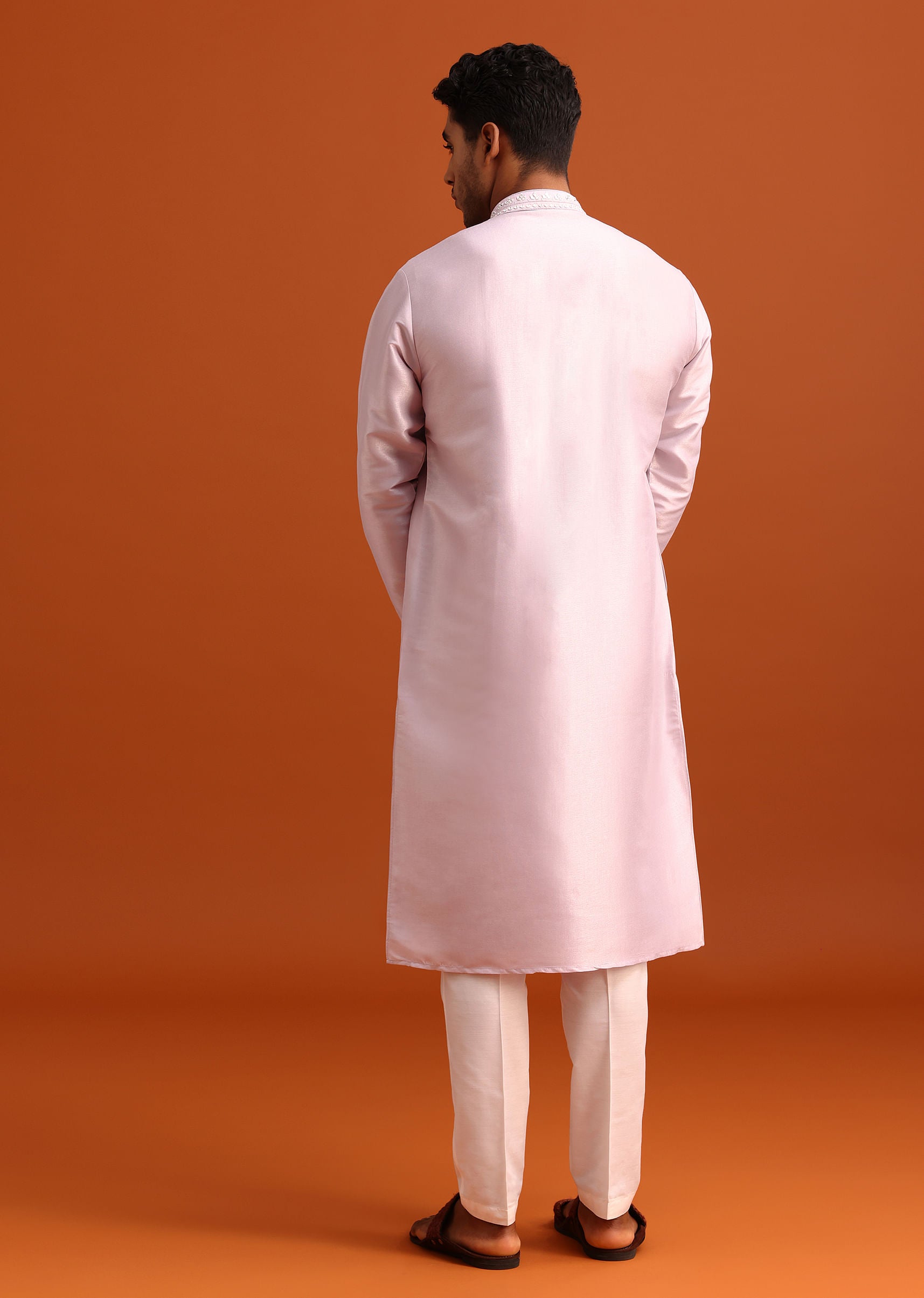 Gleaming with mirror work on the yoke, this captivating lilac kurta and pant set will ensure you shine through lit-up celebrations. Expertly crafted with a hook-eye placket, mandarin collar and full sleeves, it is tailored from premium silk fabric. Ideal for festive occasions, family gatherings, or casual outings, consider this ensemble to charm the crowd. Awarded as the Most Trusted Brand, we're delivering styles you love, just as promised.