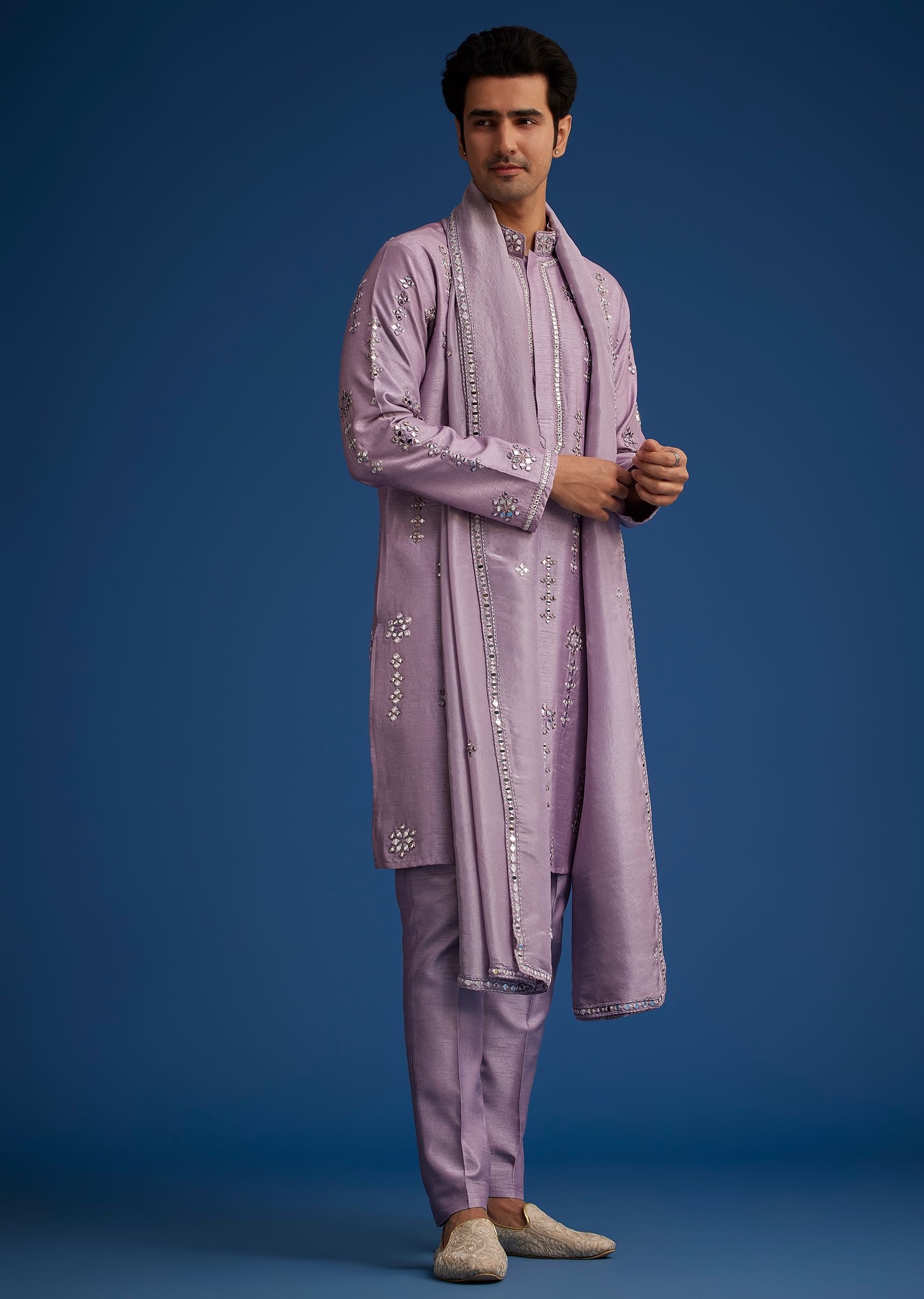 A symphony of elegance and artistry, this lilac kurta set is a vision of refined tradition. The delicate self-on-self resham embroidery is beautifully enhanced with shimmering mirror and zari work, creating an ethereal appeal. The coordinated closed dupatta adds a regal touch, making it an exquisite ensemble for festive occasions and wedding celebrations.Awarded as the Most Trusted Brand, we're delivering styles you love, just as promised.