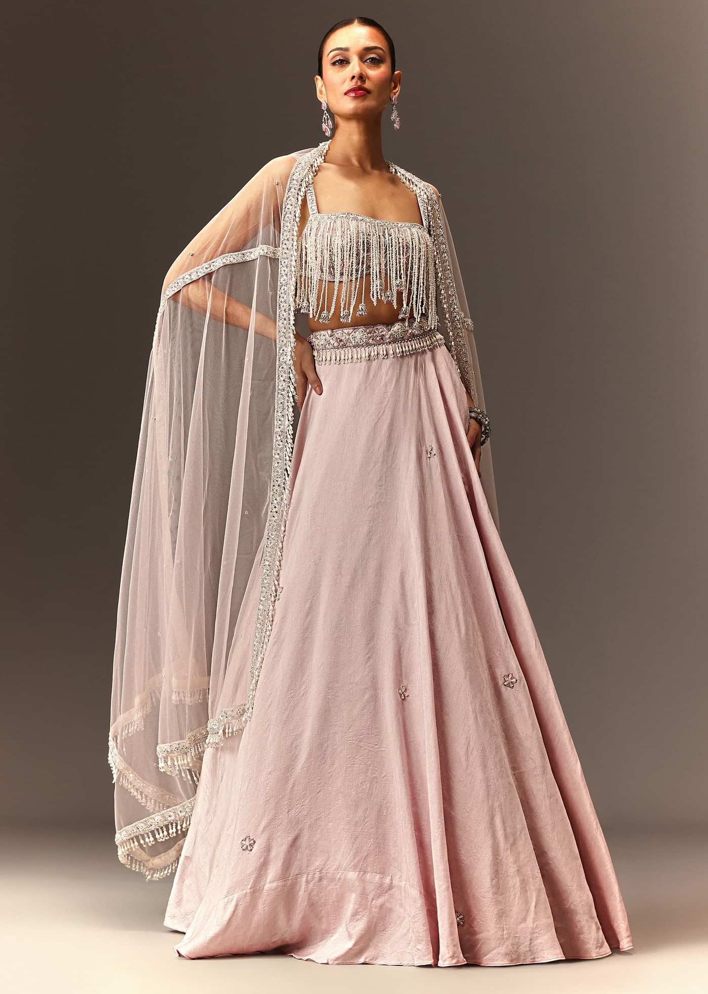 The lehenga should graze the floor without pooling. A hem that's too short can look awkward.