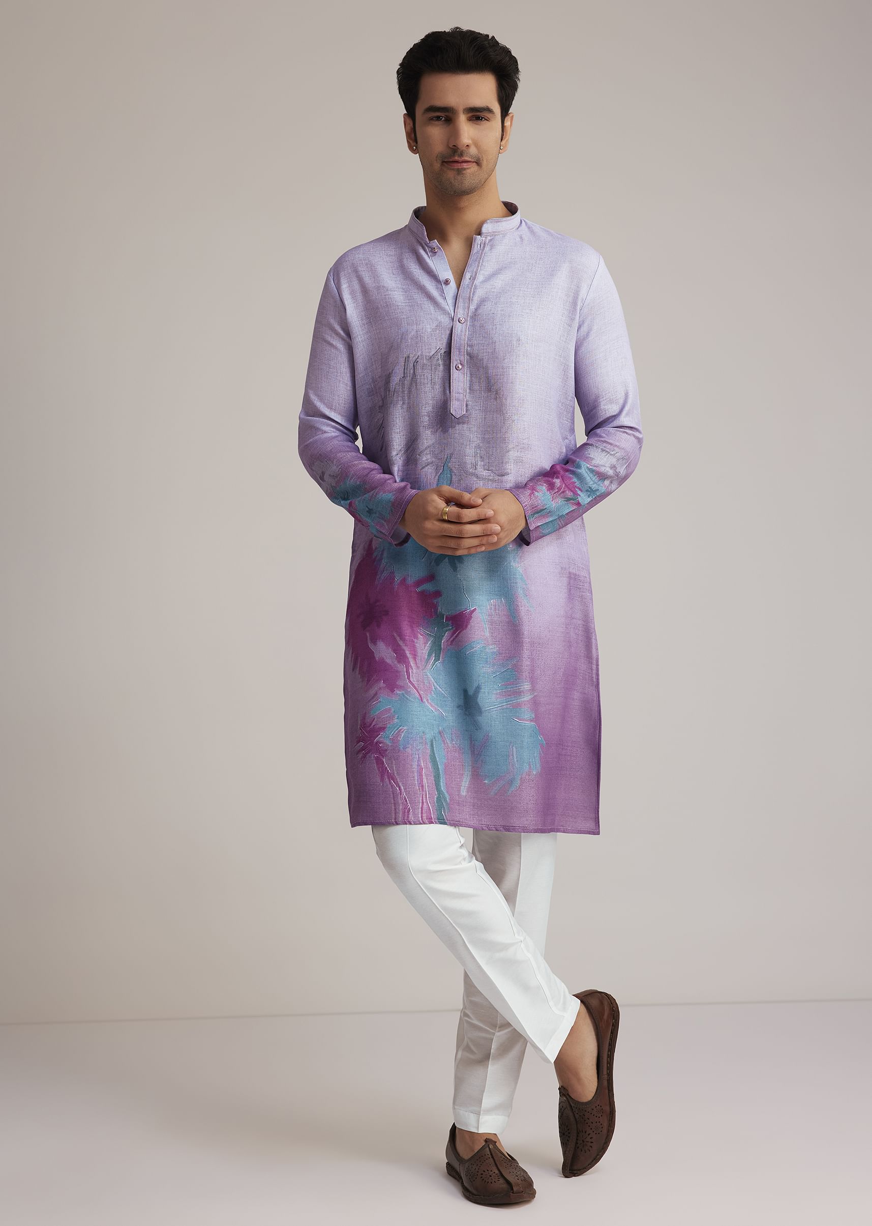 - Enhance Your Ethnic Wardrobe With This Lilac Linen Kurta Featuring A Captivating Ombre Effect And Abstract Print On The Front And Sleeves.