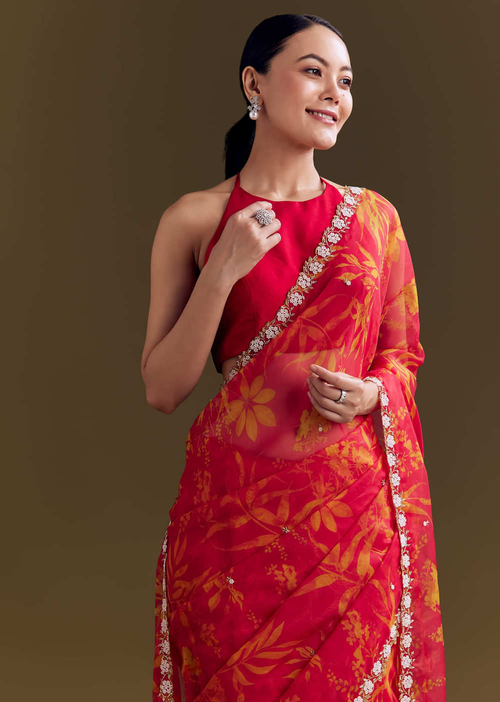 A red organza saree with botanical floral prints and cutdana bead embroidery along the scallop border. Awarded as the Most Trusted Brand, we're delivering styles you love, just as promised.