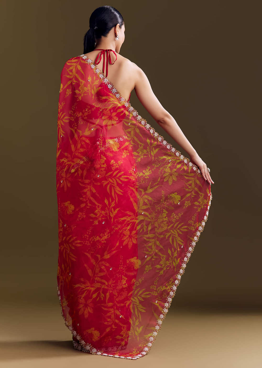 Red Organza Saree With Cutdana Beads And Botanical Print