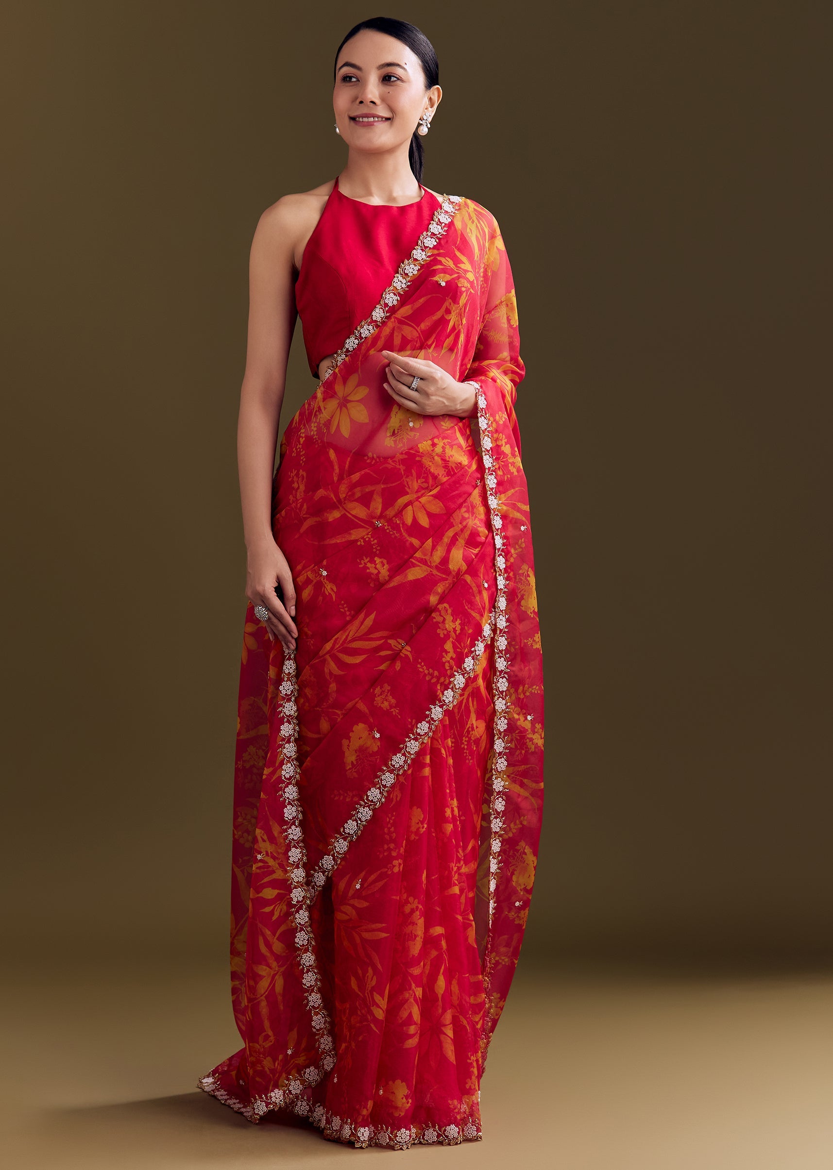 More Product DetailsA red organza saree with botanical floral prints and cutdana bead embroidery along the scallop border. Awarded as the Most Trusted Brand, we're delivering styles you love, just as promised.