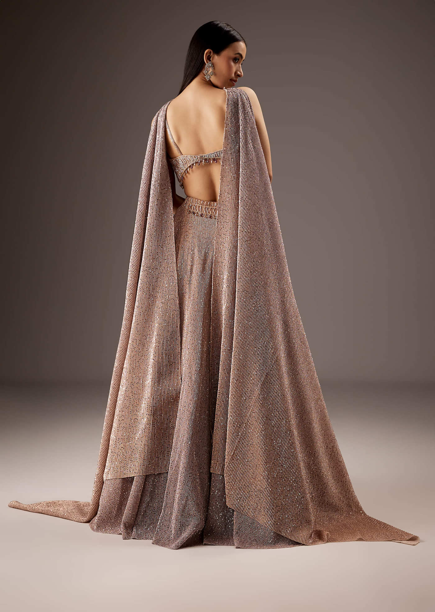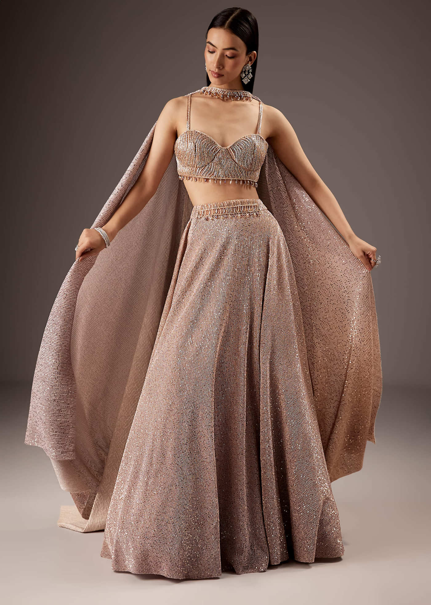 The lehenga should feel light enough to glide as you walk, and the cape dupatta should drape smoothly without slipping.