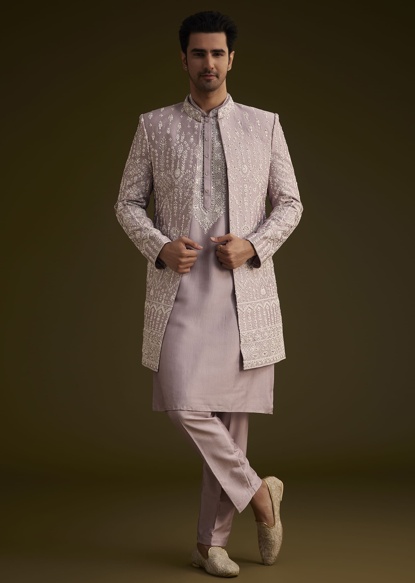Lilac Silk Sherwani Set With Thread And Stone Work