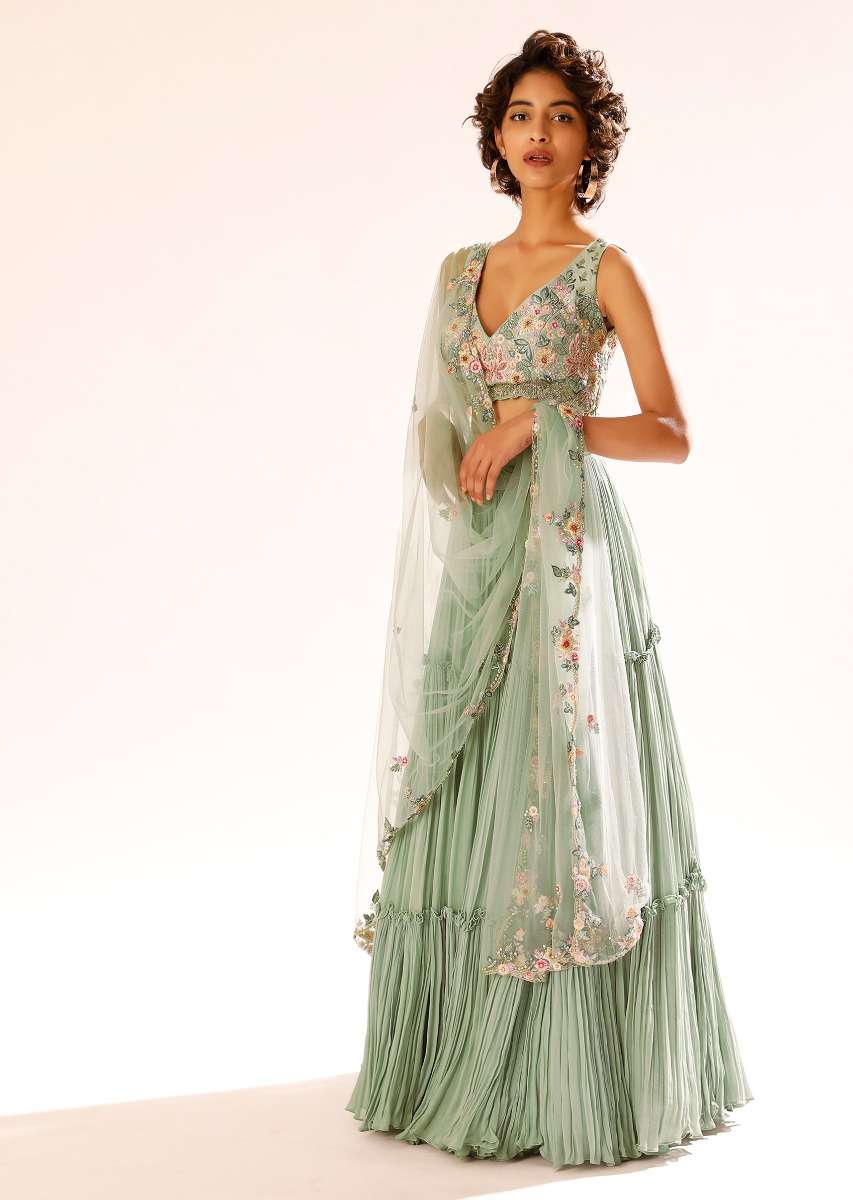 Lily green lehenga in crushed georgette with tiered silhouette and embroidered waistline. It is paired with a matching raw silk crop top enhanced with colorful resham, moti and cut dana... More Product Details