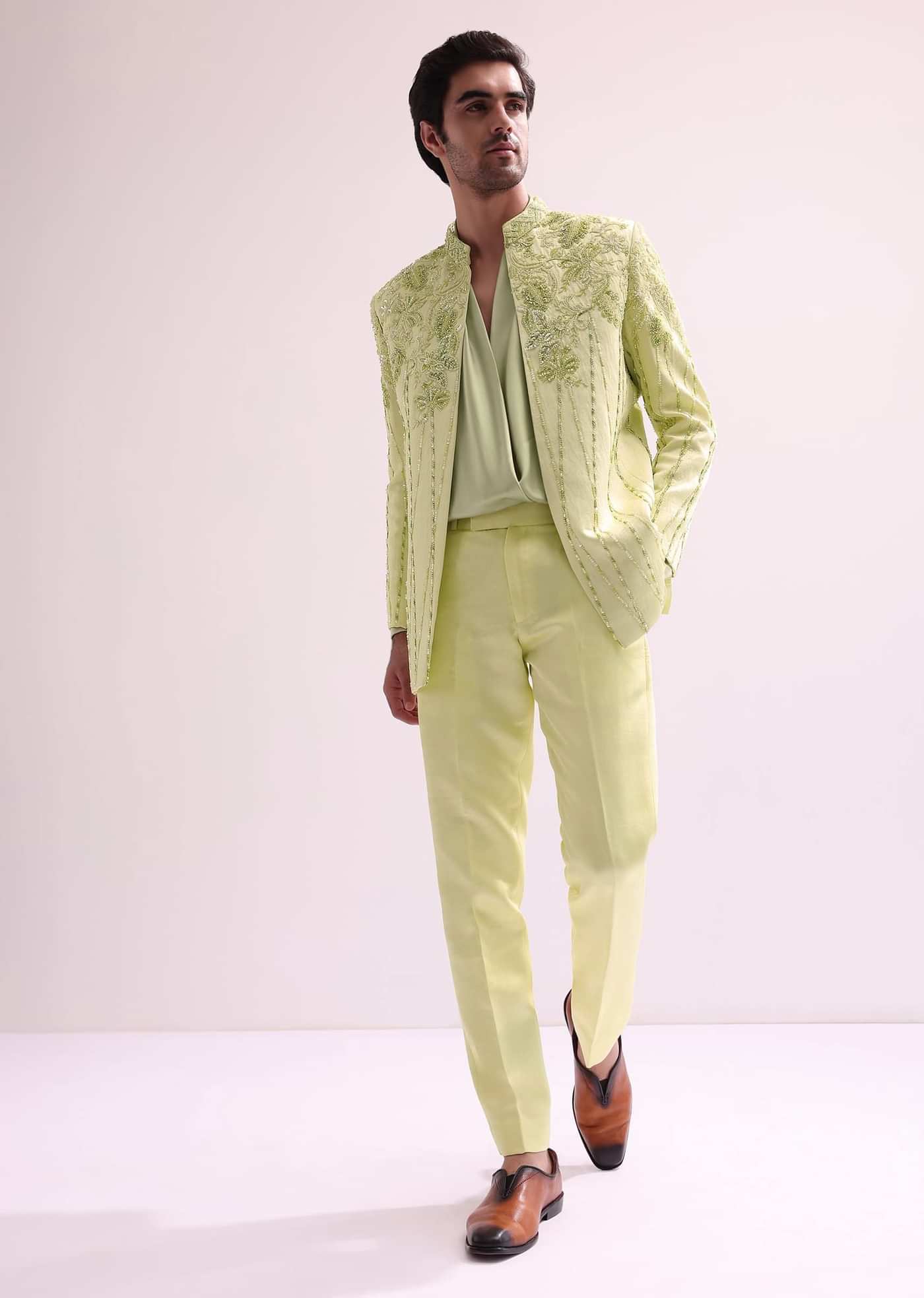 Lime Bandhgala Jacket And Pant Set With Floral Embroidery