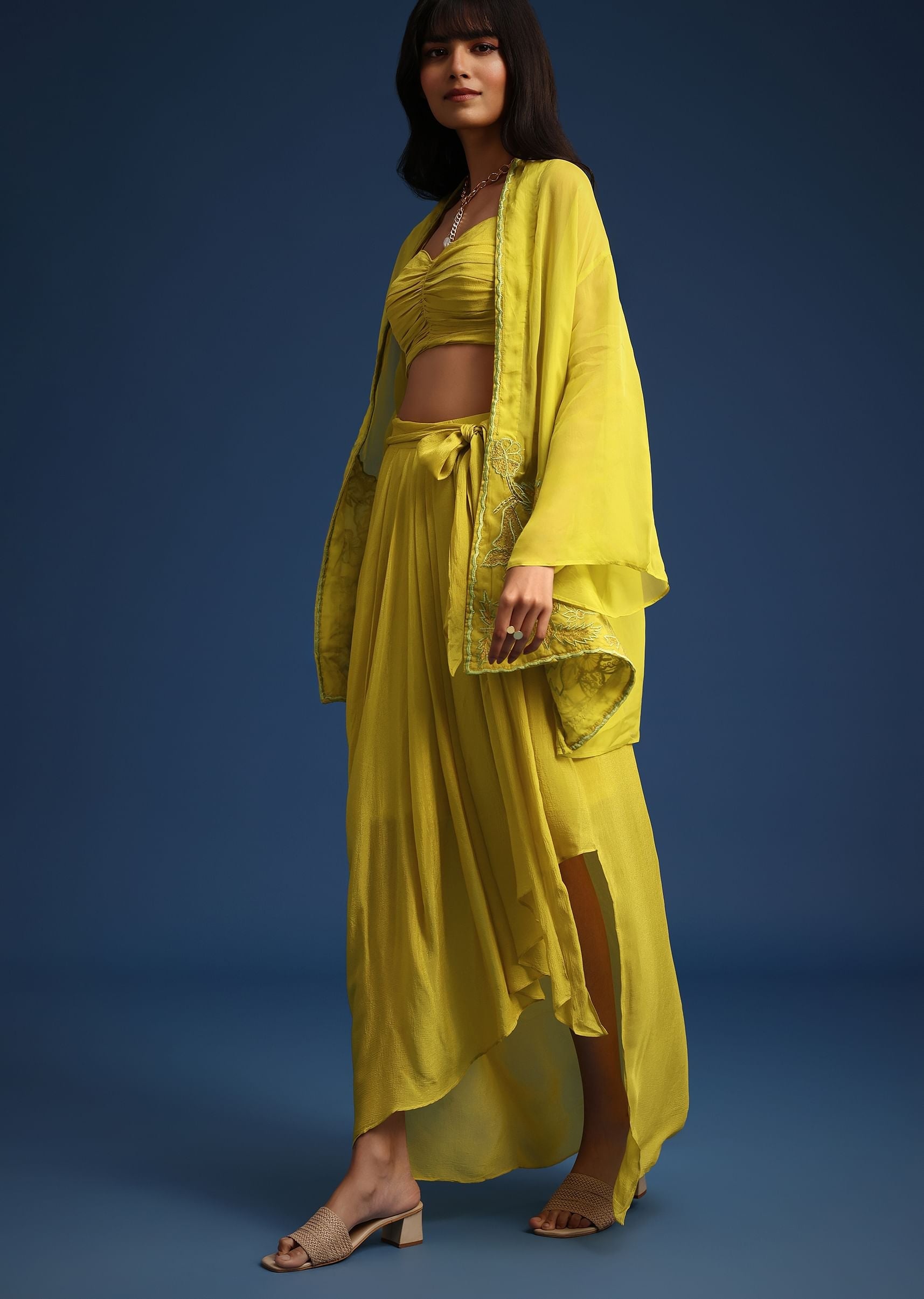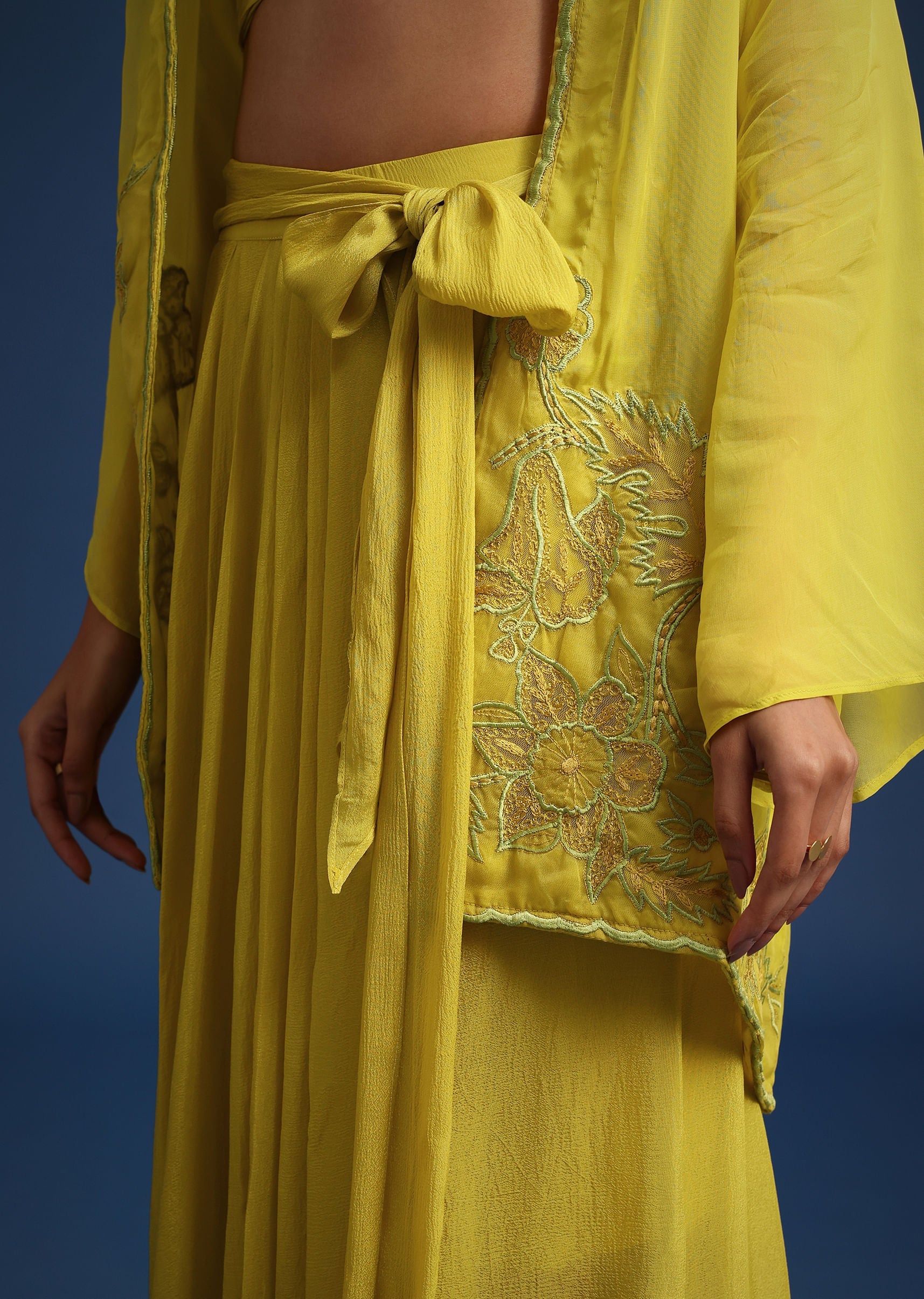 An ideal choice for the modern-day women who wishes to showcase her unique style. Adorned in a lime green hue, the solid pleated crop-top comes with a resham work jacket. Featuring a draped asymmetrical skirt elevated with front tie up details. Decked with intricate resham work, consider this silhouette a fabulous choice for festive parties. Awarded as the Most Trusted Brand, we're delivering styles you love, just as promised.