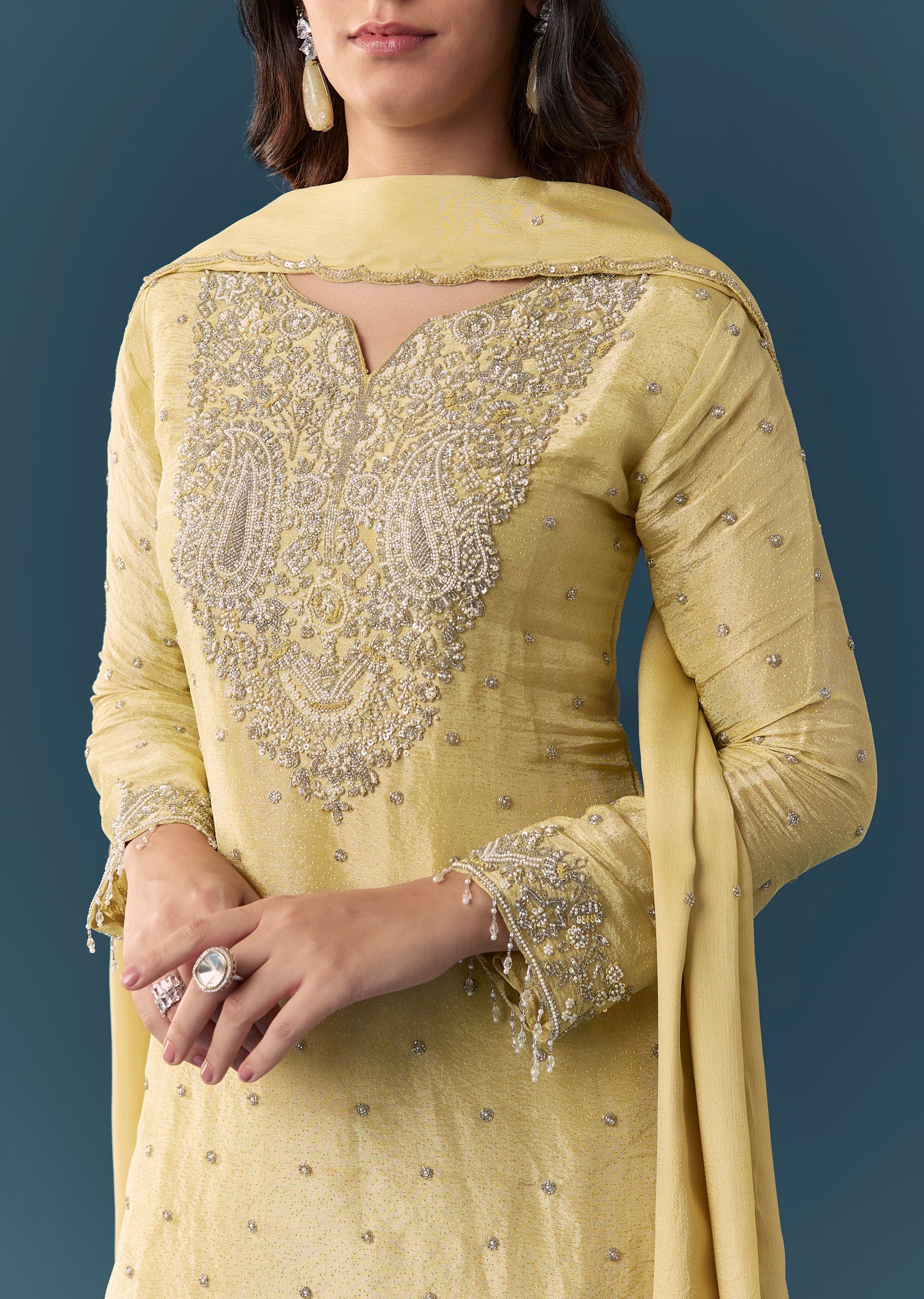 Crafted in tissue, this straight kurta features bead, moti and sequin embroidery with a notched neckline and full sleeves. Paired with a mid-waist palazzo (partially elasticated) and matching dupatta, it’s... More Product Details