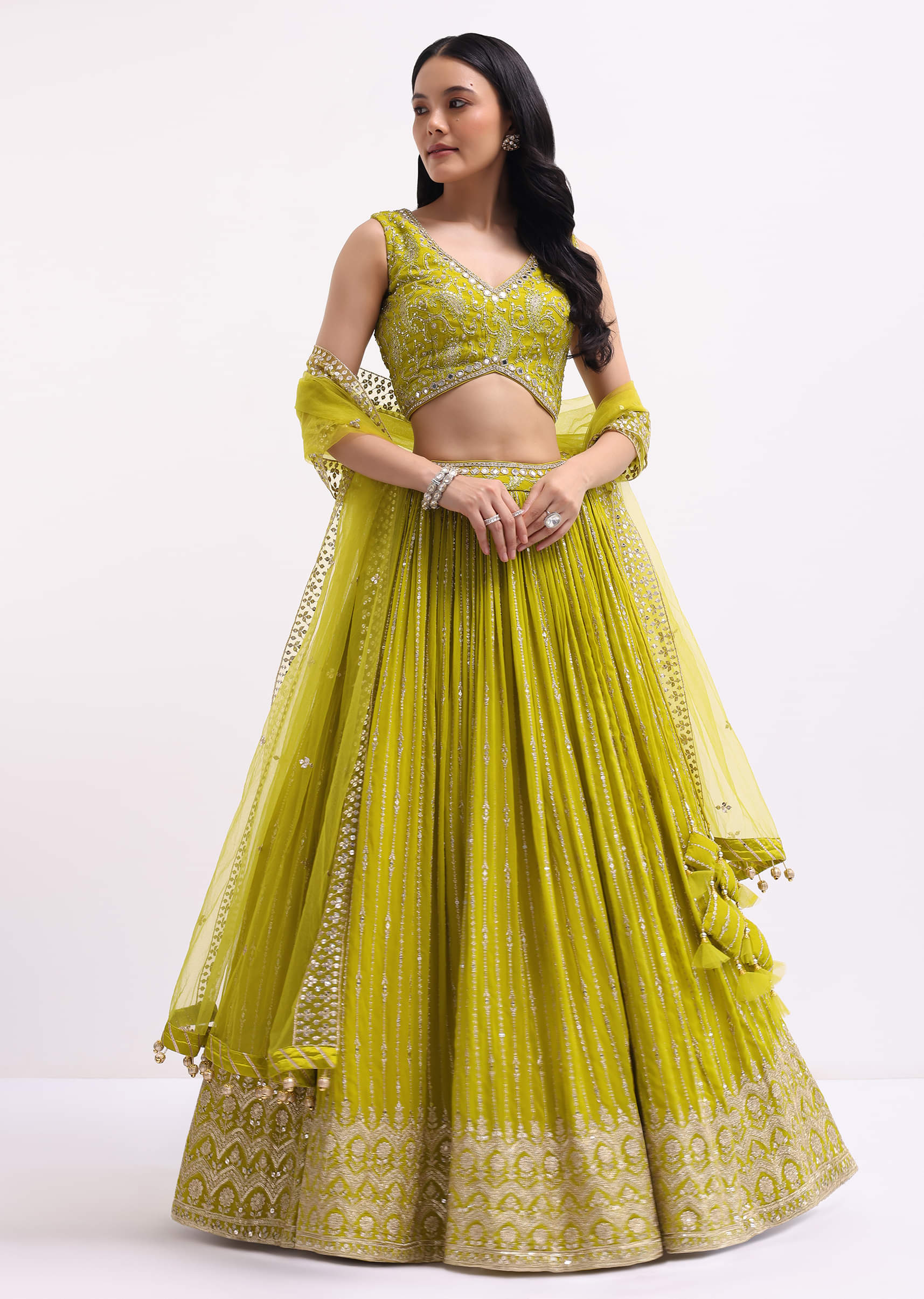 Indulge in the irresistible allure of our lime green lehenga choli set meticulously crafted for mehendi and sangeet festivities. This opulent ensemble boasts a georgette base adorned with exquisite sequins mirrors zari and stone embroidery. Complete with a stunning lehenga a beautifully designed choli and a dupatta Dupatta lace border may vary. Awarded as the Most Trusted Brand, we're delivering styles you love, just as promised.