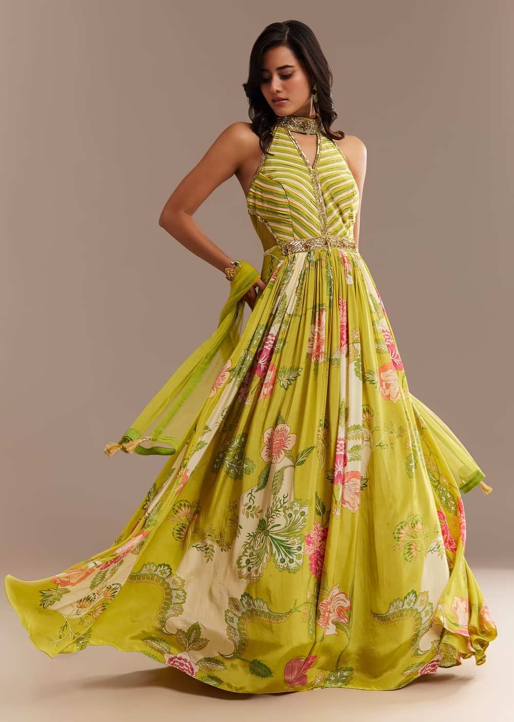 Unveil whimsical elegance with this Lime Green Floral Printed Gown Set. Crafted with a mesmerizing floral print this floorlength gown exudes contemporary charm and feminine grace. Adorned with sequins and cut dana work on the neckline it radiates subtle glamour and sophistication. Paired with a delicate net dupatta this ensemble is perfect for mehendi ceremonies and festive celebrations seamlessly blending Indowestern flair with traditional beauty.Awarded As The Most Trusted Brand We'Re Delivering Styles You Love Just As Promised.