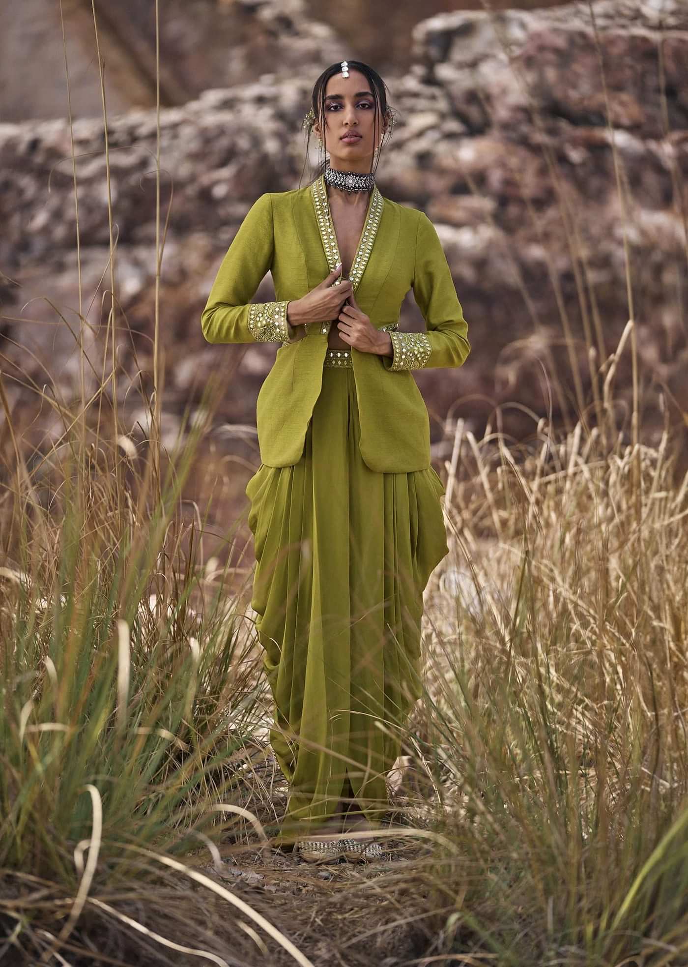Lime Green Mirror Bustier With Jacket And Draped Skirt