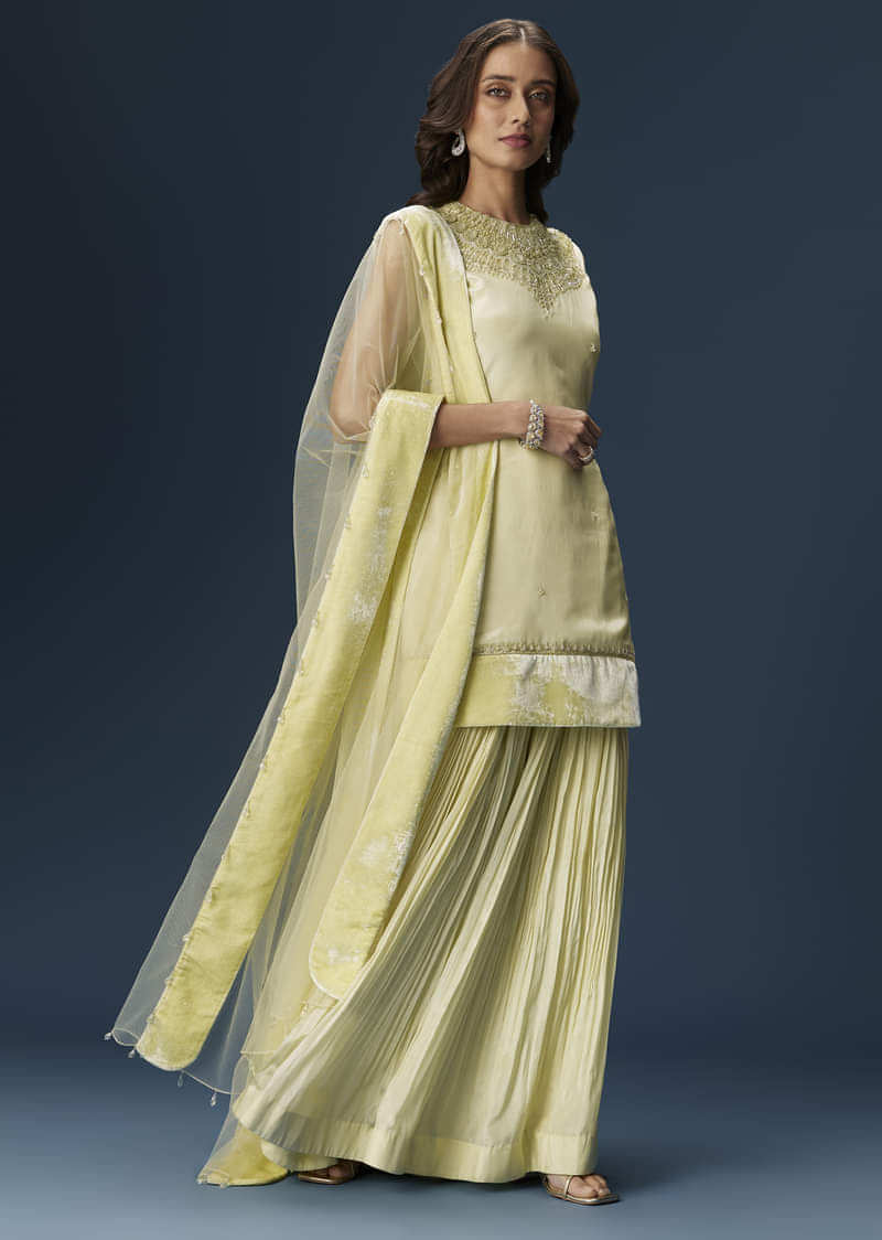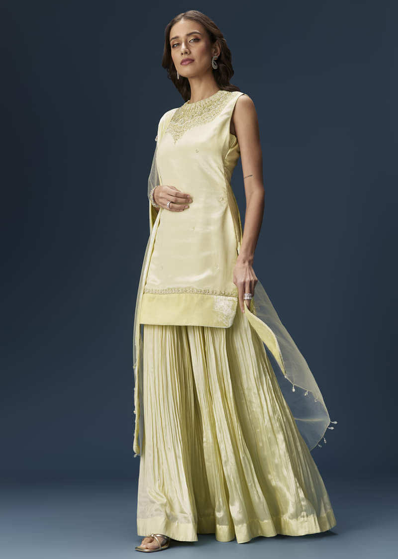A pastel crepe palazzo suit designed with an attached stonework necklace for a built-in festive touch. Paired with a dupatta, it’s light, stylish, and perfect for haldi, mehendi, or day... More Product Details
