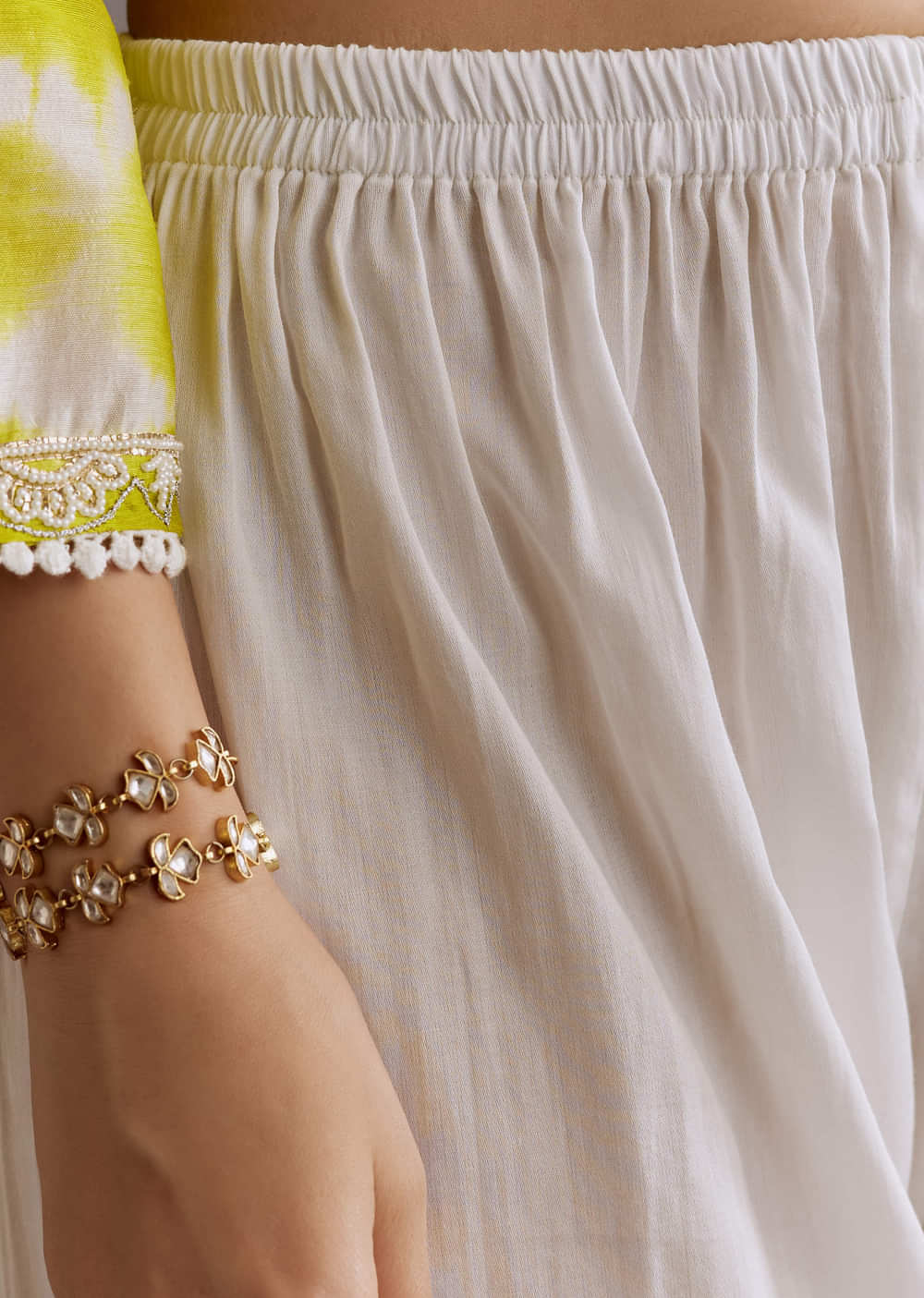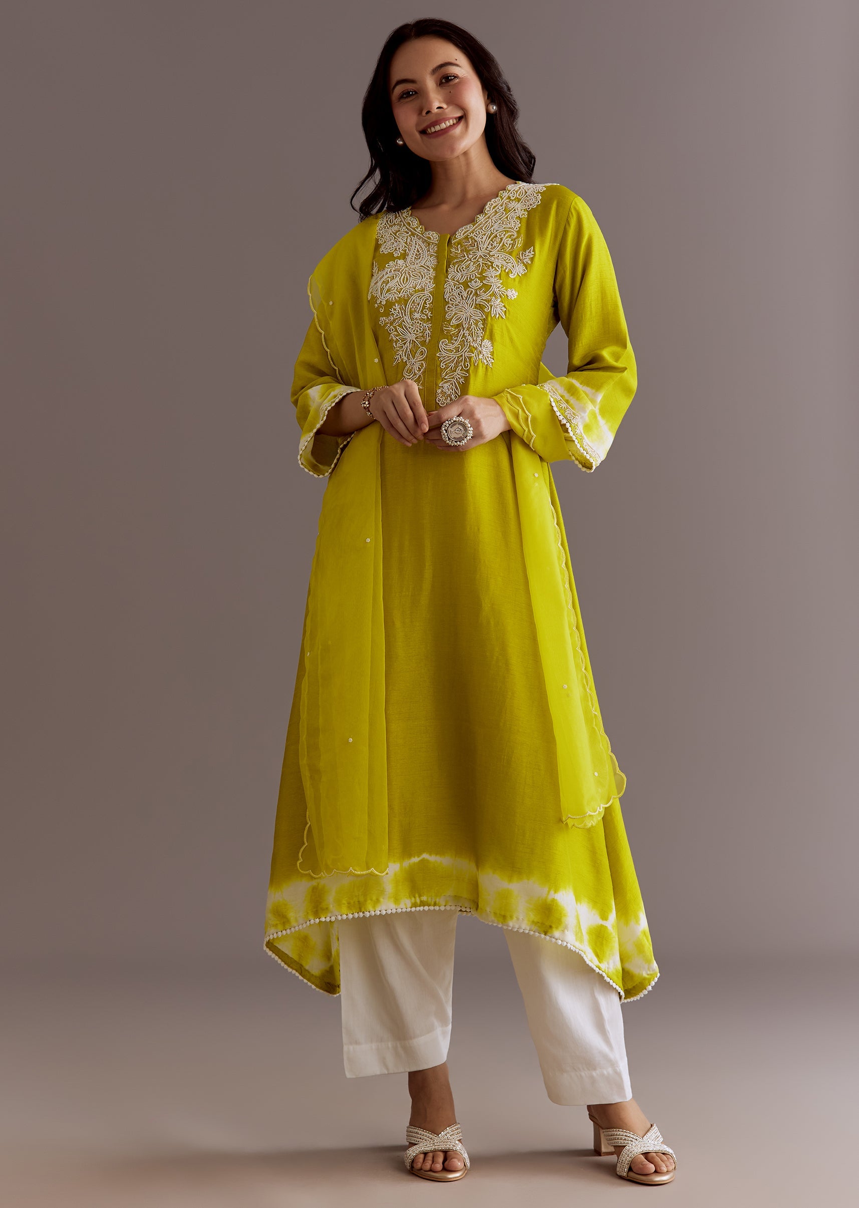 Lime Green Silk Kurta Dupatta Set With Moti Work