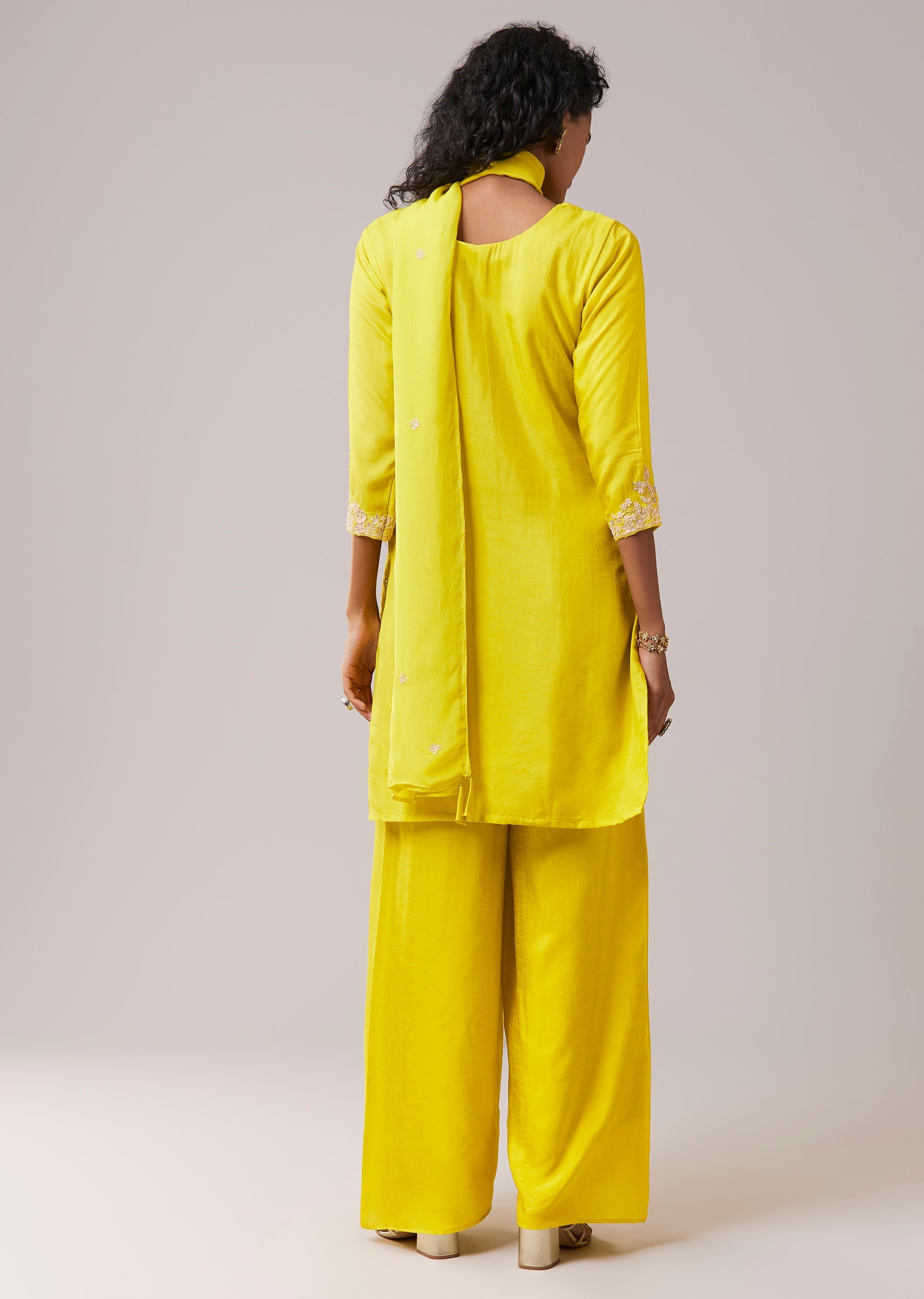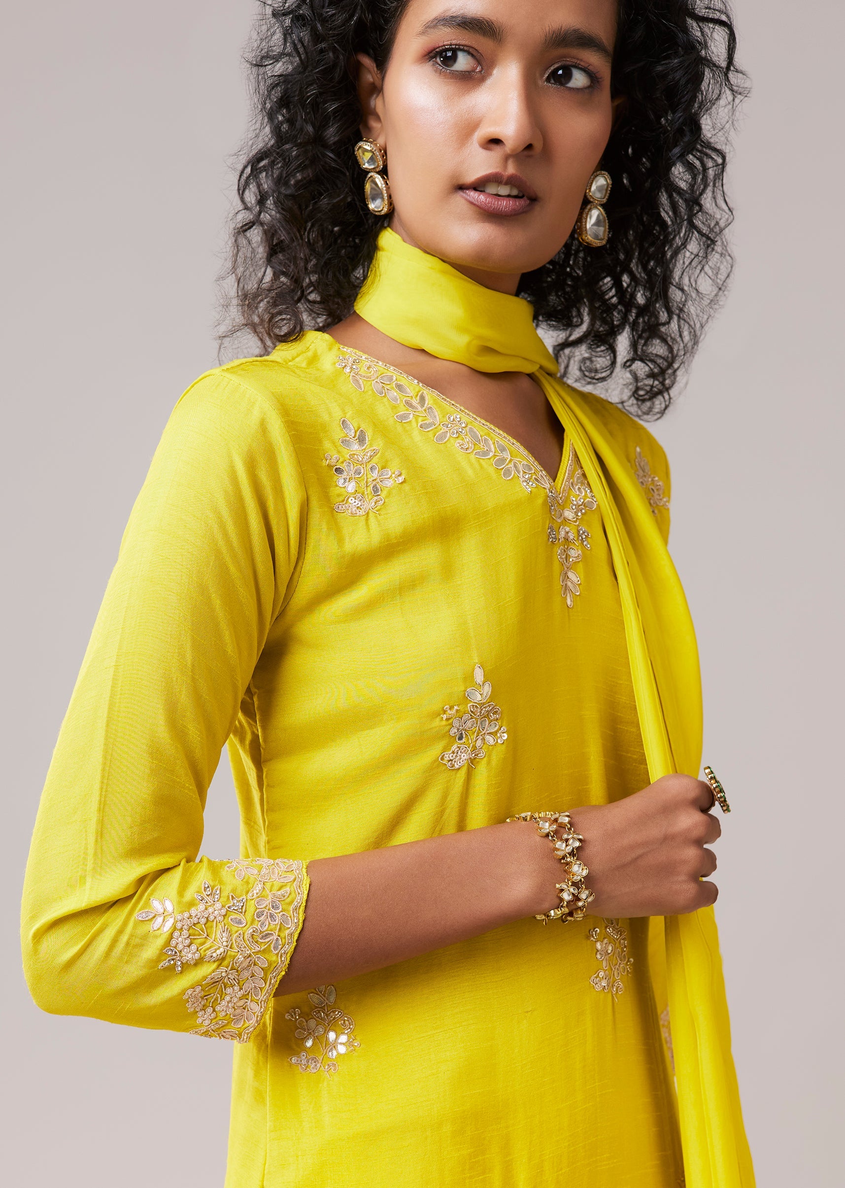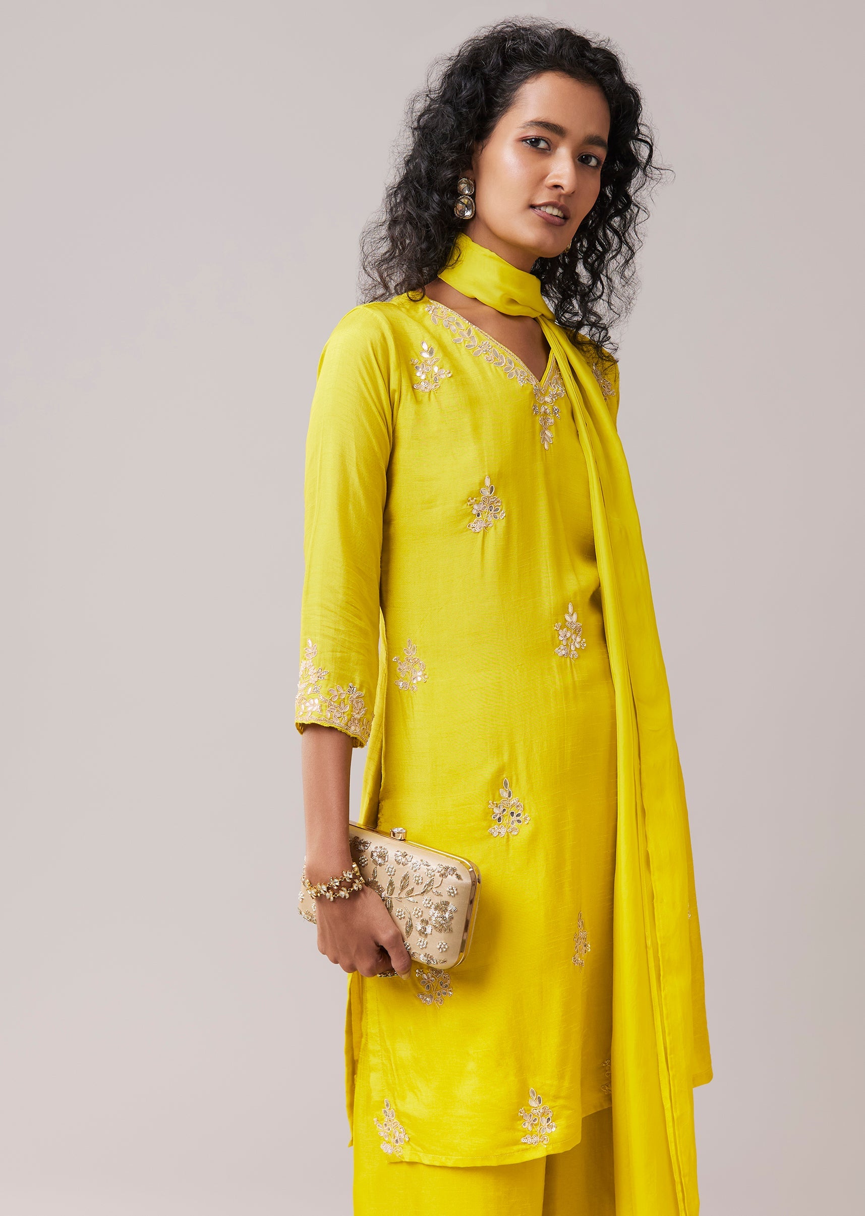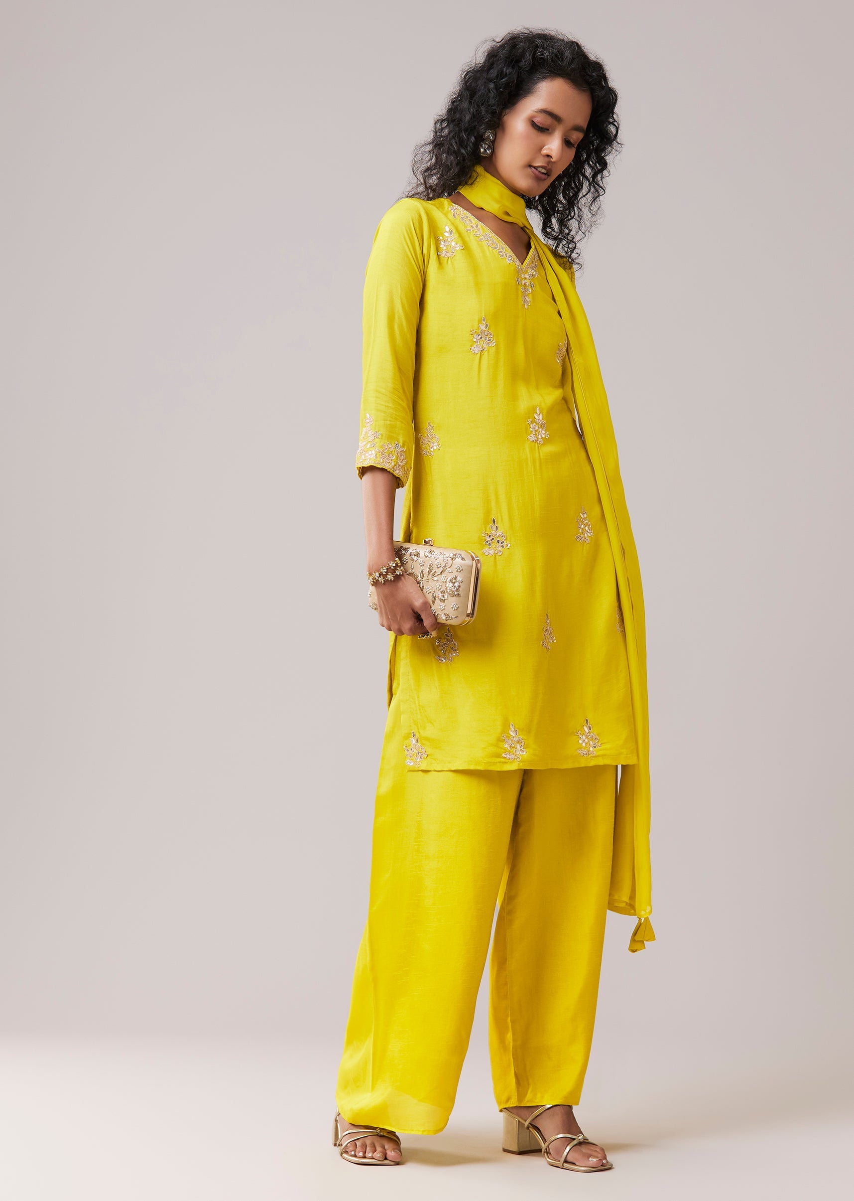 Gracefully crafted with intricate detailing, this silk kurta set brings together classic elegance and festive artistry. The gotta and zardosi embroidery adds depth and a soft celebratory glow, enhancing the... More Product Details
