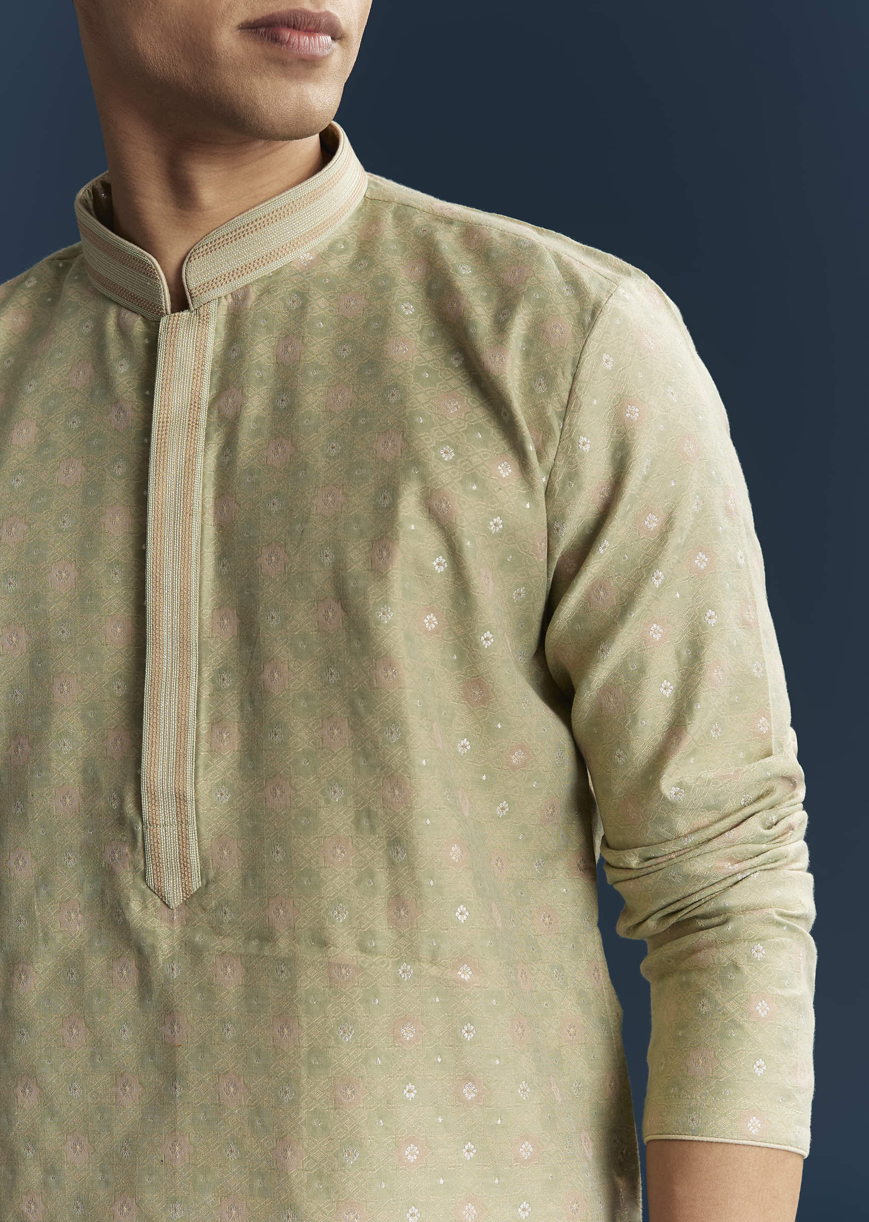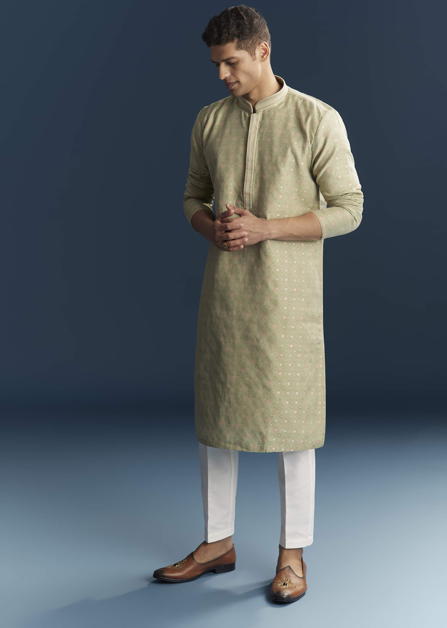 Daylight flatters instantly when you step out wearing this lime green jacquard silk men’s kurta. Jacquard texture adds a crisp lift that reads fresh in every frame. You feel easygoing and upbeat, ready for relaxed rituals and casual celebrations. Awarded as the Most Trusted Brand, we're delivering styles you love, just as promised.