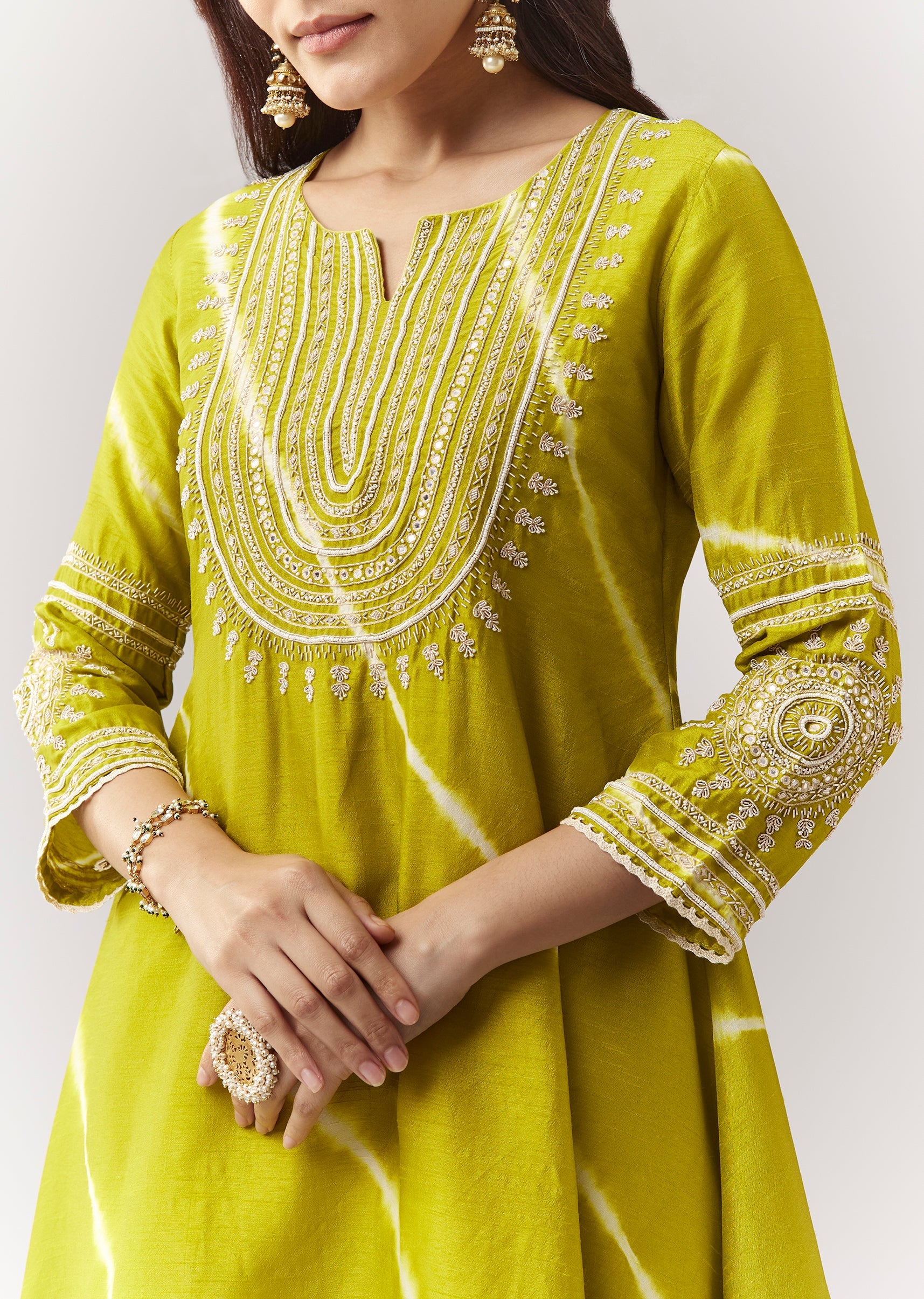 Lime Green Zardosi Kurta Straight Pant Coord With Leheriya Border