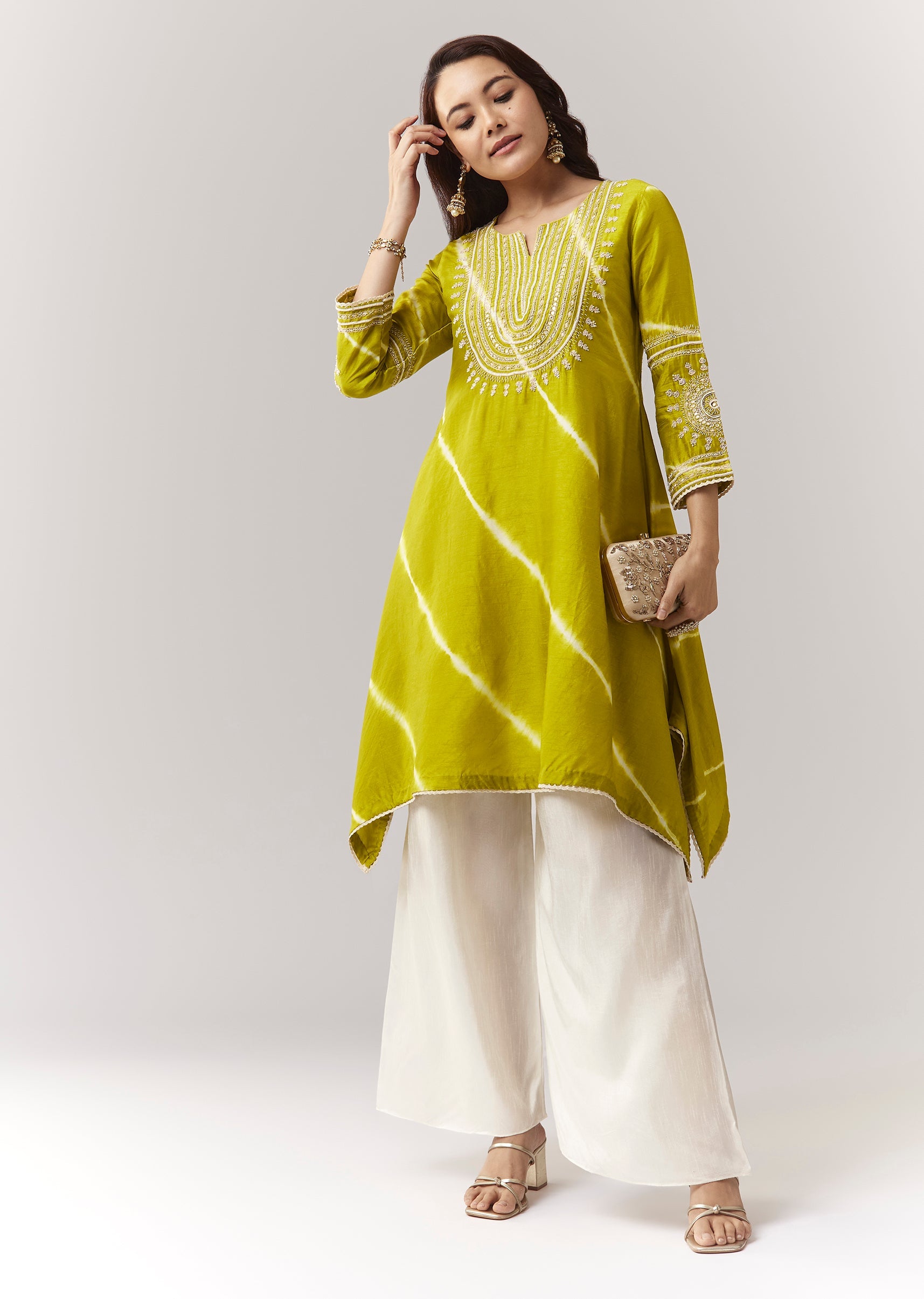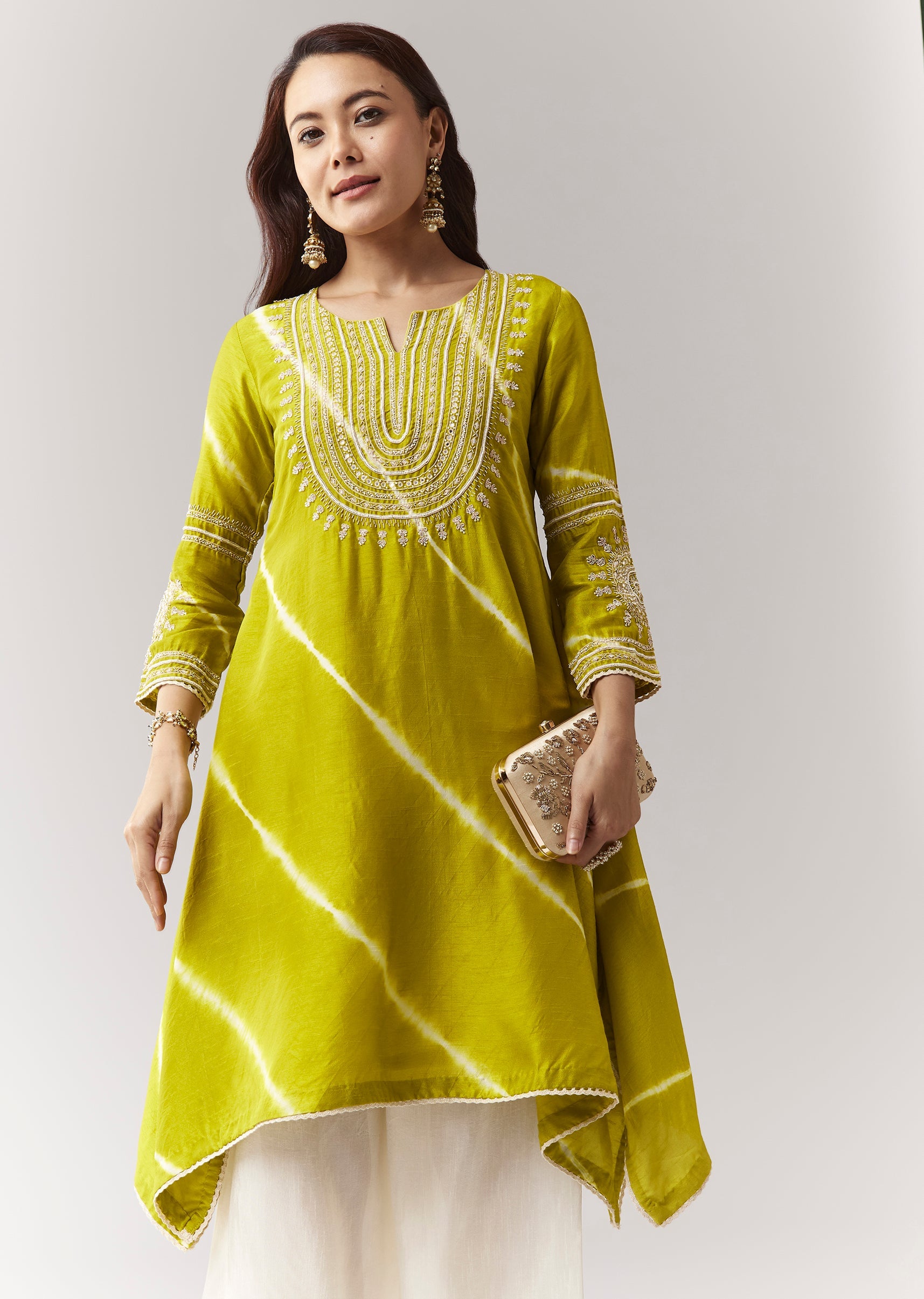 An asymmetric A-line kurta with zardosi work and leheriya border, paired with straight pantsclean festive styling. Awarded as the Most Trusted Brand, we're delivering styles you love, just as promised.