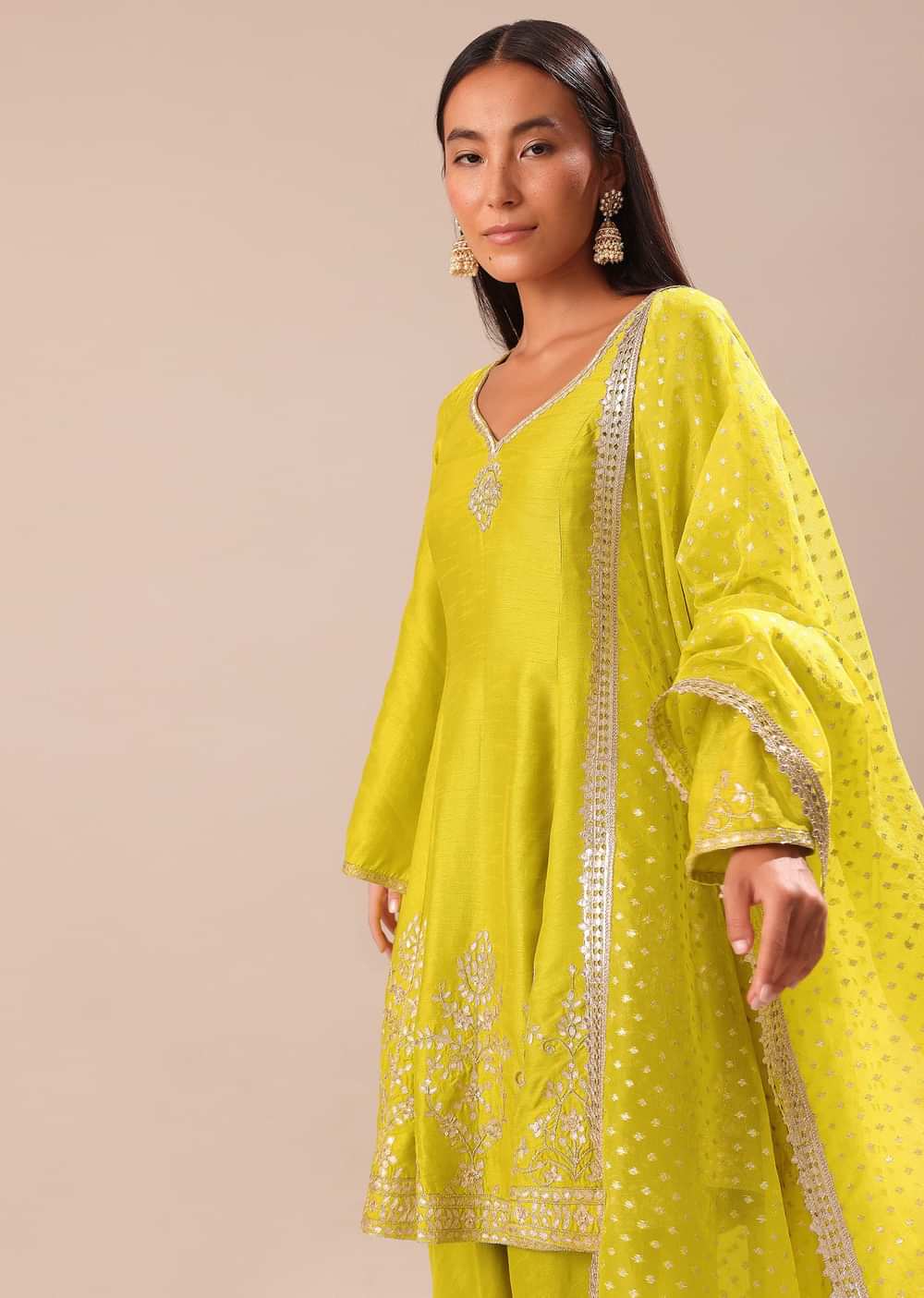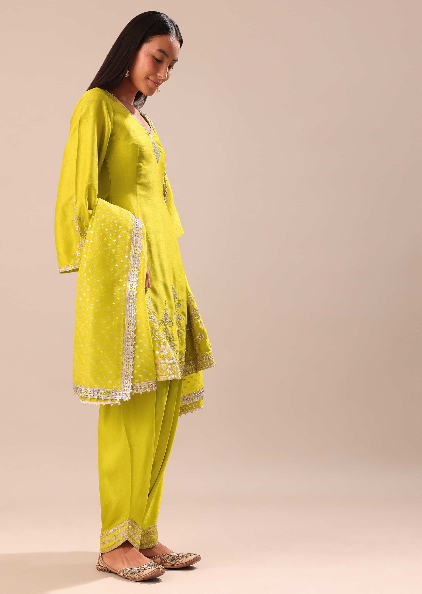 Stand out gloriously in this lime yellow kurta salwar set embellished with aari work and gotta pati embroidery. This outfit is crafted in tussar silk. The kurta comes with a... More Product Details