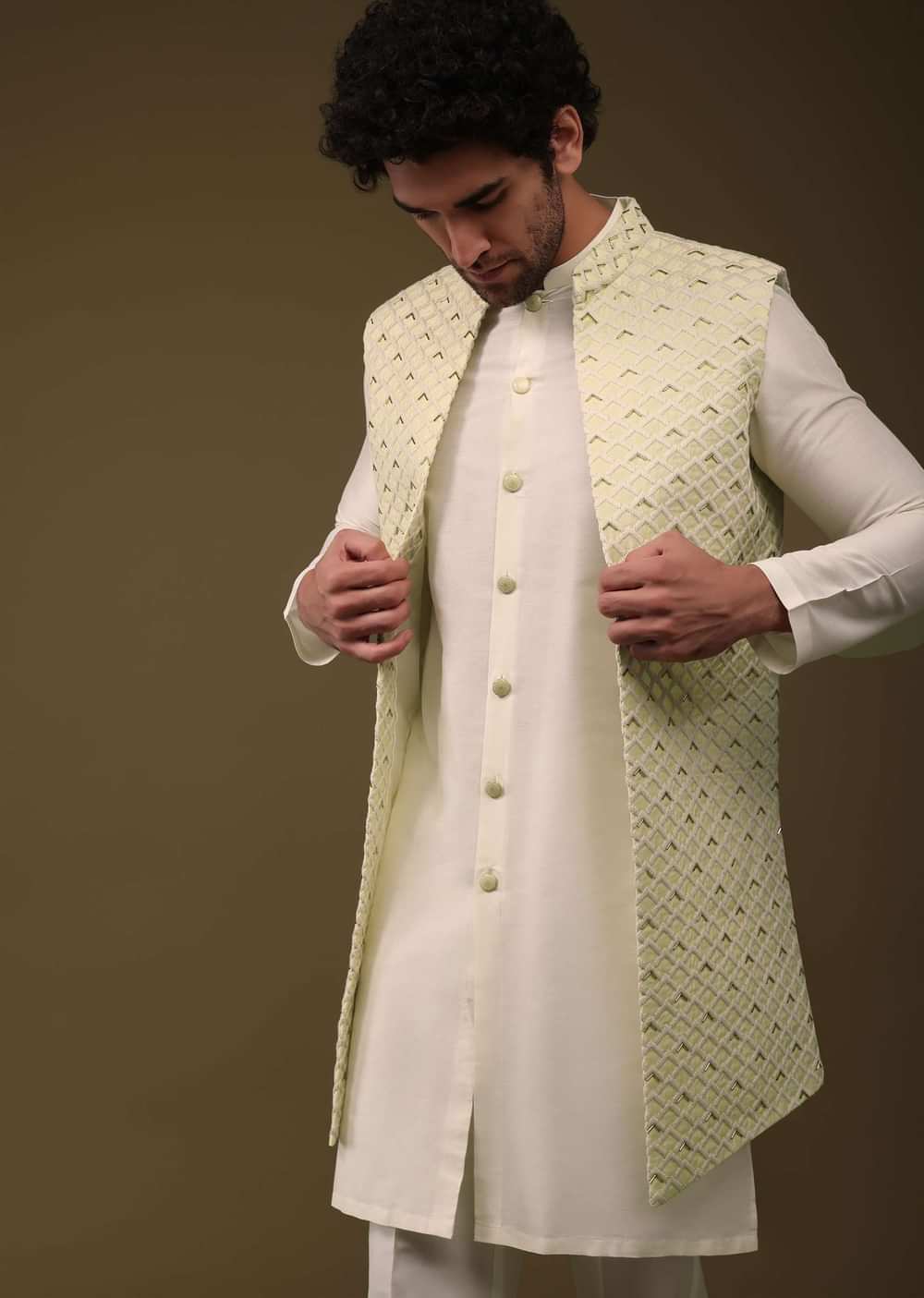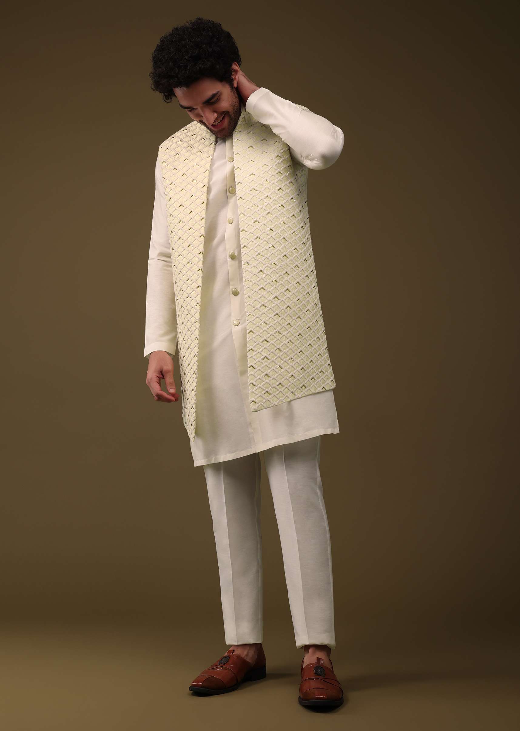 Lime Yellow Festive Textured Jacket Kurta Set With Cut Dana And Thread Embroidery In Art Silk