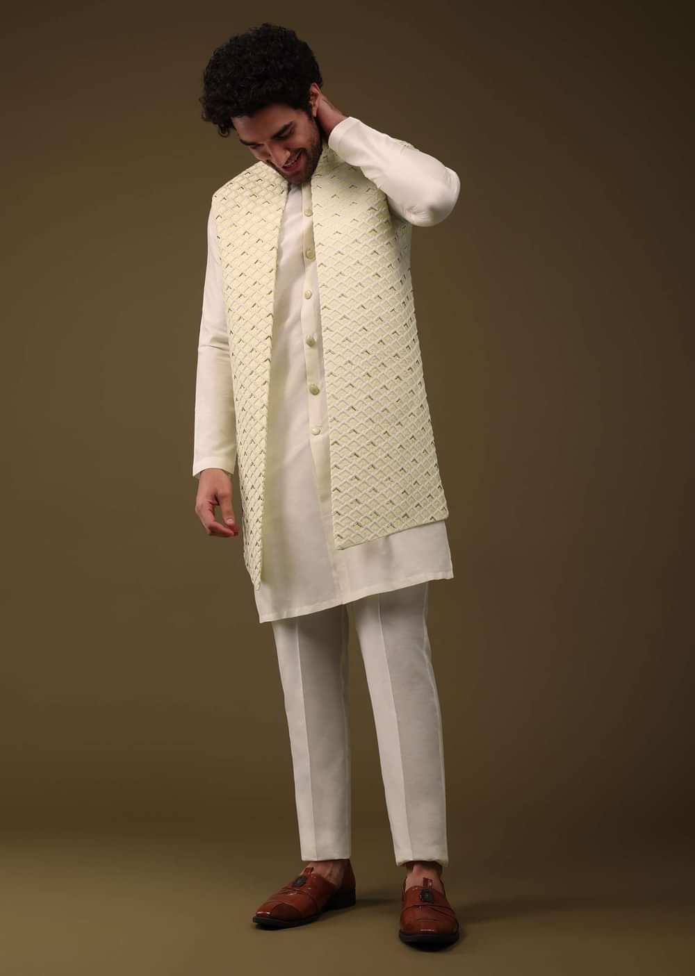 This ensemble consists of a long jacket, a kurta, and a pair of trousers, made in high-quality comfortable fabrics. The textured jacket has a mandarin collar neckline, threadwork and cut-dana... More Product Details