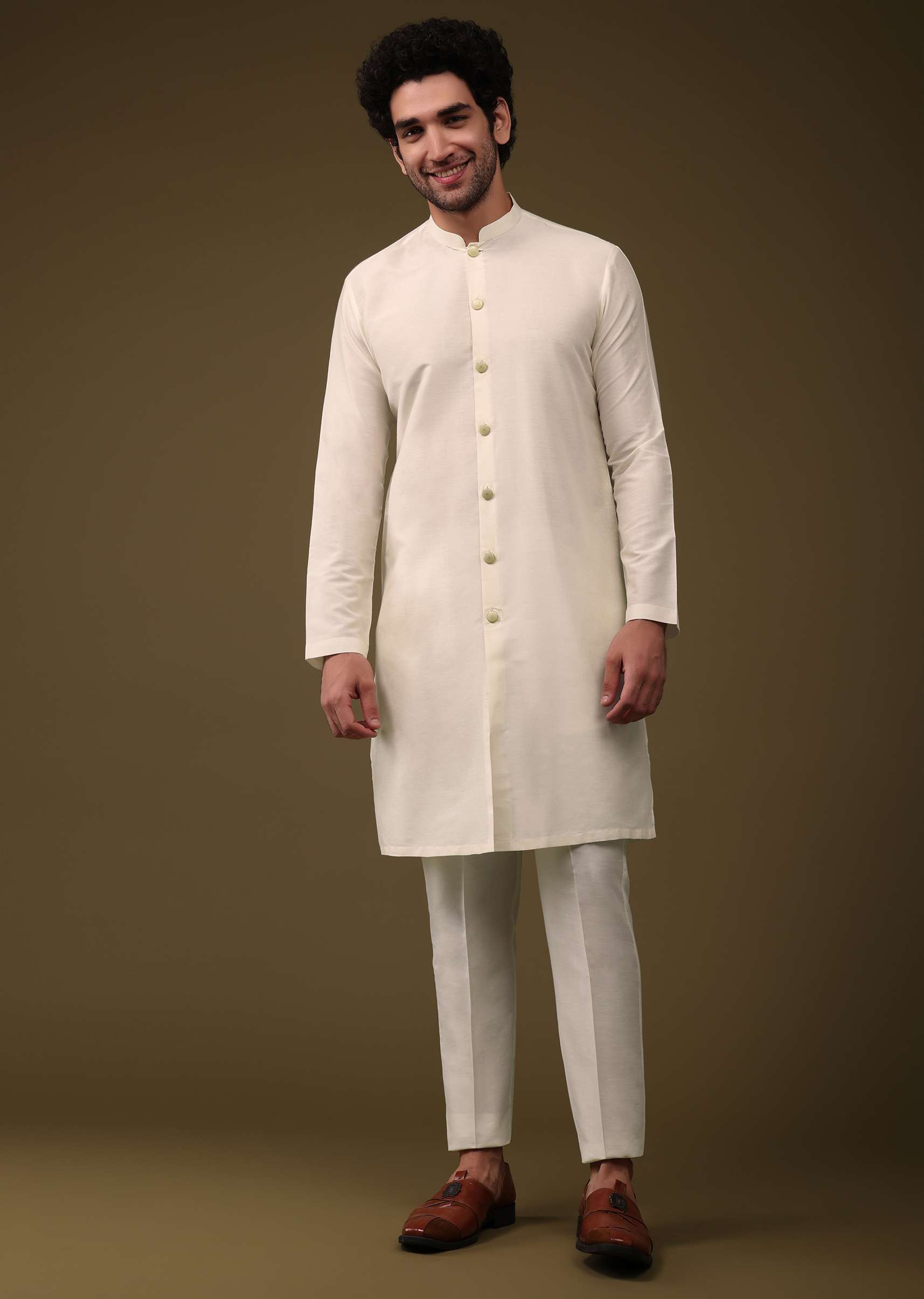This ensemble consists of a long jacket, a kurta, and a pair of trousers, made in high-quality comfortable fabrics. The textured jacket has a mandarin collar neckline, threadwork and cut-dana embroidery, cut sleeves, and is paired with cotton aligarhi pants that add a touch of sophistication. The outfit is an elegant choice for special occasions such as WEDDING. Awarded as the Most Trusted Brand, we're delivering styles you love, just as promised.