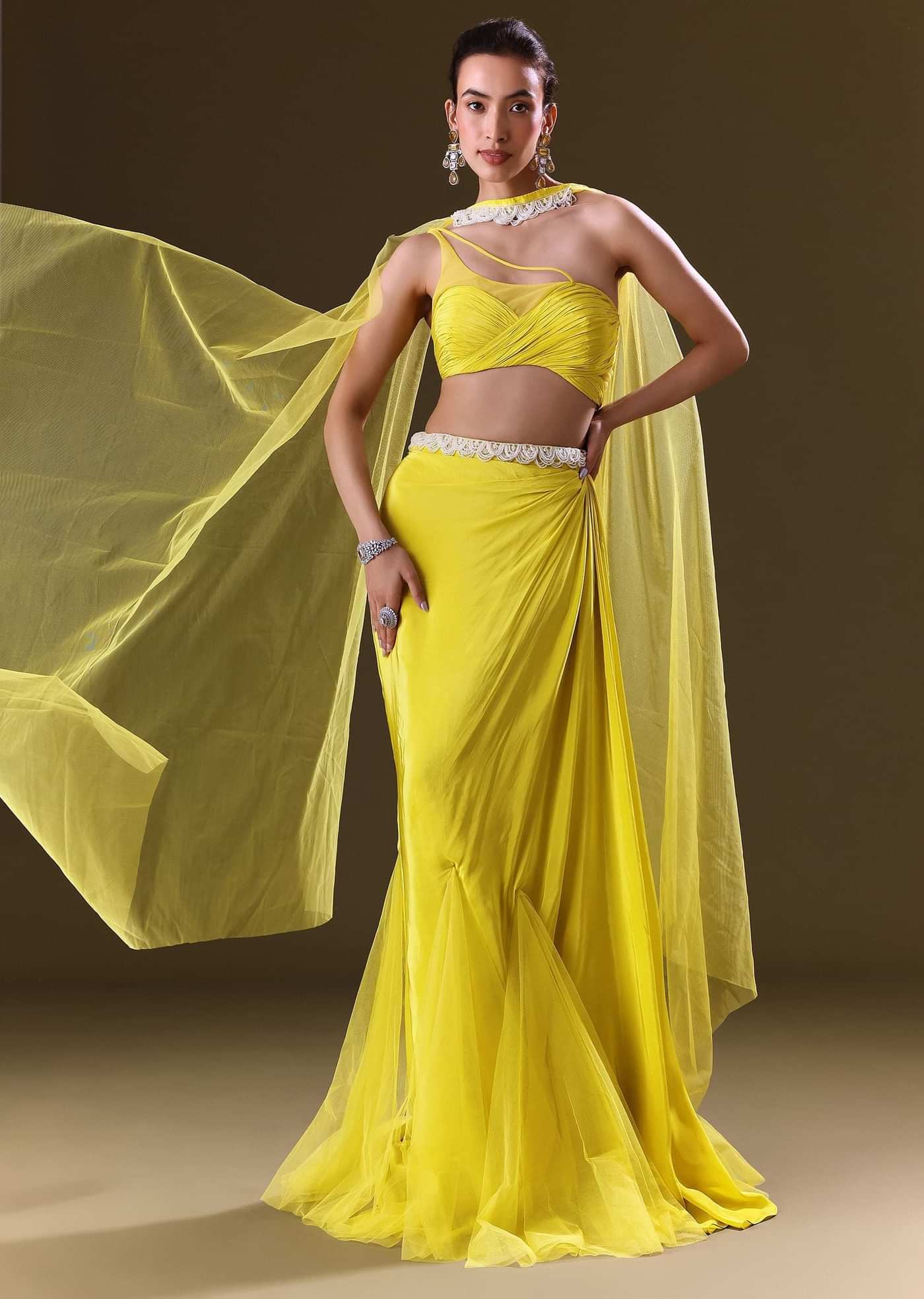 Lime Yellow Fishcut Skirt With One Shoulder Blouse And Tasseled Belt