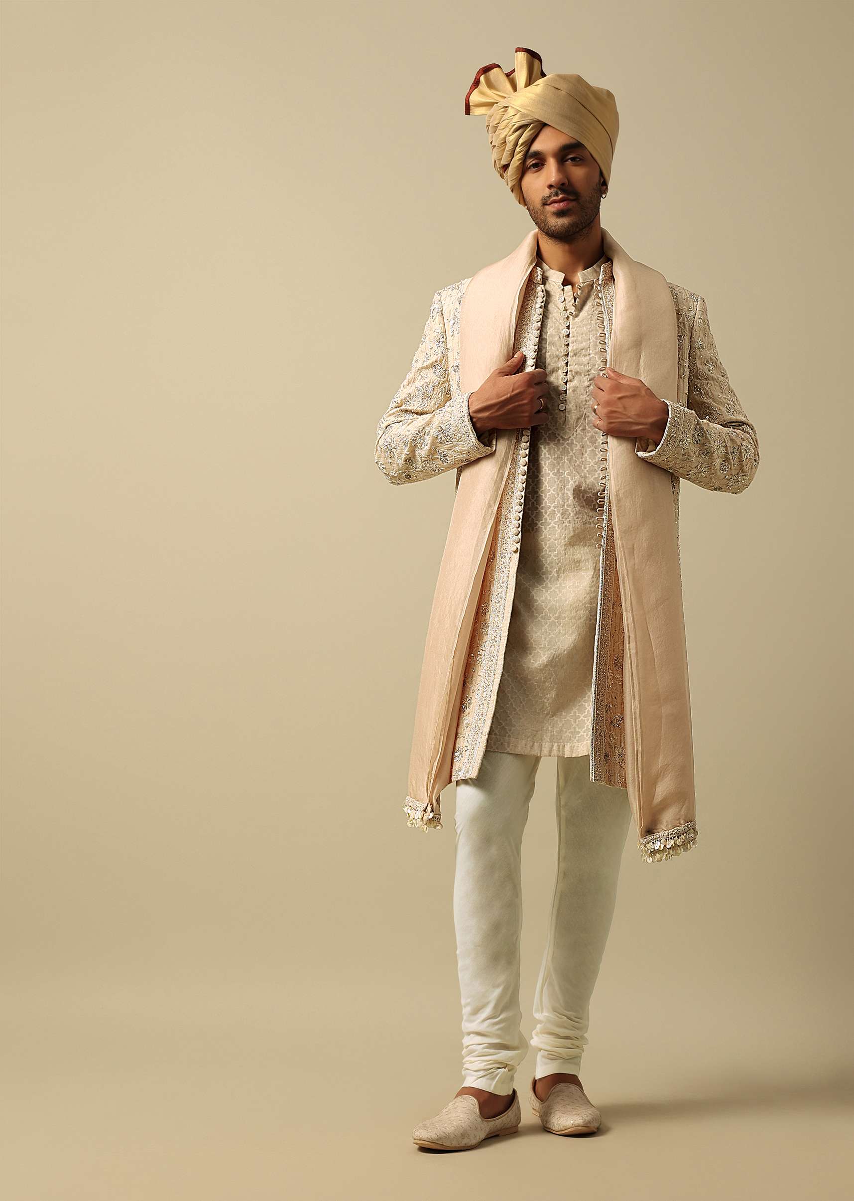 Elevate your wedding style with our luxurious Beige Silk Sherwani. It features heavy embroidery work on the jacket for a regal touch. Crafted from Monga Silk fabrics, this ensemble embodies... More Product Details